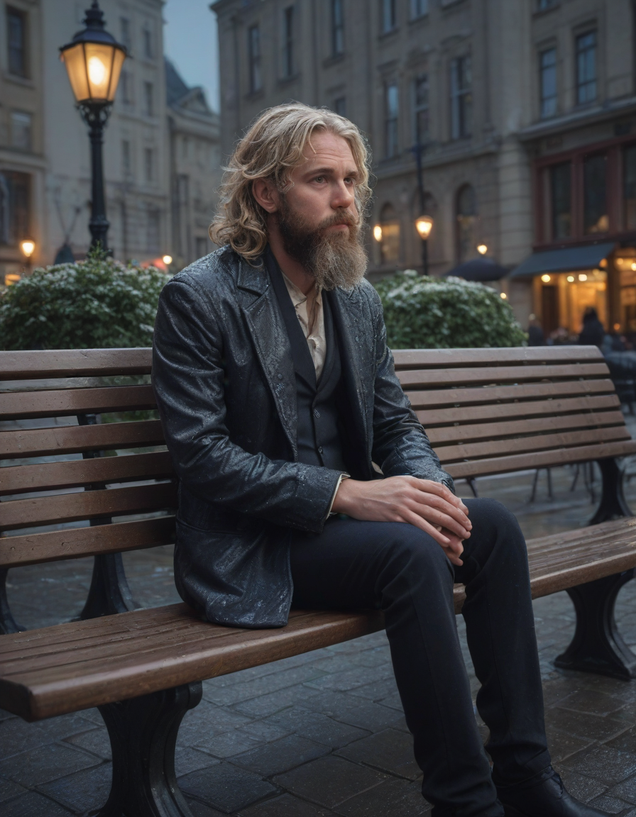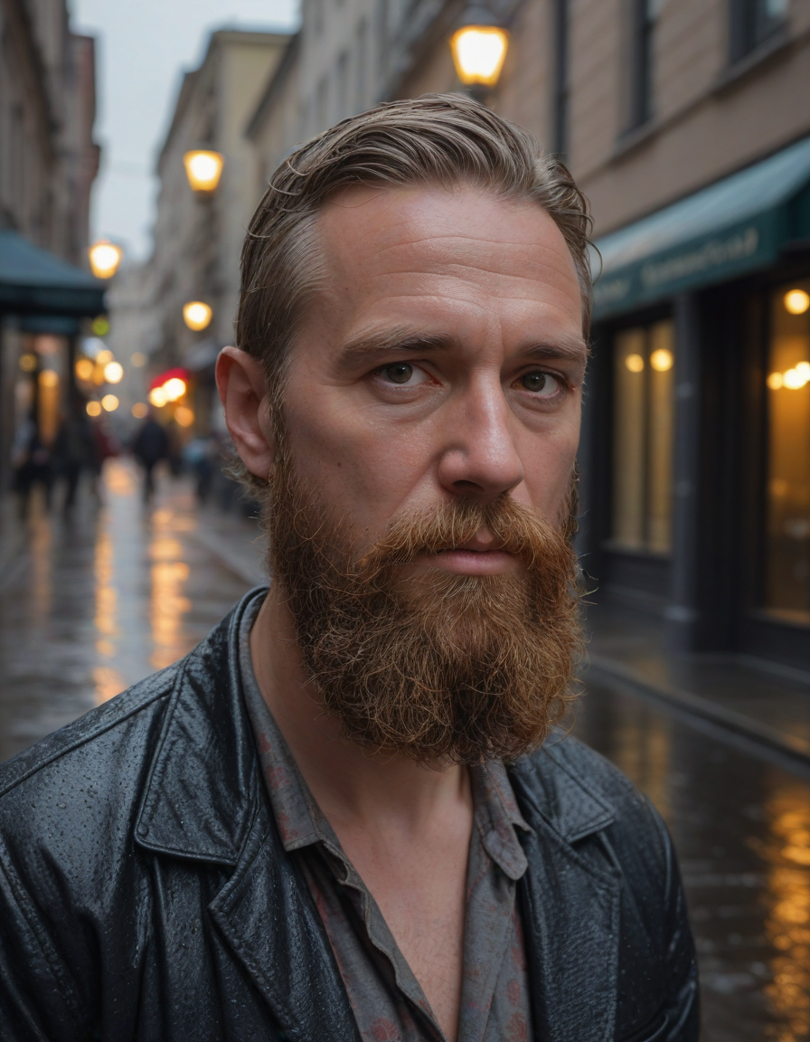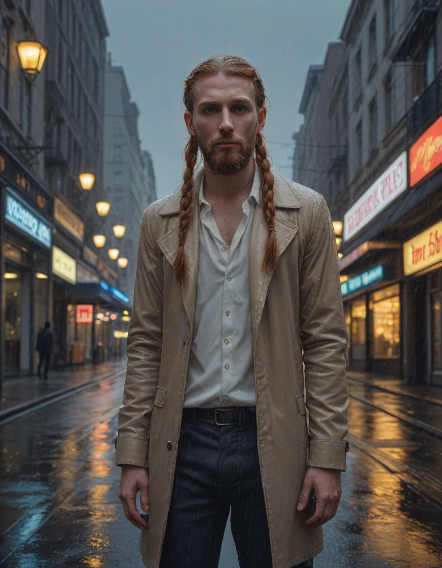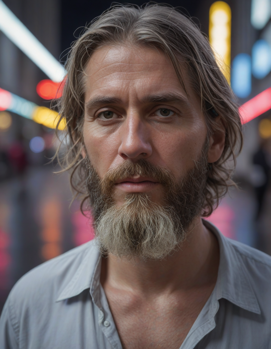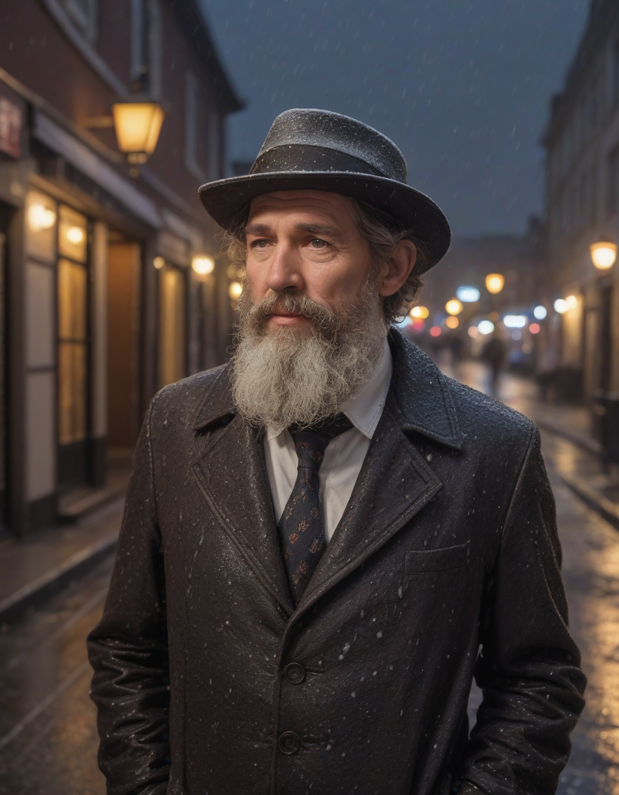snowman, pouting, soulful, baroque, a man with a wild, unkempt beard, shimmering aura, Rain-streaked pavement, neon lights reflecting
