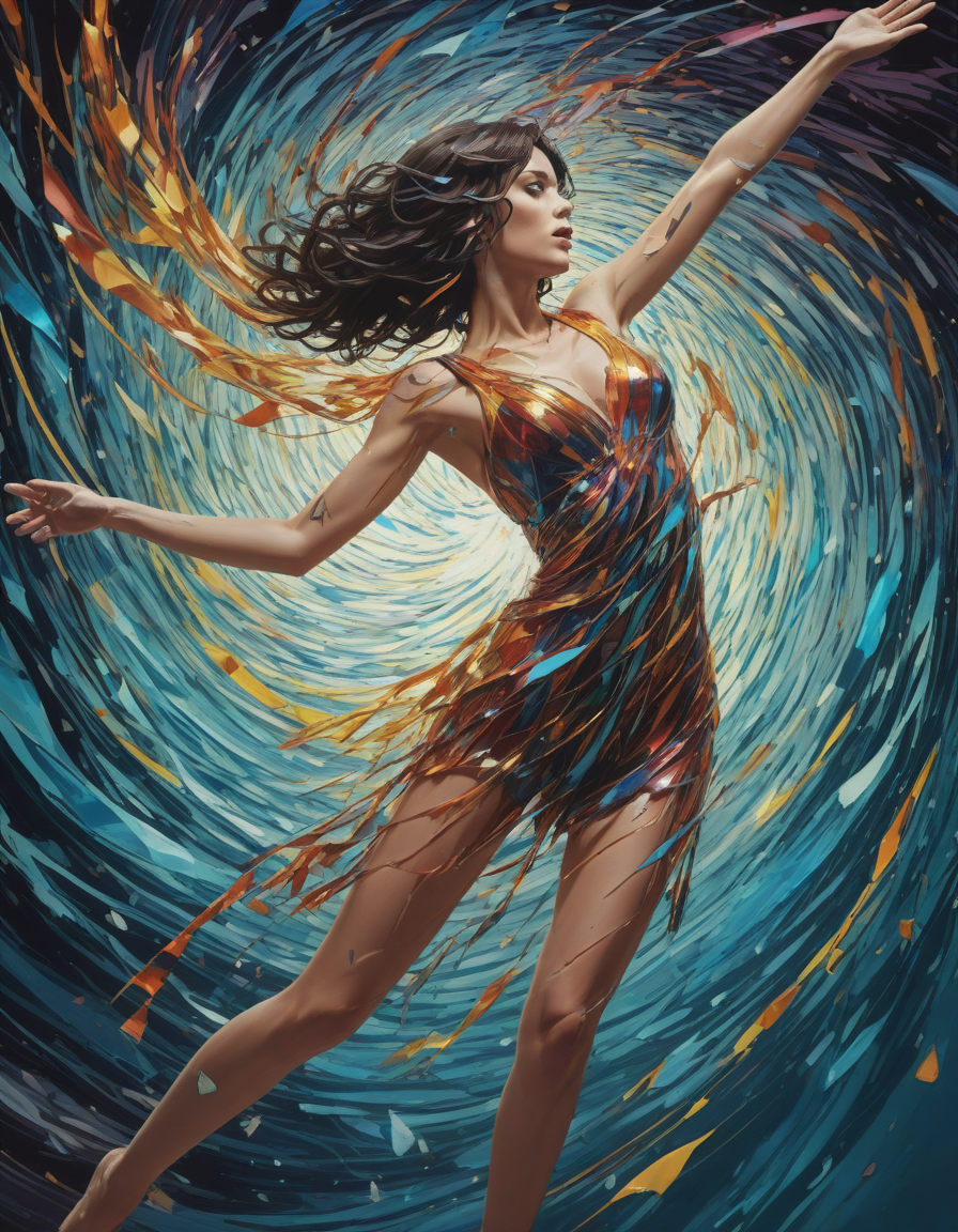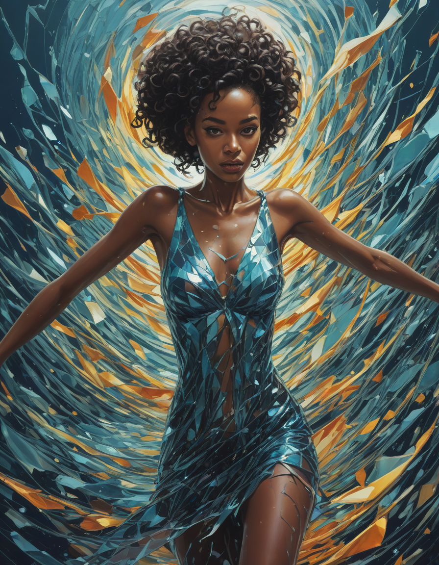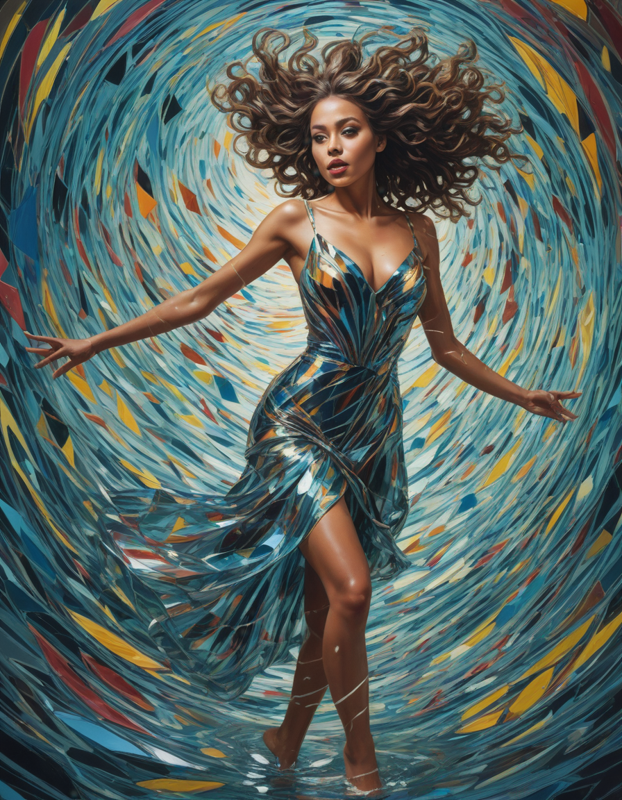 pop art, Shattered glass reflecting vibrant hues, dances in an ethereal swirl, A person made of shimmering water, exaggerated, caricatured comic style