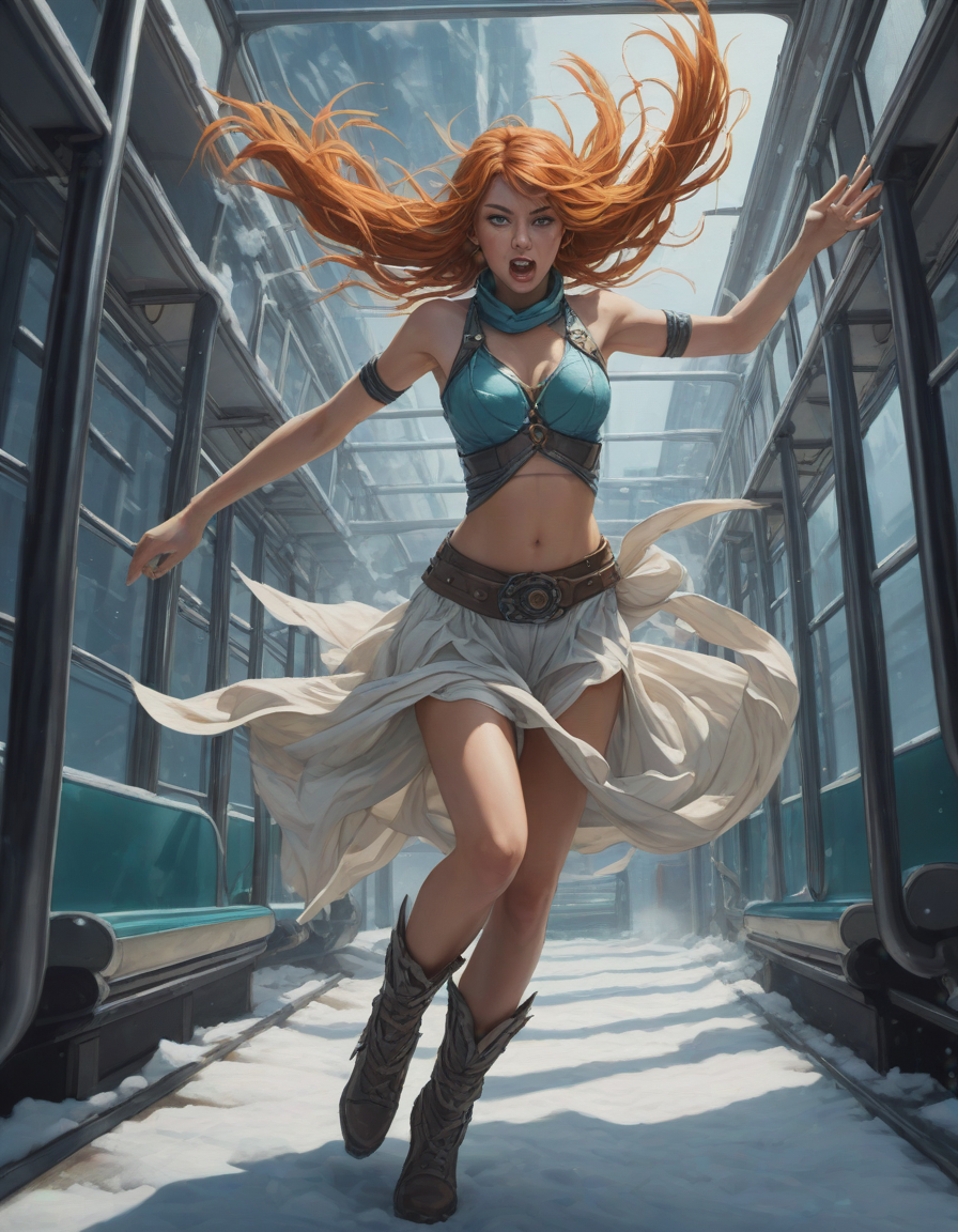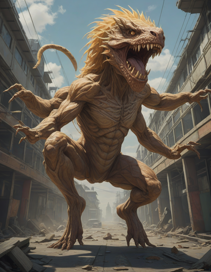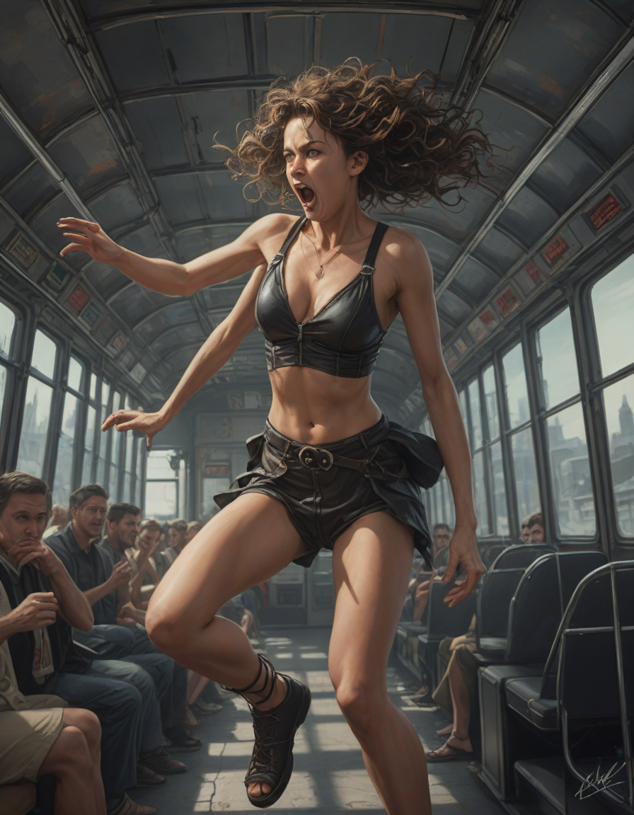 arcana character, Swift, agile movements of a dancer in perfect harmony, on the bus, Giant monster roaring in fury, on an insane power trip