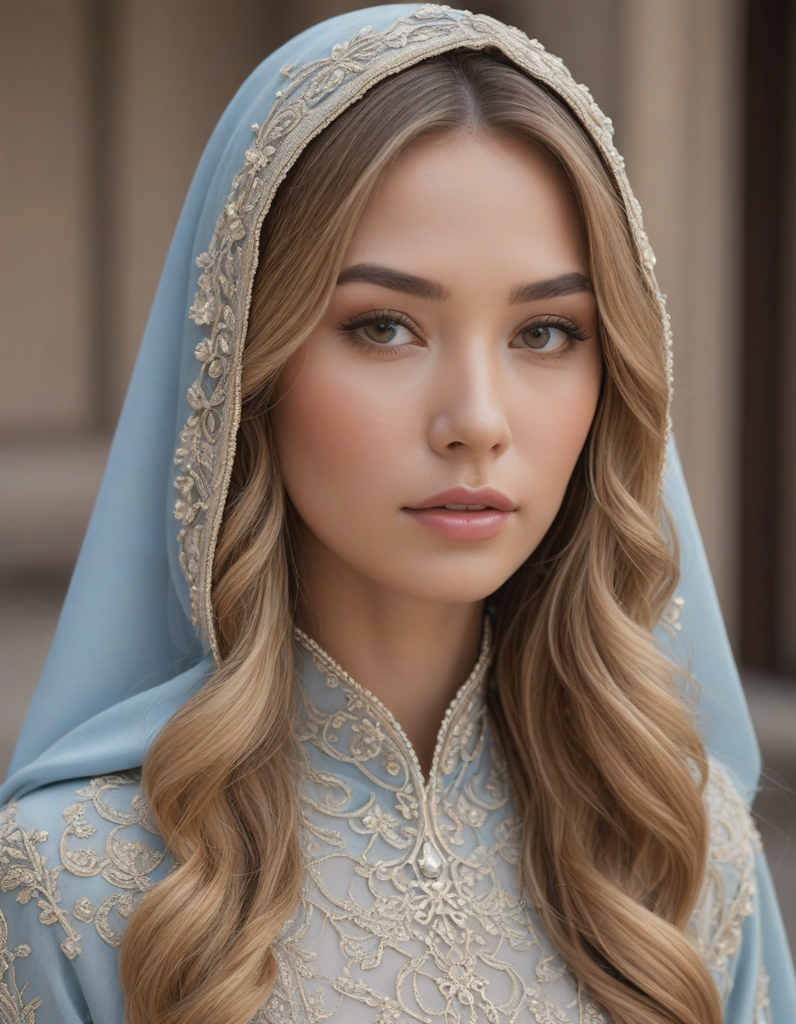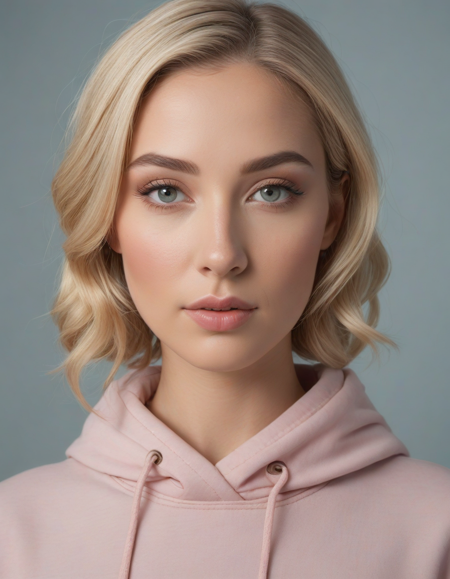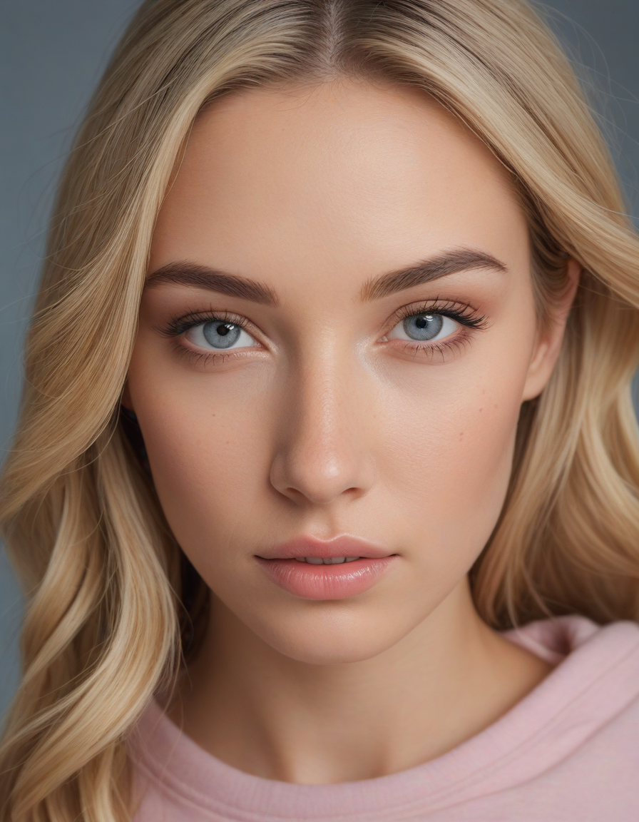 oval face shape, almond-shaped eyes, voluminous lashes, slightly arched eyebrows, narrow nasal bridge, rounded nose tip, symmetrical nostrils, full lips, pronounced cupid's bow, slightly fuller lower lip, defined cheekbones, rounded chin, smooth complexion, softly contoured jawline, balanced facial proportions, symmetrical features, gently curved eyelids, soft brow ridge, harmonious cheek to jawline transition, subtle philtrum, delicate ear lobes, straight blonde hair, clear skin, hooded eyelids, light pink lip color, slightly pouty expression, casual pose with hand on face, slight head tilt, indoor lighting, Light blue irises, Medium-thickness eyebrows, Softly angled eyebrows, A hint of freckles across the nose and cheeks, Natural makeup, Gentle frown lines between the eyebrows, Soft nasolabial folds, Smooth forehead, Subtle dimple on the chin, Clear facial contour without distinct shadows, Even skin tone with a hint of natural pink undertones, Slightly rosy cheeks, Tapered jawline, Fine hair texture with gentle waves, Youthful appearance with soft facial features, designer vintage wear, symmetrical