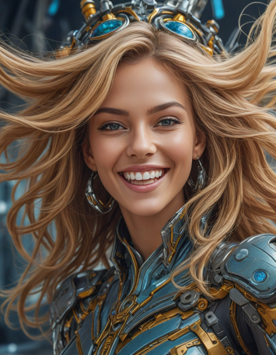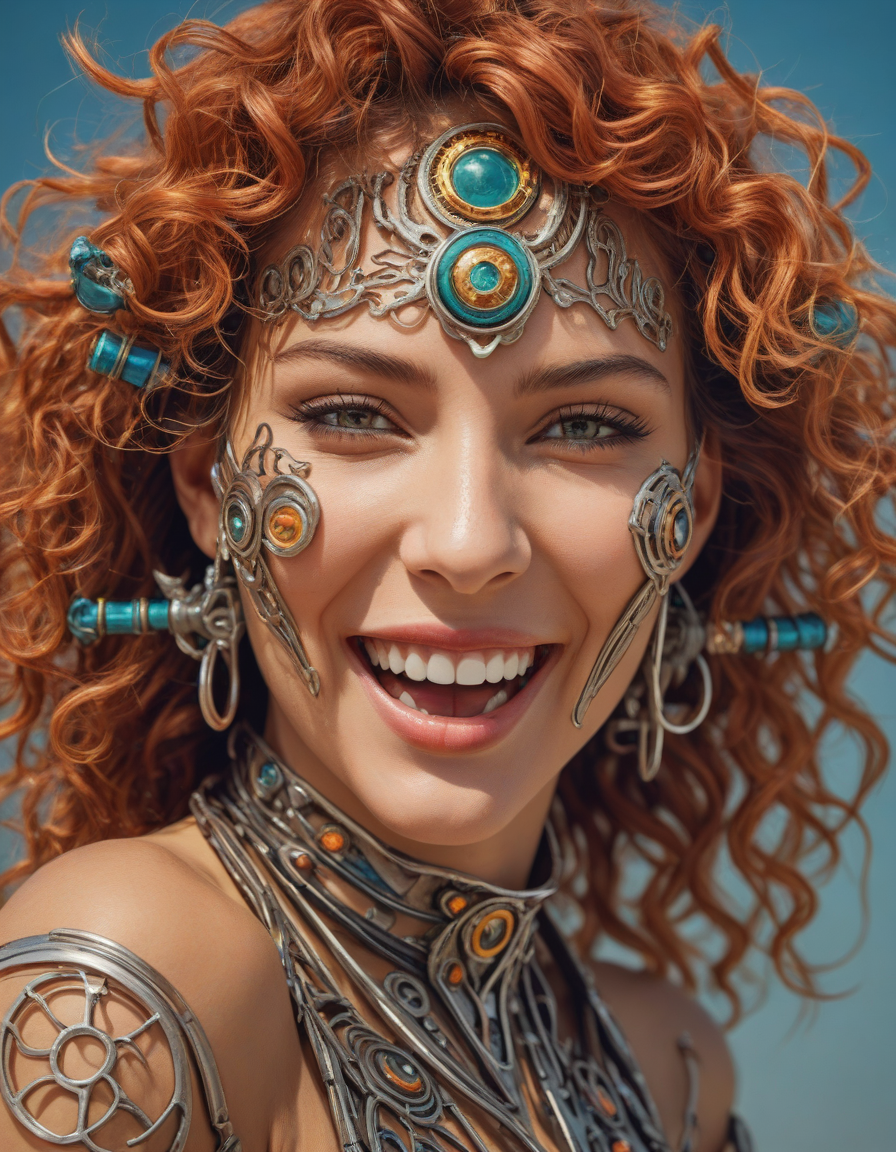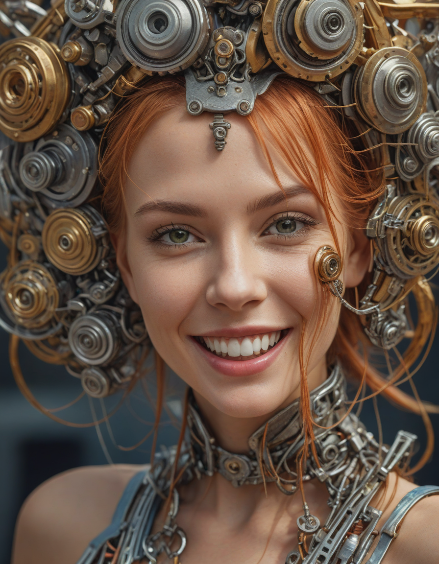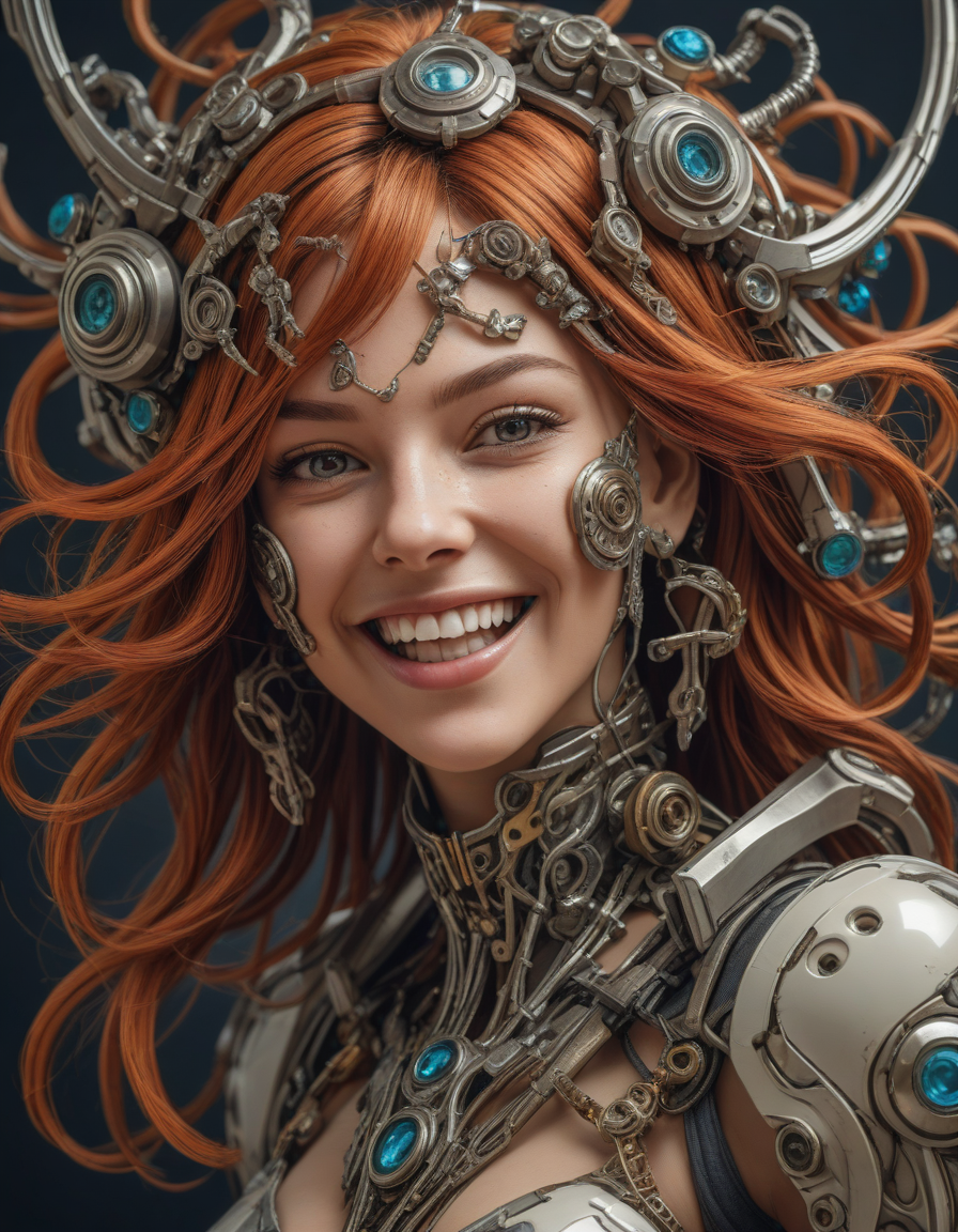 joyful laughing expression, eyes crinkled with mirth, detailed biomechanical elements, futuristic cyborg parts, action, highly stylized, artistic, vibrant, colorful, close-up, macro