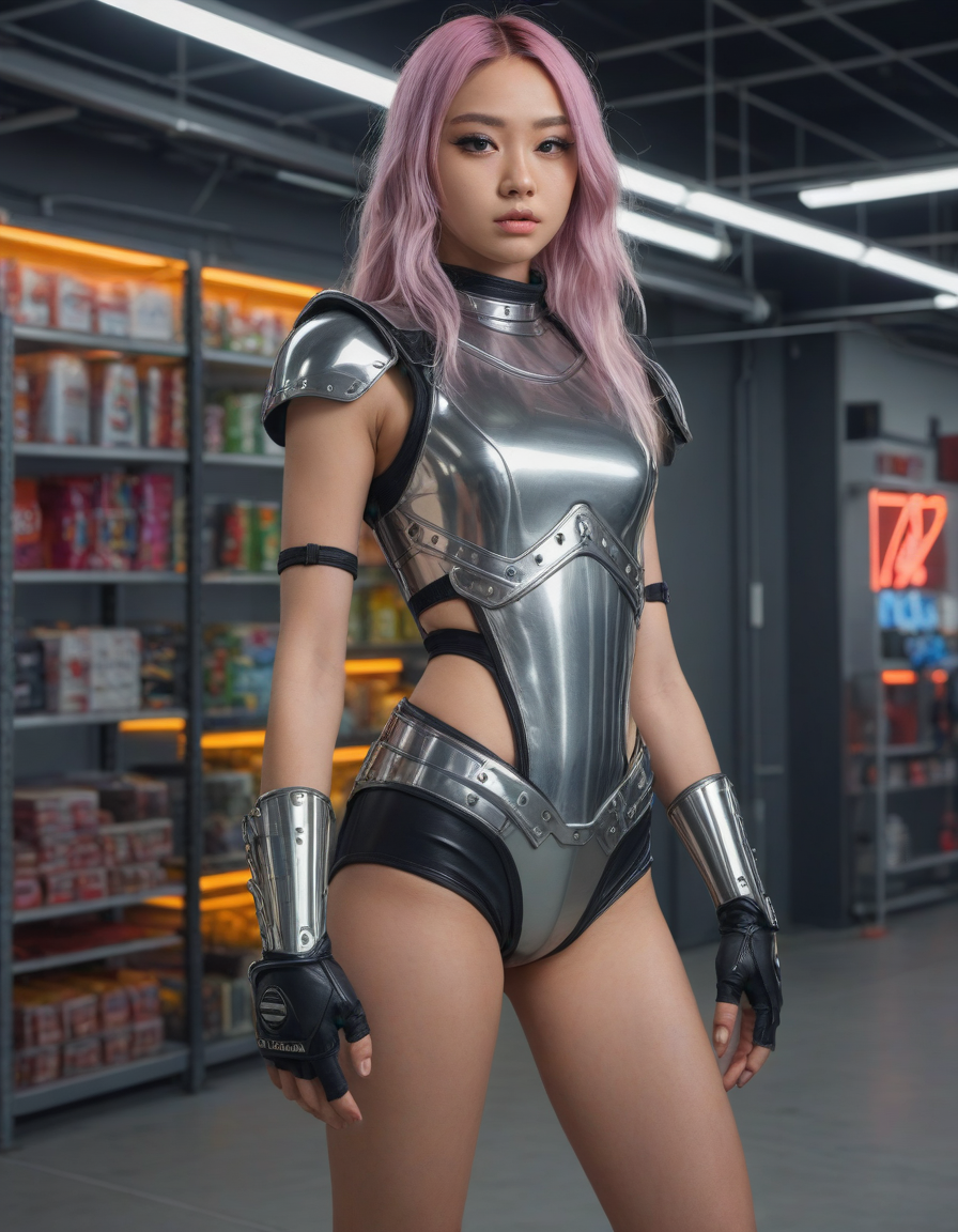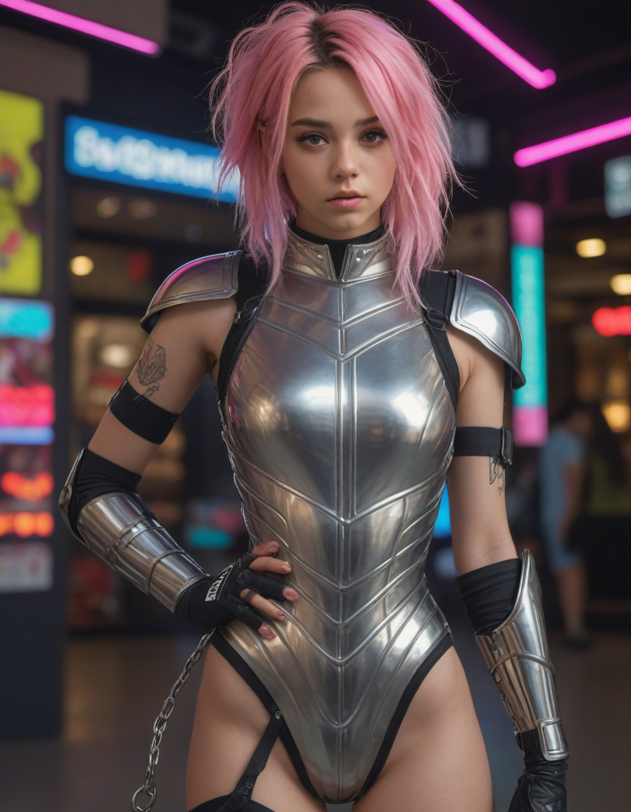 wearing sleeveless leotard, wearing one peice clothing, leotard, sleeveless, , Visualize a photorealistic portrayal of an 18-year-old high school senior girl, epitomizing the e-girl aesthetic with a blend of internet culture's vibrancy and personal audacity. Clad in an oversized striped shirt under a black graphic t-shirt dress, her style is a testament to e-girl fashion's layered intricacy, complemented by fishnet tights and chunky boots. Her makeup features dramatic winged eyeliner, neon eyeshadow, and dark lipstick, with blush bringing her face to life. Accessories like silver chains and a heart pendant choker, along with pastel or neon hair streaks, enhance her playful rebellion. Standing hands-on-hips, she exudes confidence and individuality against a backdrop suggestive of e-girl life, with neon signs and string lights. This scene captures her bold identity and expressive spirit at this pivotal moment., wearing complete set of armor, wearing full armor, Wearing chest armor, wearing leg armor, wearing feet armor, wearing bracer, wearing pauldrons, Wearing helmet, Wearing breastplate, Wearing gauntlets, Wearing greaves, Wearing pauldrons, Wearing vambraces, Wearing cuisses, Wearing sabatons, Wearing gorget, Wearing tassets, Wearing bracers, Wearing cuirass, Wearing faulds, Wearing plackart, Wearing spaulders, Wearing besagews