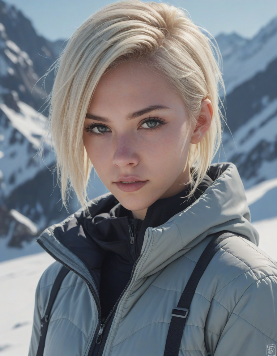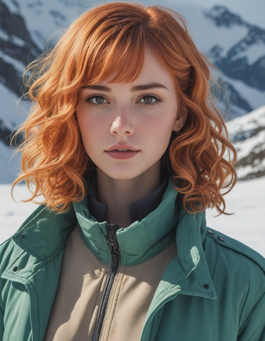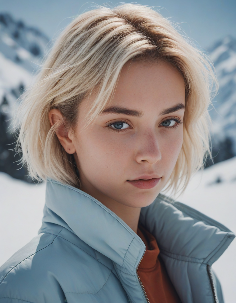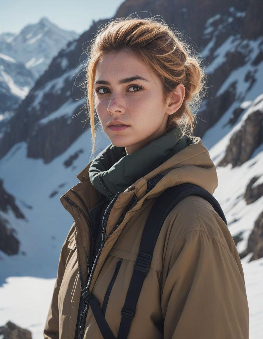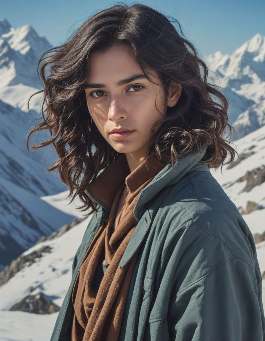 90s anime, instagram, furrowed brow, lone wanderer, Glistening icy slopes