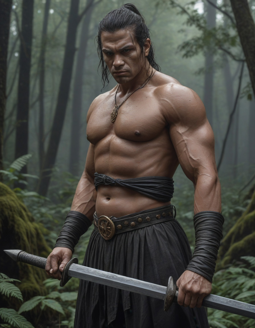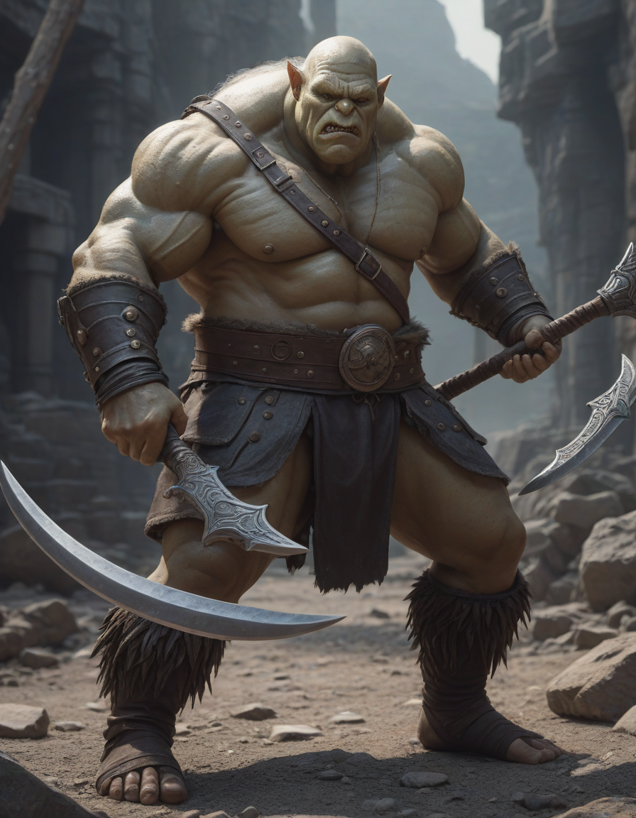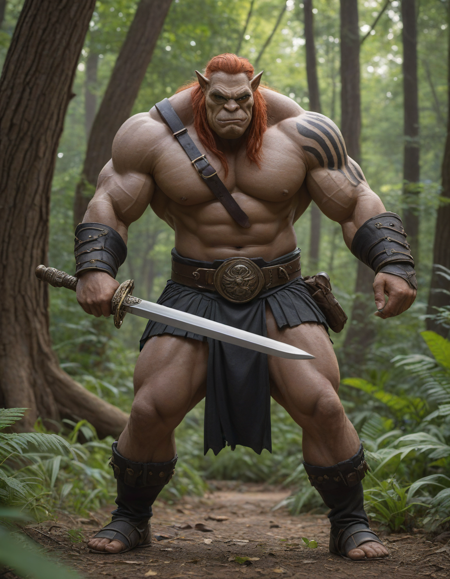 ogre, weilding a one-handed weapon in both hands, one-handed weapon, weapon, , Holding a sword in both hands in a confident pose, detailed grip, detailed fuller, detailed pommel, detailed blade, detailed edge, , speechless in awe, attractive, soulful, earrings, wearing all black