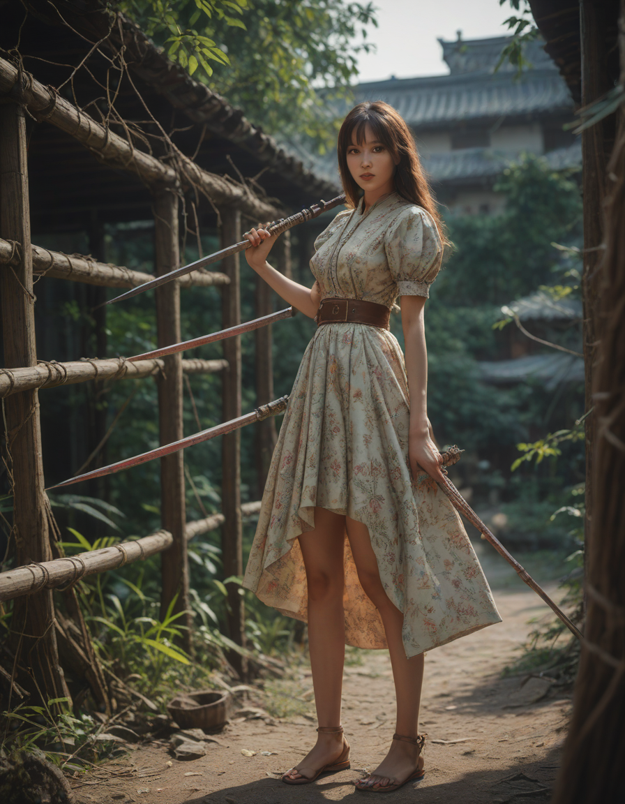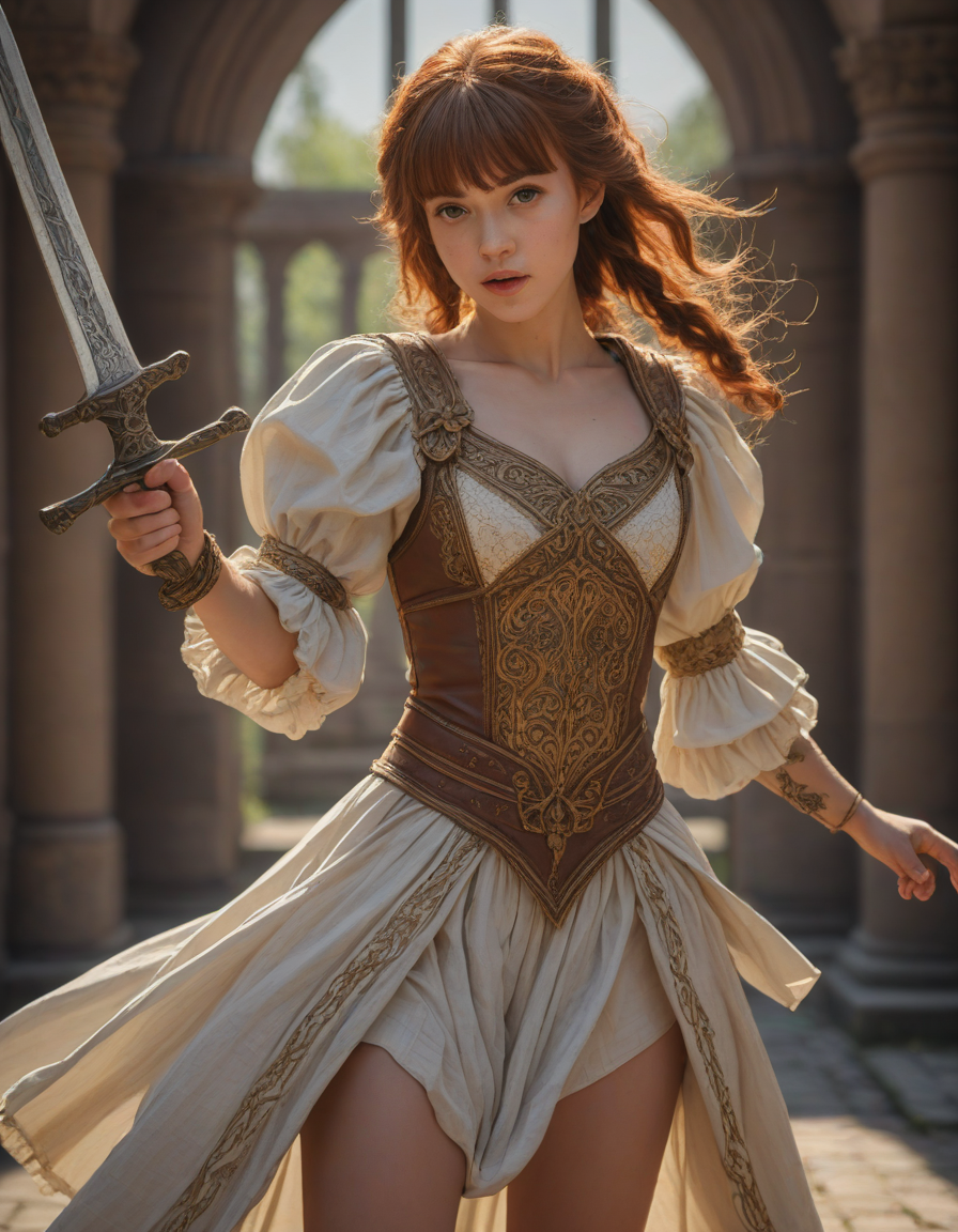 kicking, voxels, outstretched hand, Projected, holding a sword, long hair, Passionate, Brocade dress, mouth opened