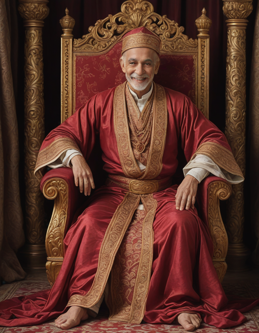 Warmly Welcoming, elegantly draped rich crinkled robes swirling gracefully, celestial, playful grin