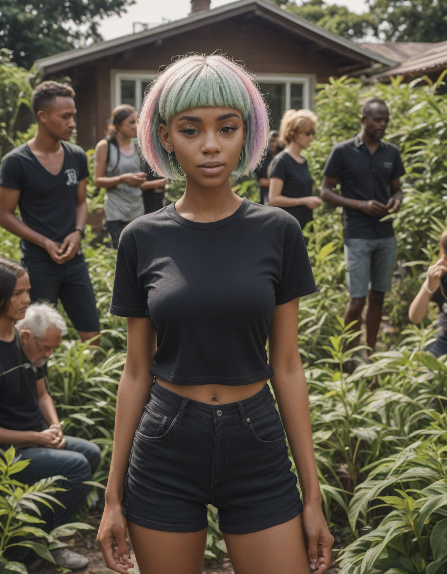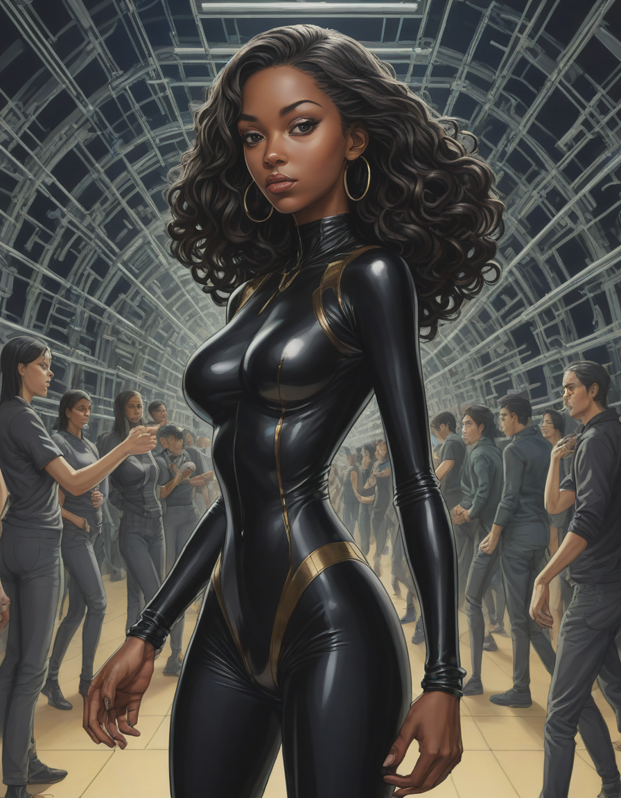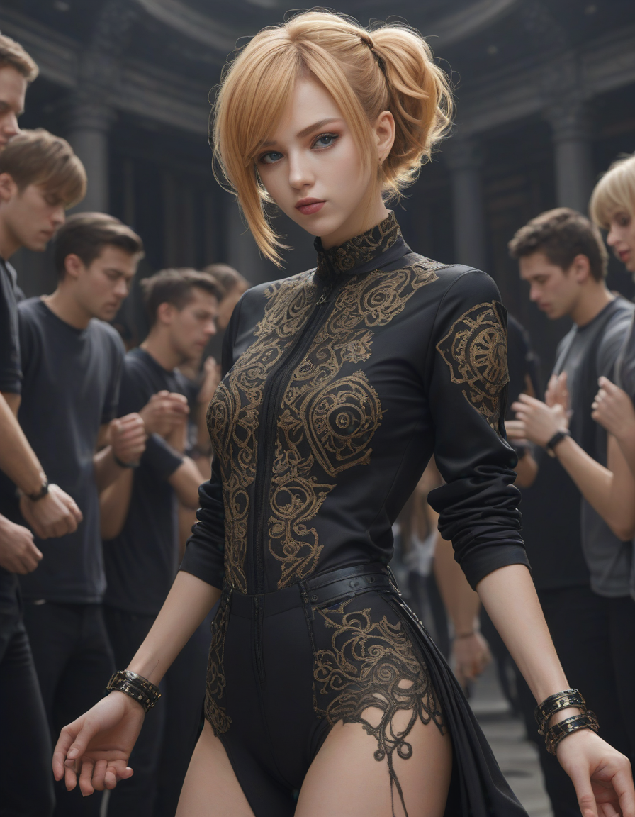 Smug anime character, optical illusion dancing glyphs, complex, wearing all black, surrounded by people