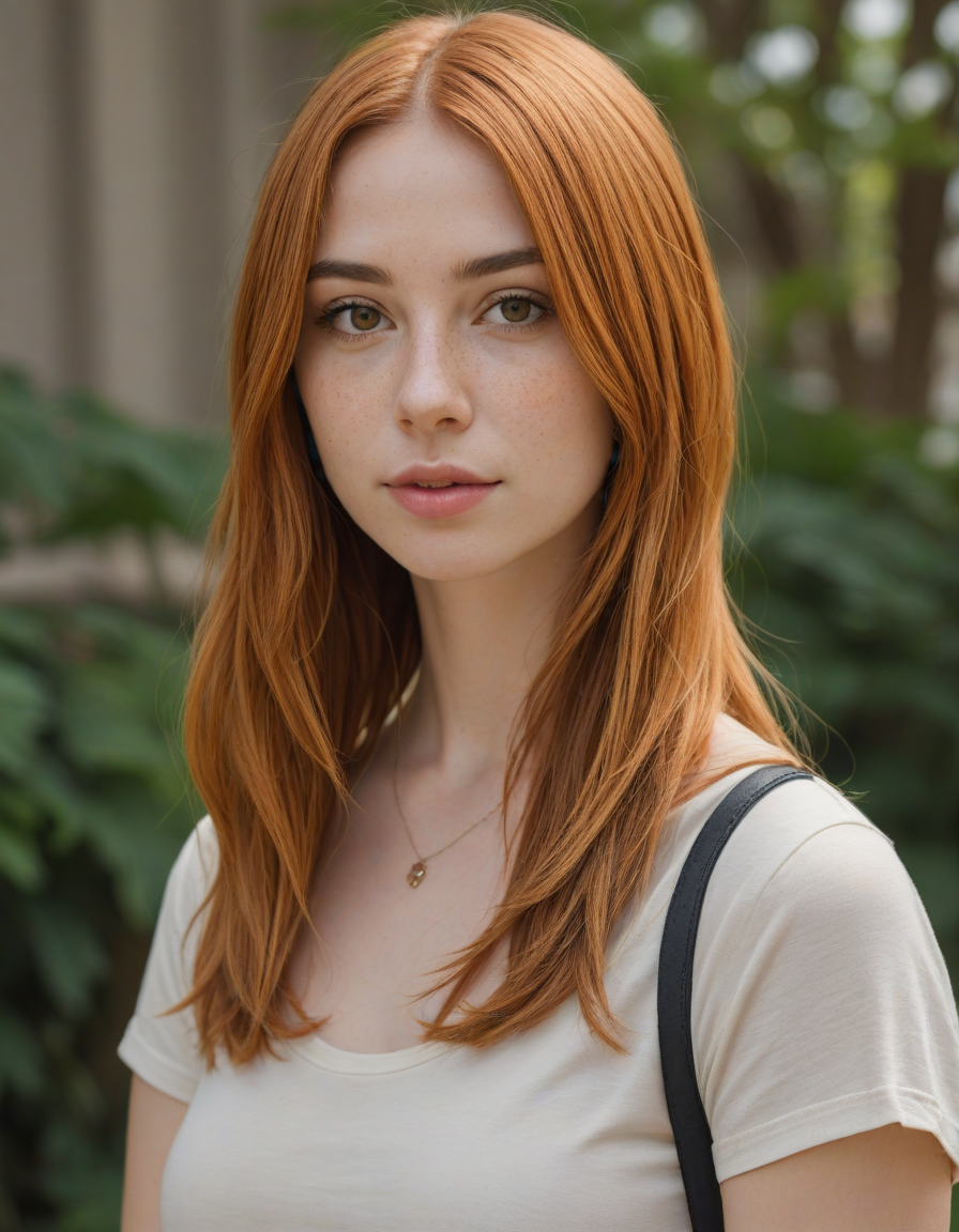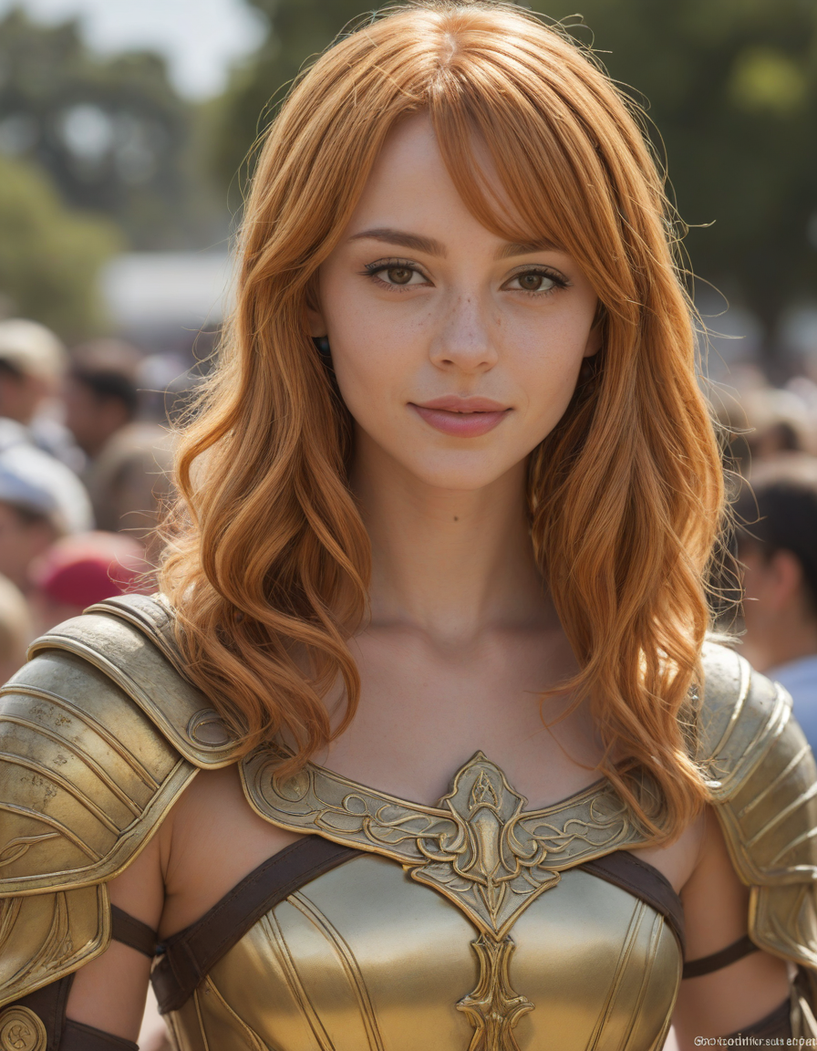 Sofia from Australia, medium shoulder-length ginger parted in the side with blond streaks, brown eyes, curved nose, thick lips, dimples, perfect teeth, teasing look, freckles, cosplay outfit, fit, Eyes glint with mischief