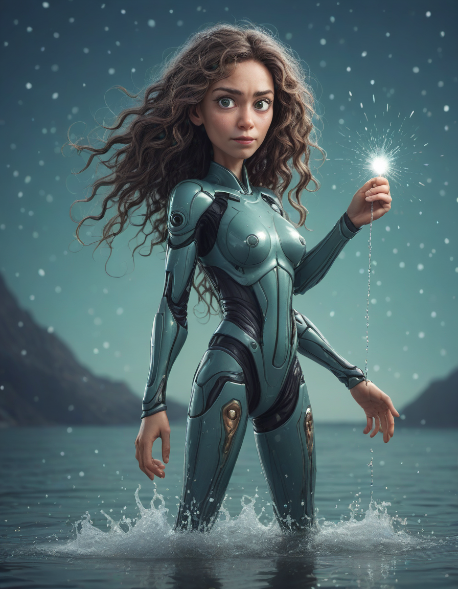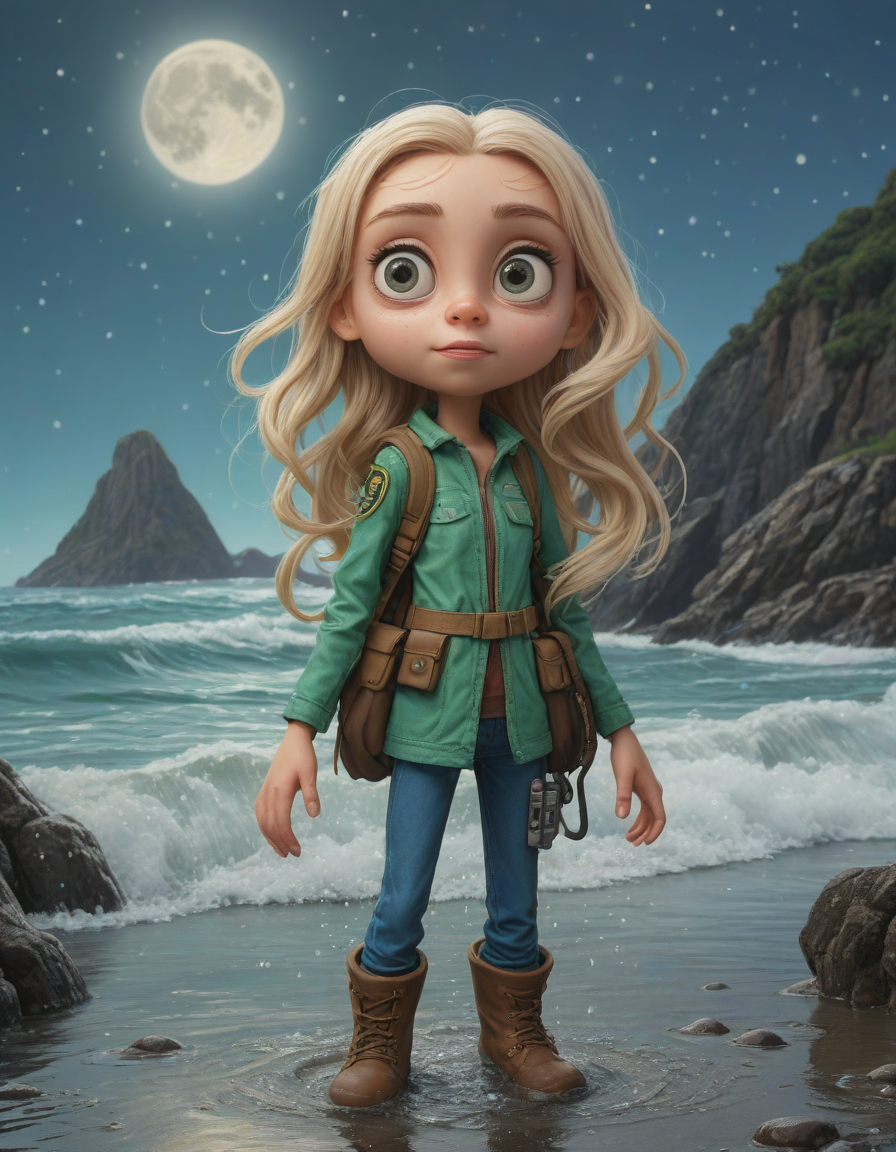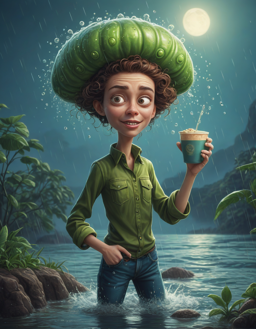 A humorous cartoon character with an exaggerated expression, instagram, action hero, sparkling sea spray, alien, soggy, Serene moonlight