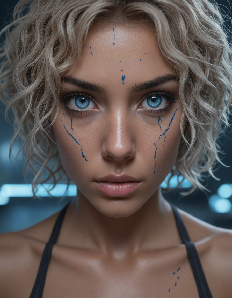 Rock-hard abs glistening, gloomy, downcast face, Love, swirling, blue-iris-color, blue-eye-color, highly detailed eyes, highly detailed iris, realistic iris detail, highly detailed sclera, highly detailed pupil, highly detailed limbal ring, , vibrant dream