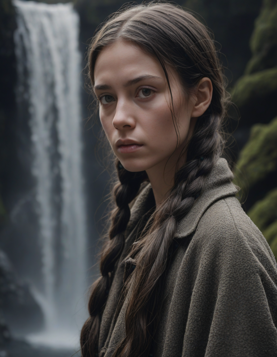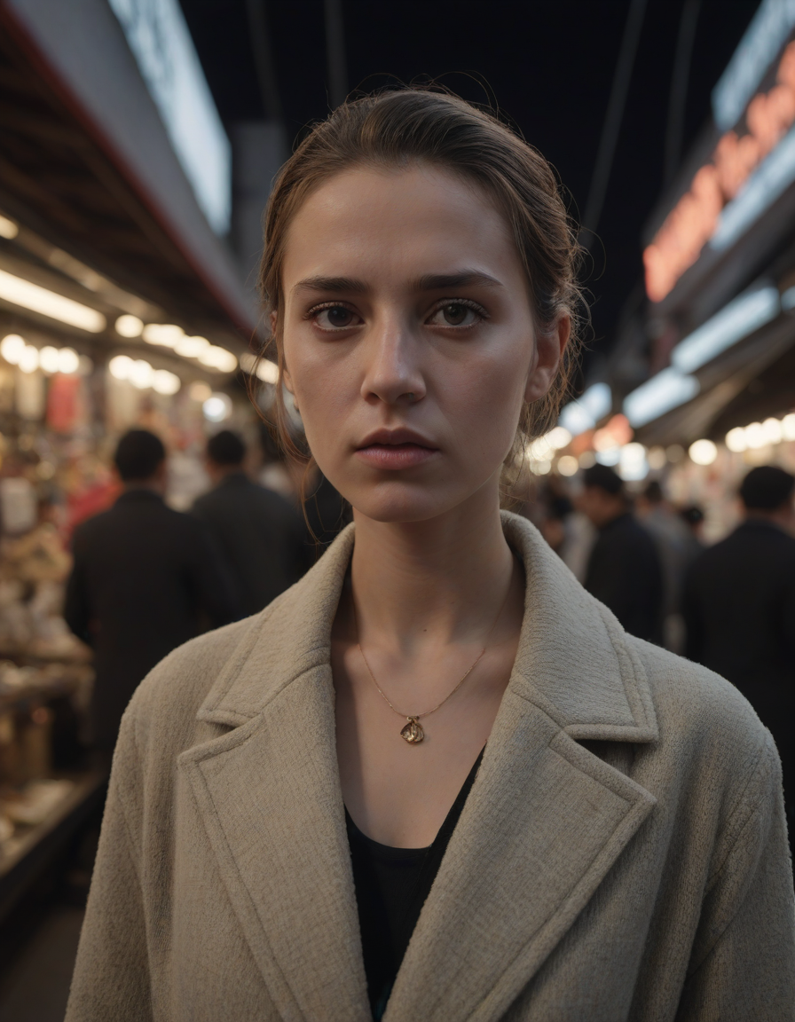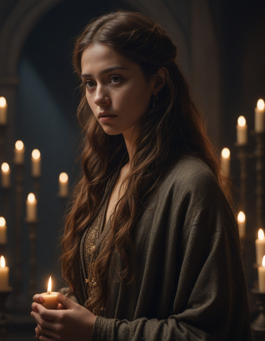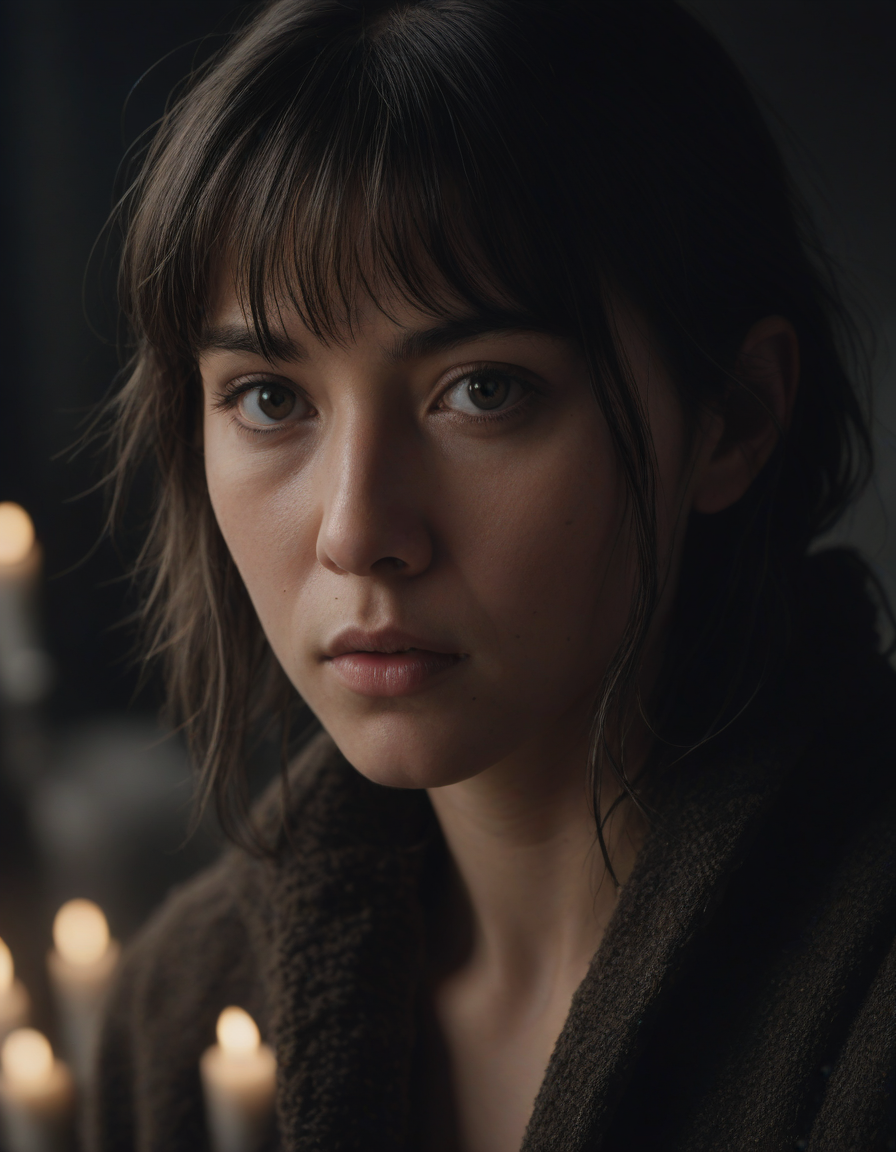 beauty embodied, Peering into the void, gloomy, downcast face, extremely detailed, wearing a heavy overcoat, award winning film, Glistening in the light of a thousand candles