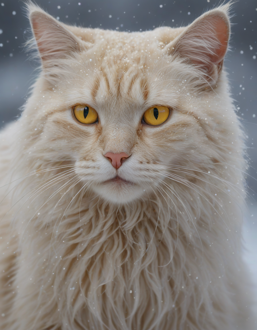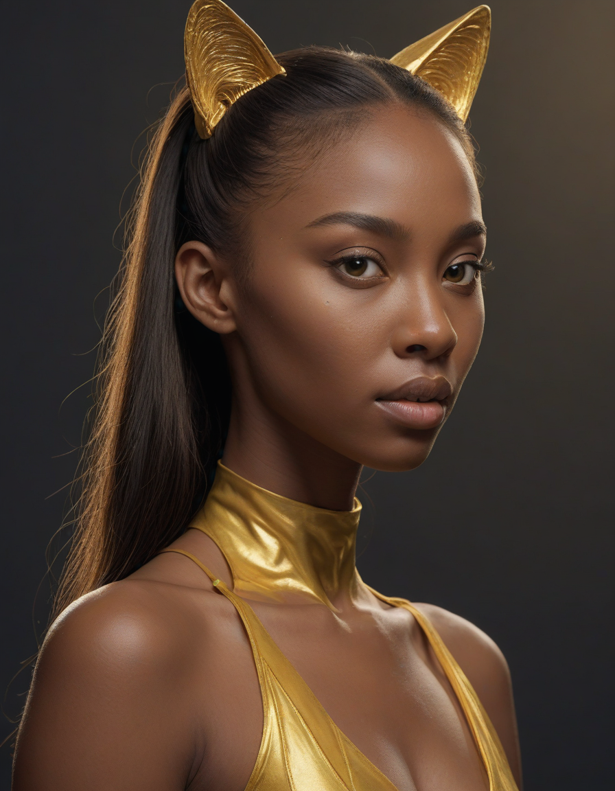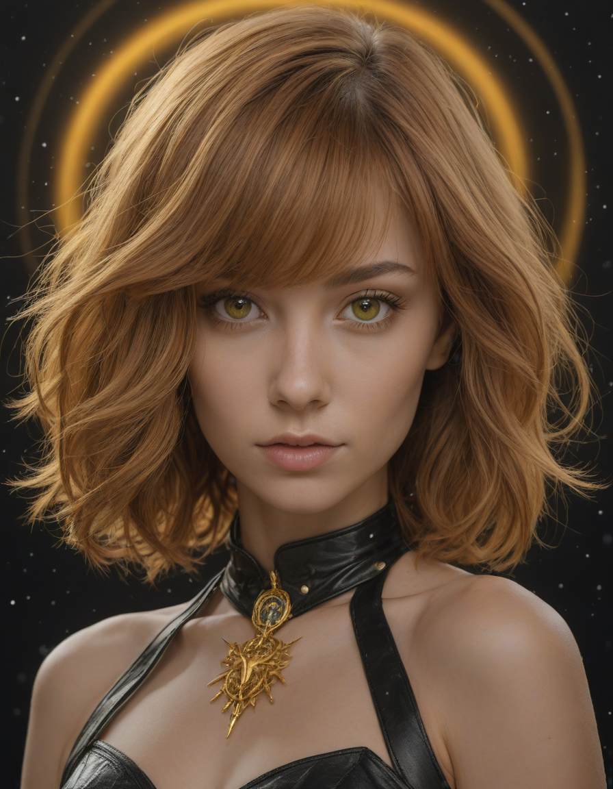 facing left, short telephoto lens, the glint of gold, Galactic nebulas swirling, yellow cat-like eyes