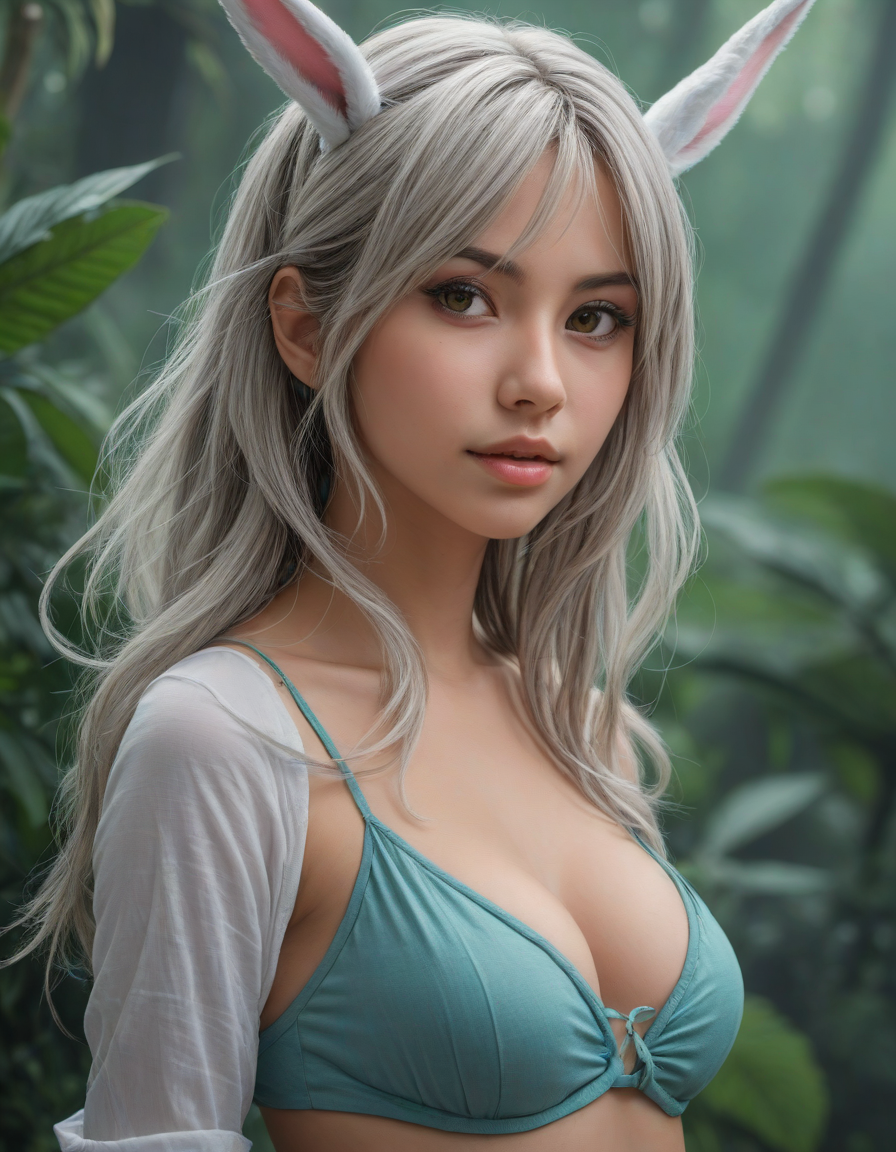 bunnygirl, Steamy jungle, thick with humid air, Women in vibrant Anime costumes, wife-beater shirt, sweet dreams
