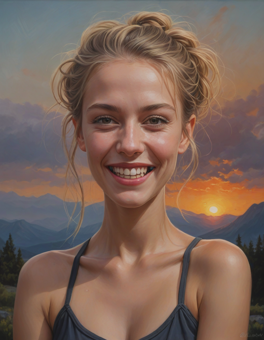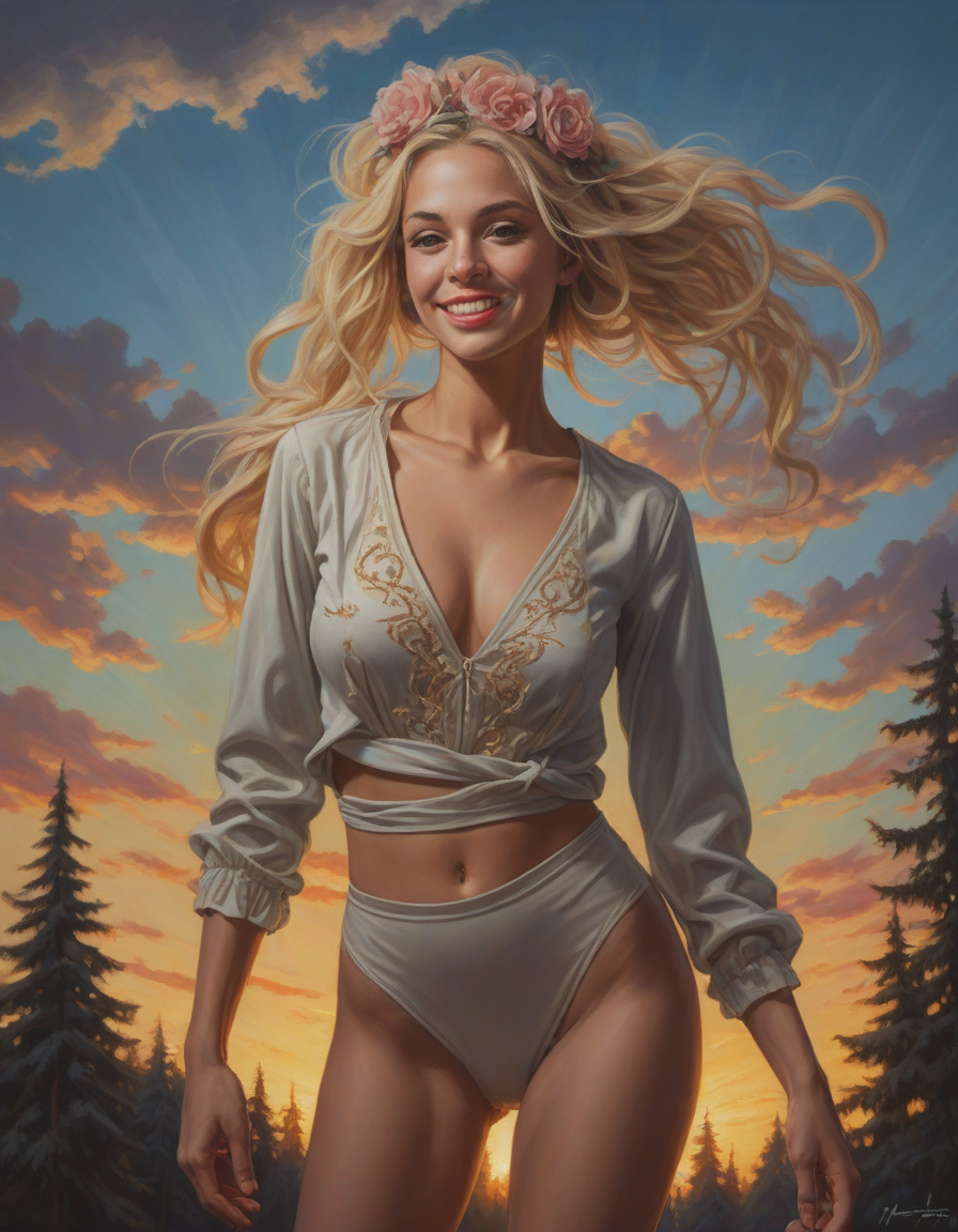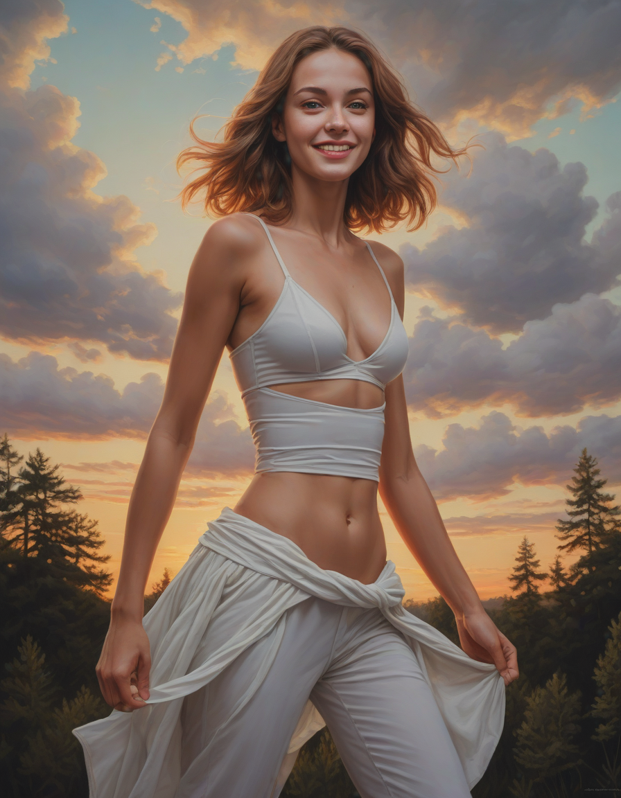 ski mask, Teeth-filled grin, contemporary dancer onstage, Tragic hero standing tall, epic oil painting, summer sunset hue