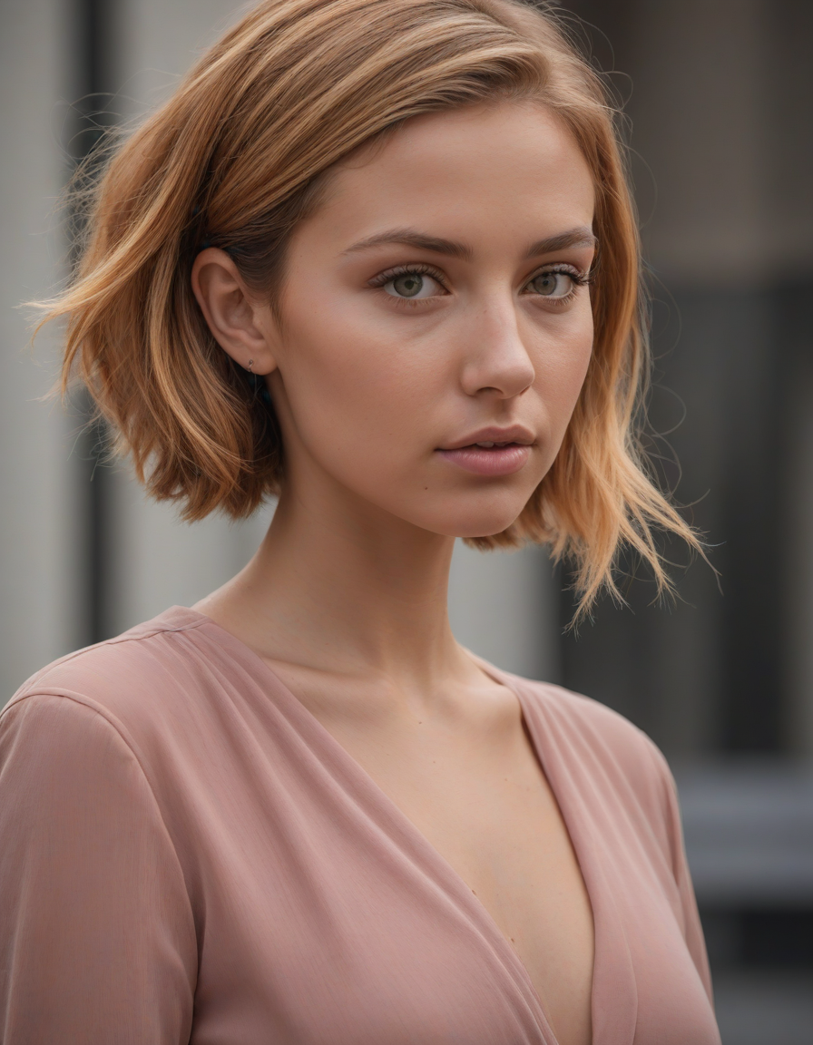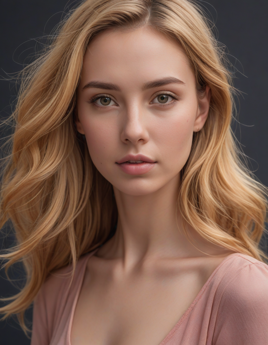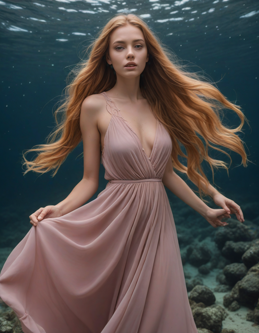 Peering into the void, Rose colored long dress flowing in the wind in a curious way, Sofia from Australia, medium shoulder-length ginger parted in the side with blond streaks, brown eyes, curved nose, thick lips, dimples, perfect teeth, teasing look, freckles, An exquisite arrangement of colors that will make you feel, person wearing headphones, irresistibly enticing, majestic