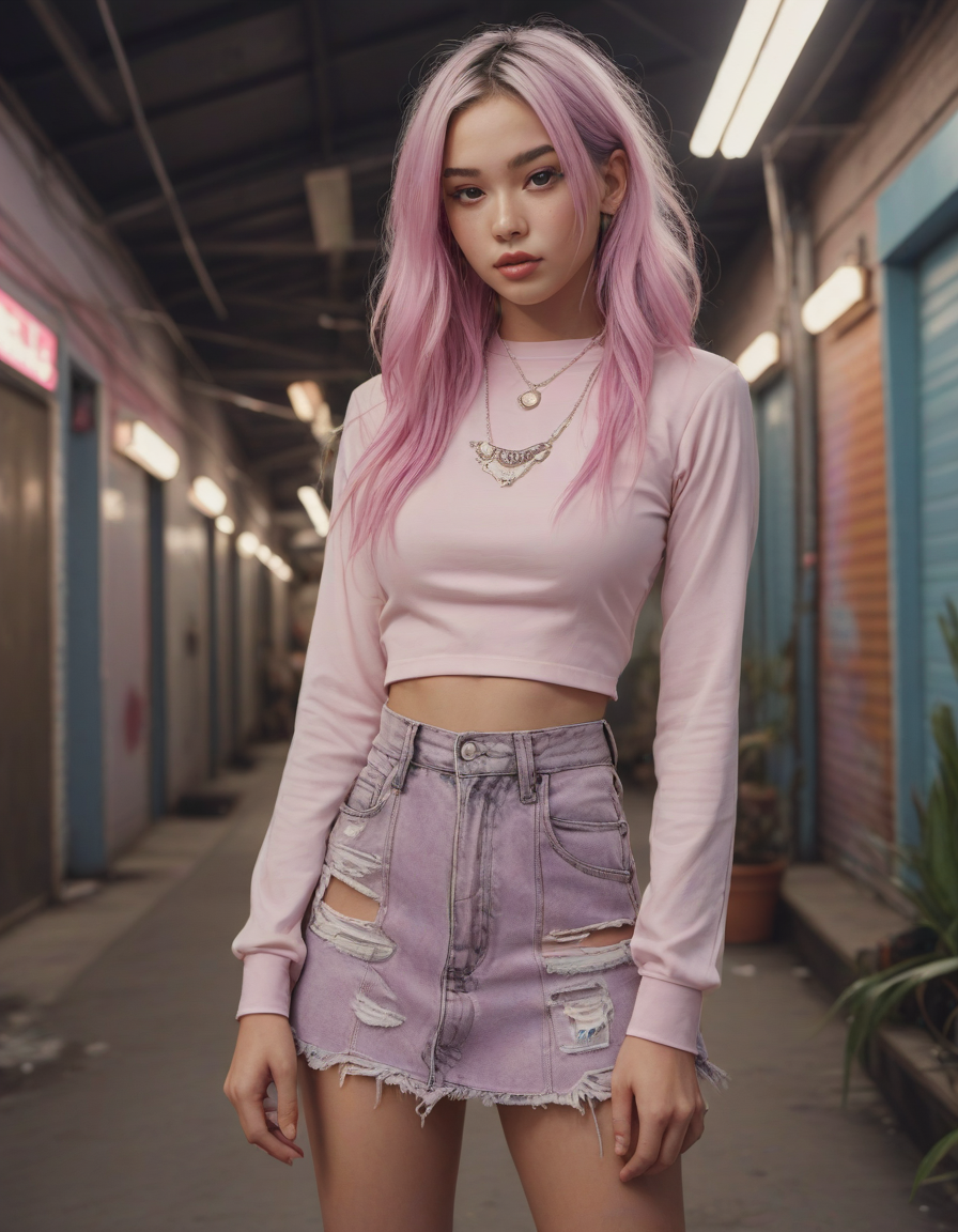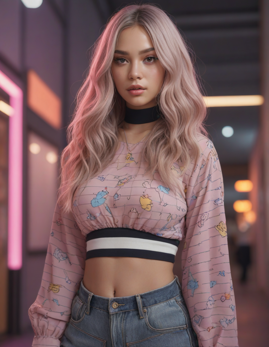Her makeup is a canvas of e-girl artistry, with dramatic winged eyeliner that stretches towards her temples in a bold statement, eyeshadow in neon hues that electrify her gaze, and dark, matte lipstick that draws all eyes to her. A generous application of blush adds life and vibrancy to her cheeks, complemented by creatively designed nails that are both dark and daring. Accessories—silver chains, a heart pendant choker, and a collection of rings—add layers of personality and depth. Her hair, possibly featuring pastel or neon streaks, is styled in a way that balances edge with elegance, with temporary tattoos or stickers adorning her face to accentuate her playful rebellion.