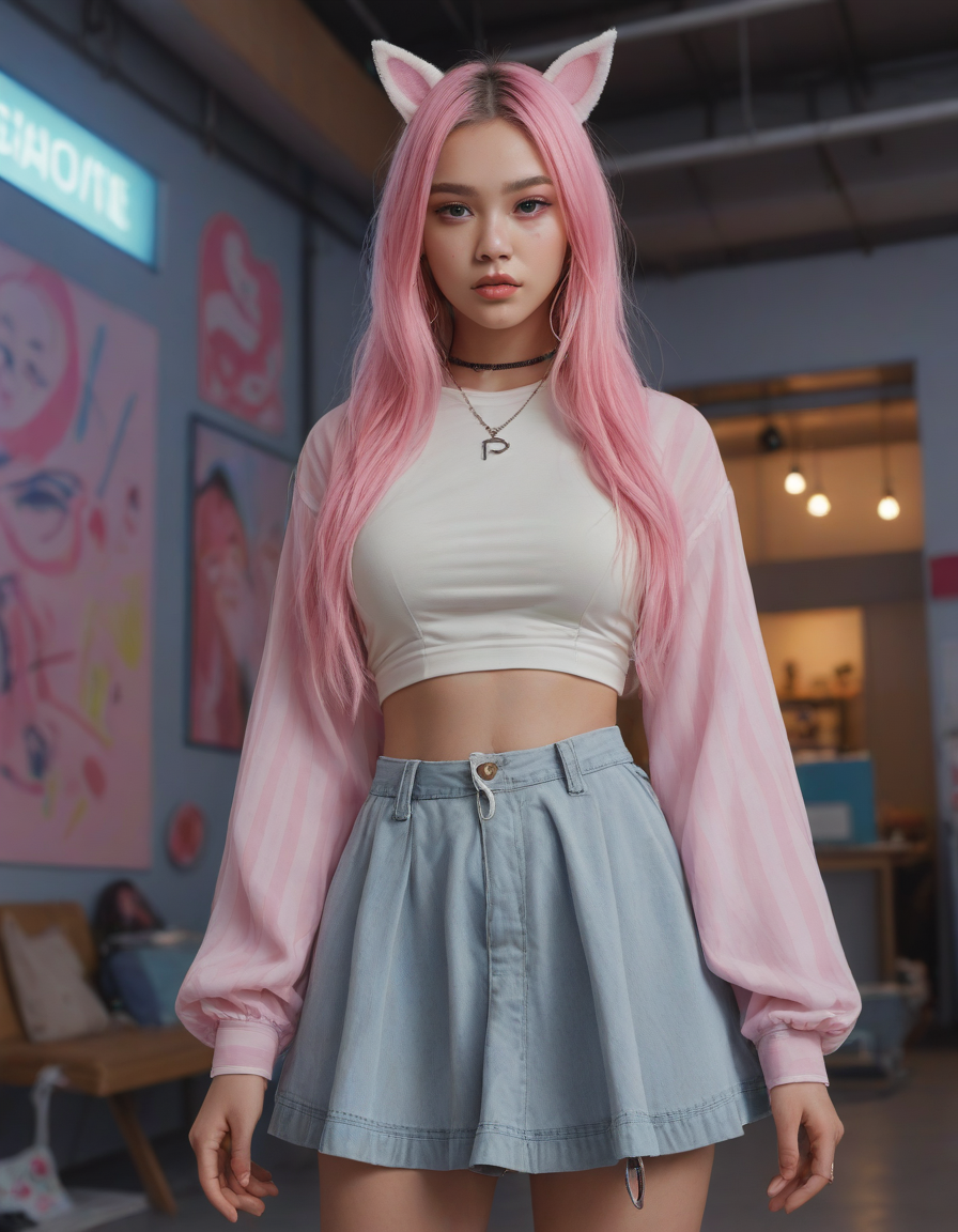 This visualization retains the essence of our previous description, now enhanced by a pose that speaks volumes of her confidence and the vibrant spirit of the e-girl aesthetic. It captures not just the photorealistic image of a young woman in the throes of digital age culture but also the bold statement of identity and self-expression that defines her at this significant moment in her life.