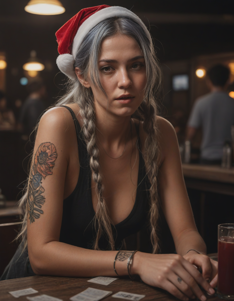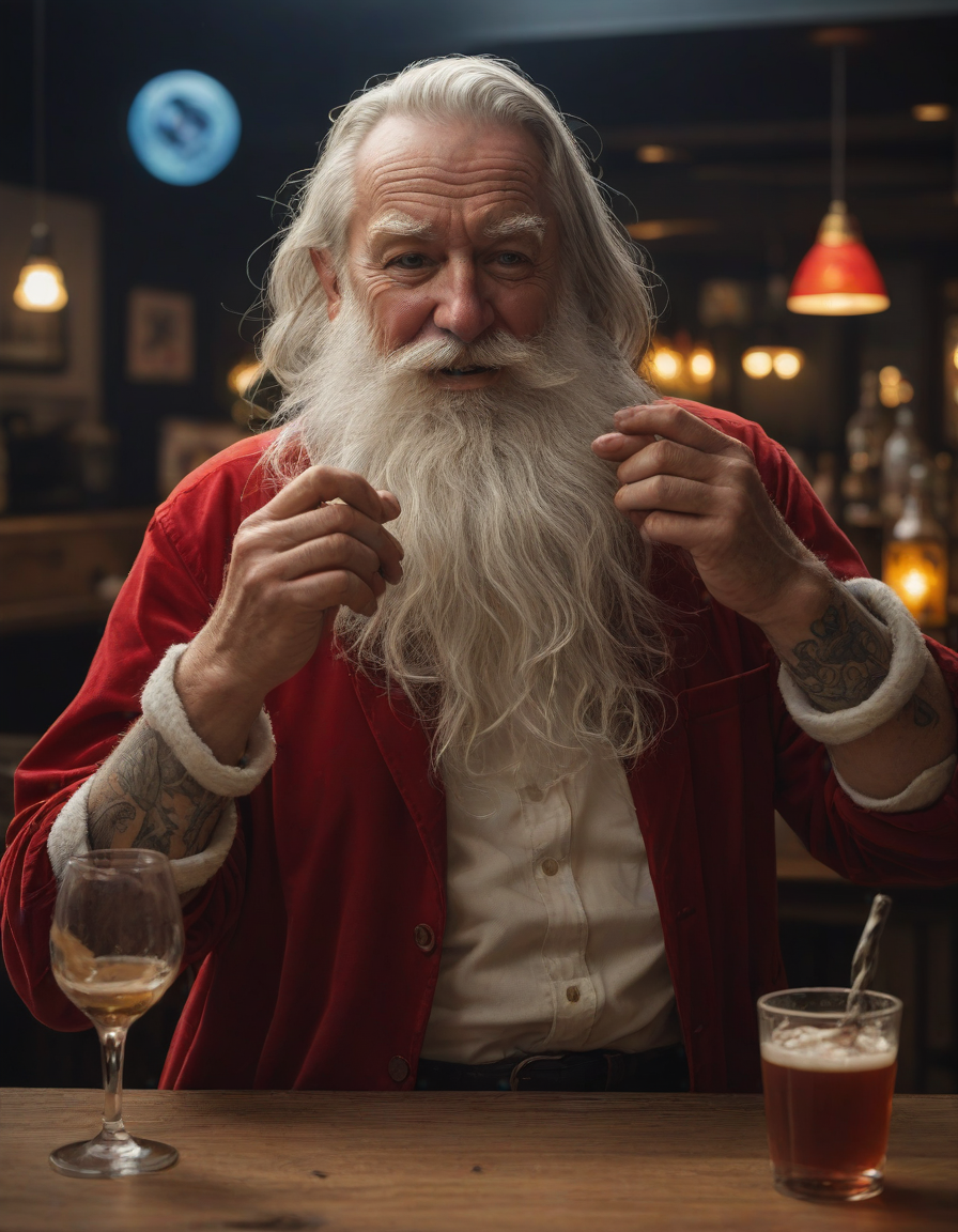 photo of the santa drunk at a bar, spritesheet, melancholic, pyrotechnics, whimsical tattoos, Galactic nebulas swirling, Intense gaze, Blinding sunlight, panicked