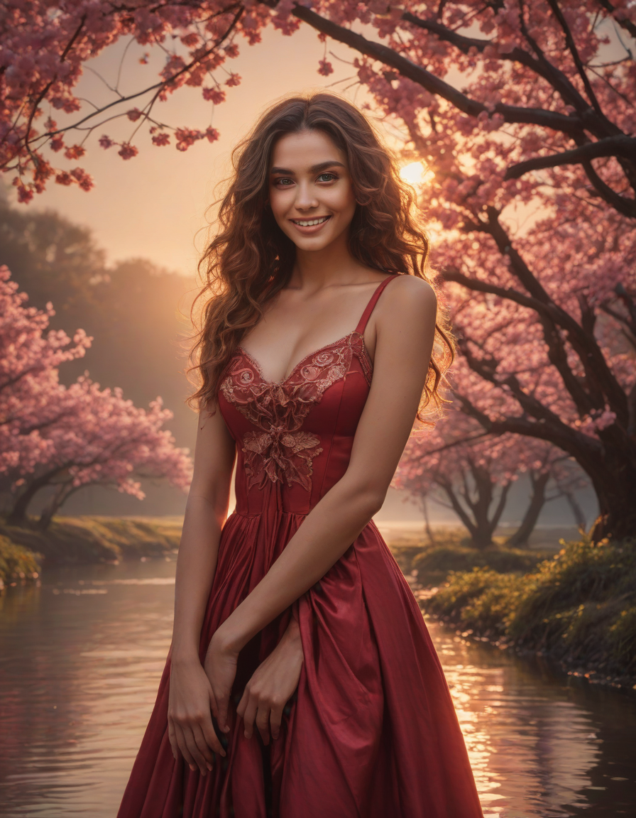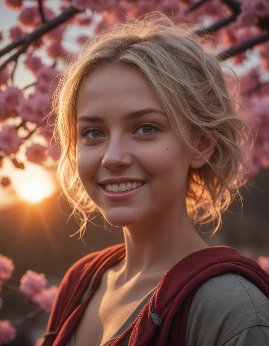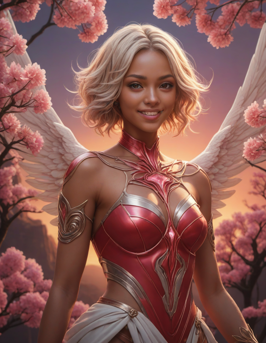 glowing crimson, Giant cherry blossom, Teeth bared in a snarl, Rays of hope streaming in, gazing at a breathtaking sunset, terrifying, Smiling angel with halo, Eyes glowing