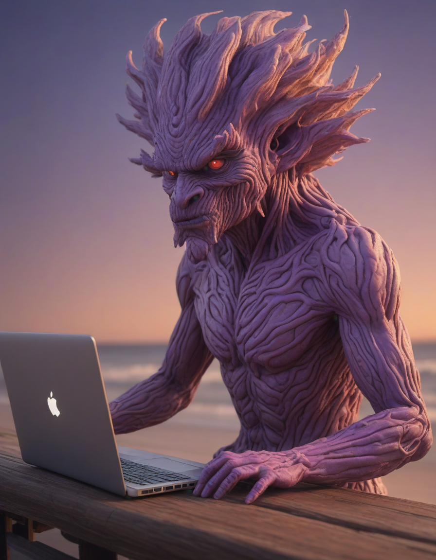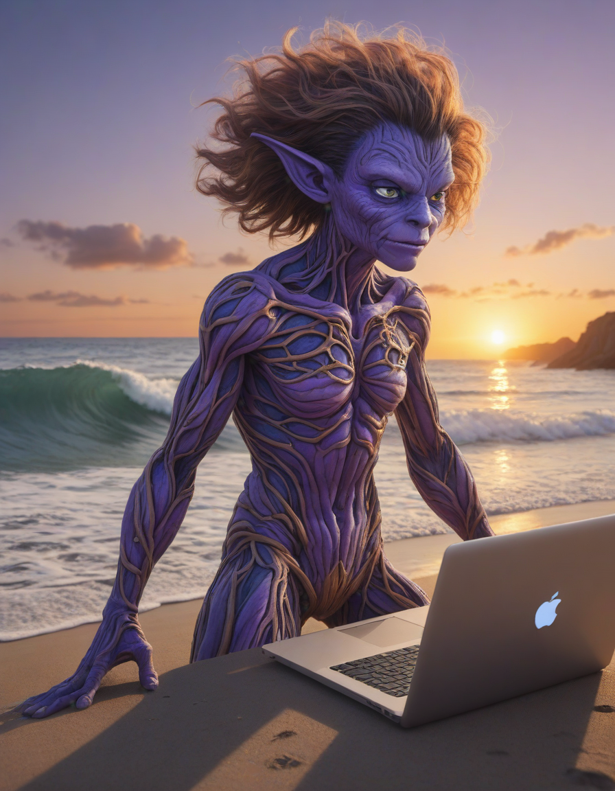 treant, hot, motion blur, Sarcastic half-smile, Scrutinizing, Lavender nebula, defiant stance, Gaudy sweater, raging while typing at a computer, staring at a screen, Surfer catching wave in beach sunset, glistening silk