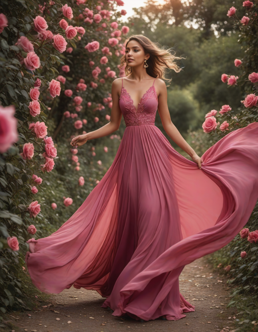 Rose colored long dress flowing in the wind in a curious way, vibrant dream