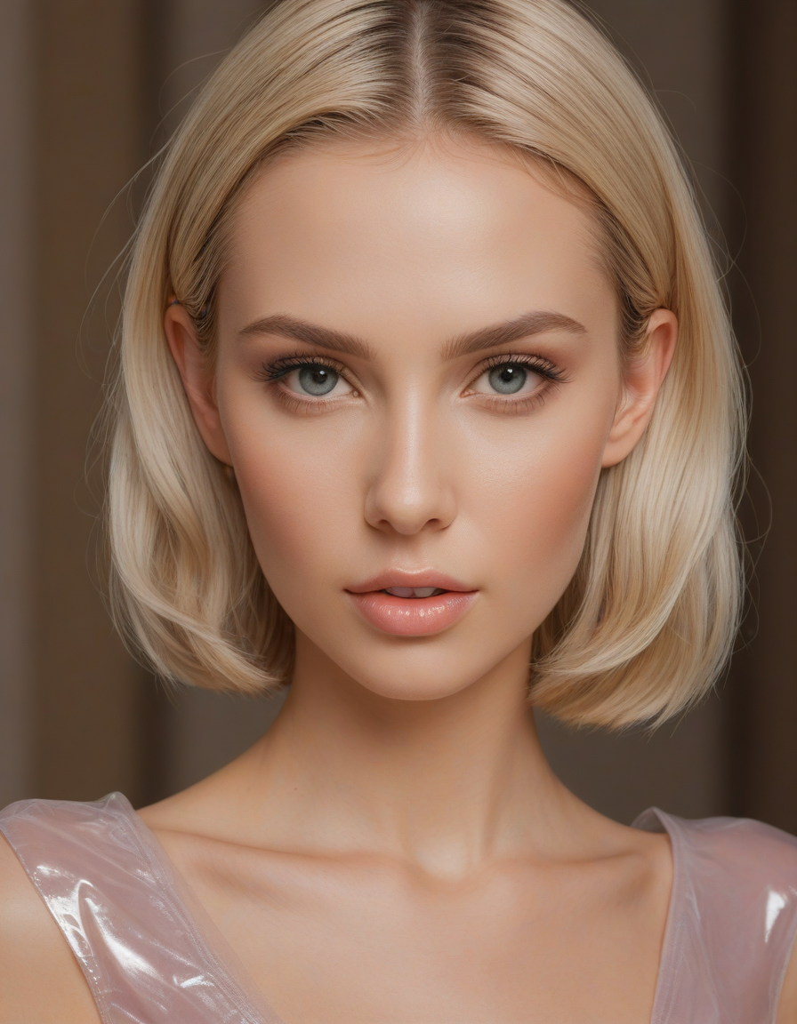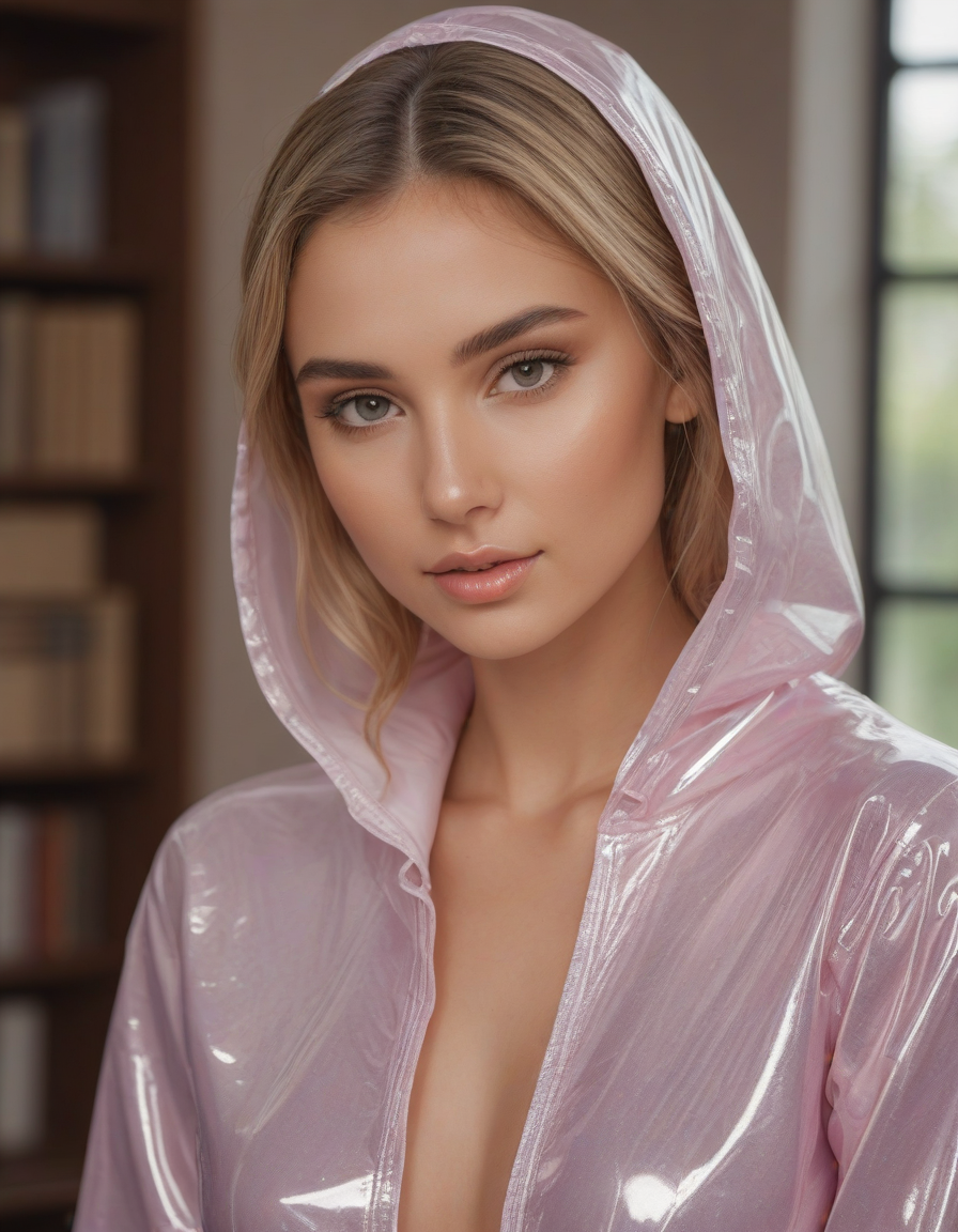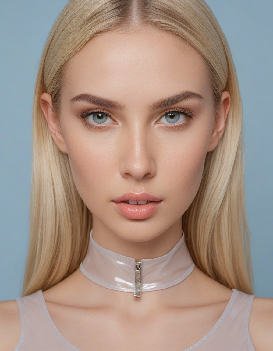 shiny, glossy PVC outfit, (shiny glossy PVC cloth textures), clothes made from pvc, plastic, oval face shape, almond-shaped eyes, voluminous lashes, slightly arched eyebrows, narrow nasal bridge, rounded nose tip, symmetrical nostrils, full lips, pronounced cupid's bow, slightly fuller lower lip, defined cheekbones, rounded chin, smooth complexion, softly contoured jawline, balanced facial proportions, symmetrical features, gently curved eyelids, soft brow ridge, harmonious cheek to jawline transition, subtle philtrum, delicate ear lobes, straight blonde hair, clear skin, hooded eyelids, light pink lip color, slightly pouty expression, casual pose with hand on face, slight head tilt, indoor lighting, Light blue irises, Medium-thickness eyebrows, Softly angled eyebrows, A hint of freckles across the nose and cheeks, Natural makeup, Gentle frown lines between the eyebrows, Soft nasolabial folds, Smooth forehead, Subtle dimple on the chin, Clear facial contour without distinct shadows, Even skin tone with a hint of natural pink undertones, Slightly rosy cheeks, Tapered jawline, Fine hair texture with gentle waves, Youthful appearance with soft facial features