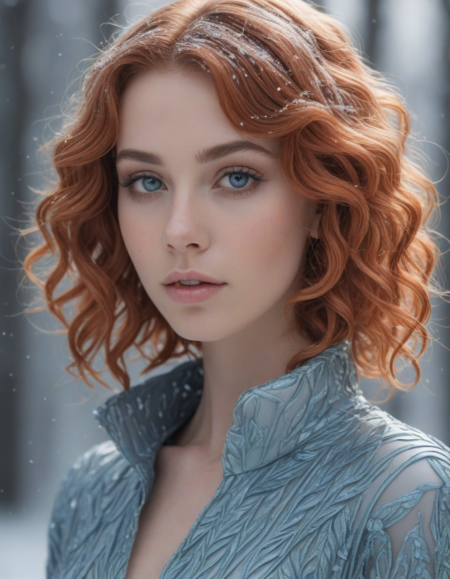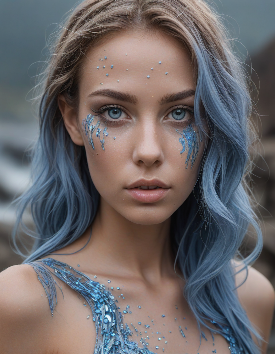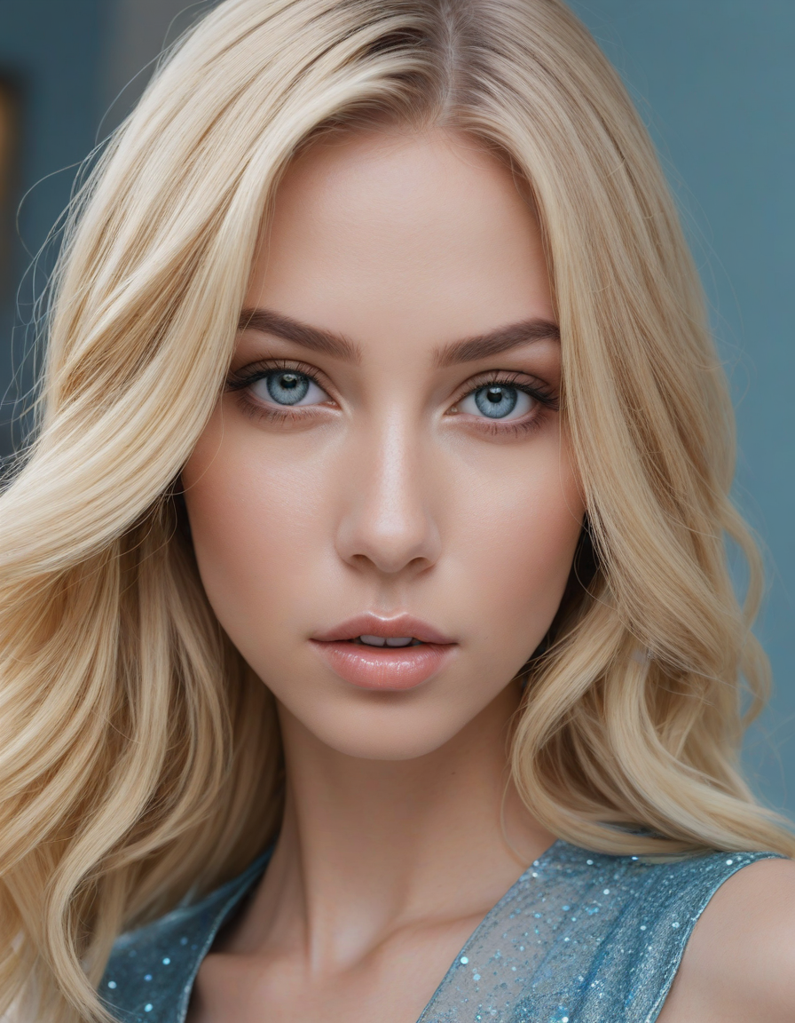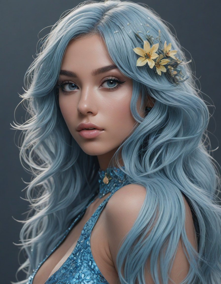 decorated in sugary glitter, love, abounding with wildflowers, A battle roar, sleek, futuristic fashion, passionate, light blue colored iris pigment, light blue colored eyes, blue-iris-color, blue-eye-color,