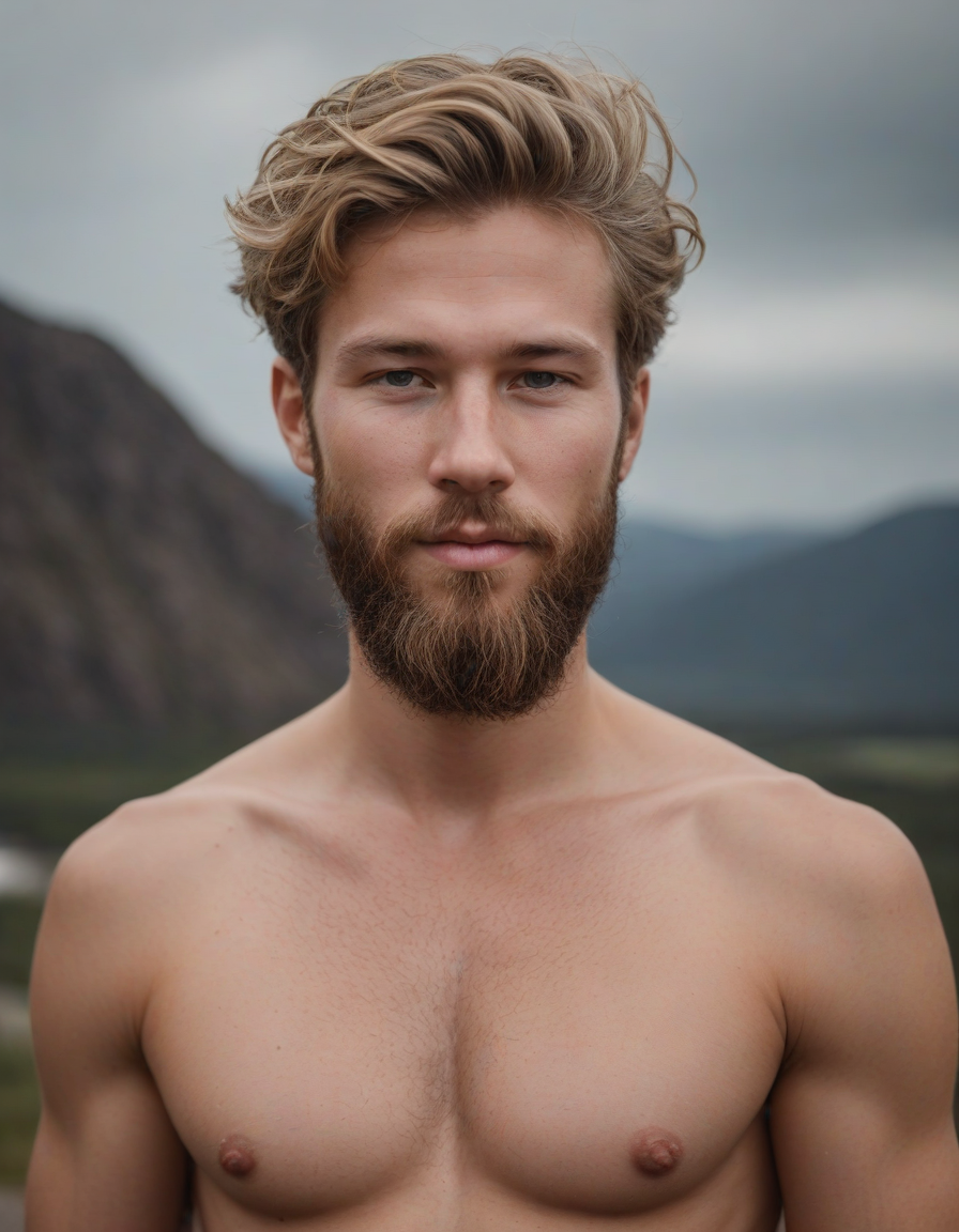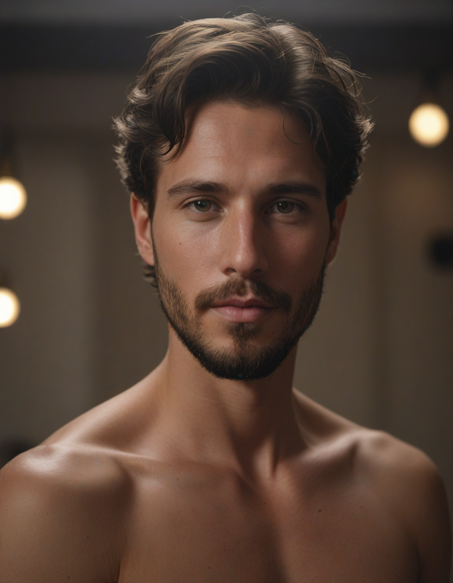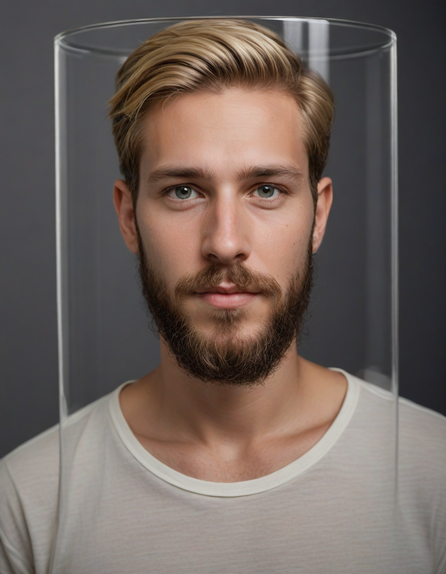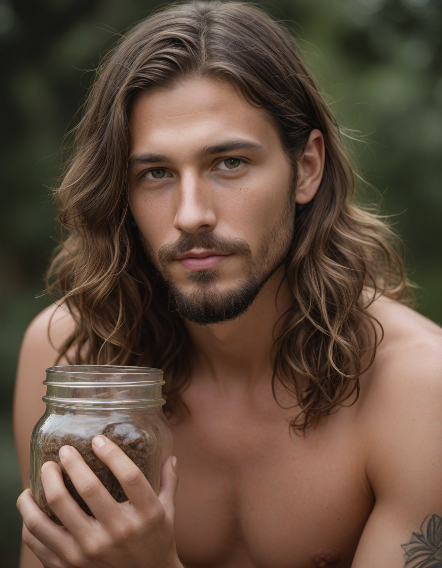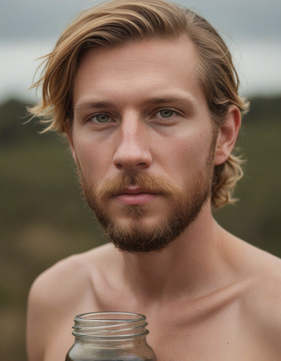 Strapless top, strapless, no straps, in an glassjar, Low-Key Lighting, dreamy, a man with a wild, unkempt beard, raised chin