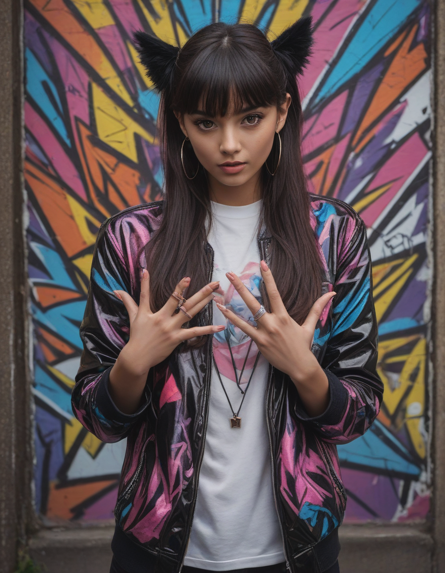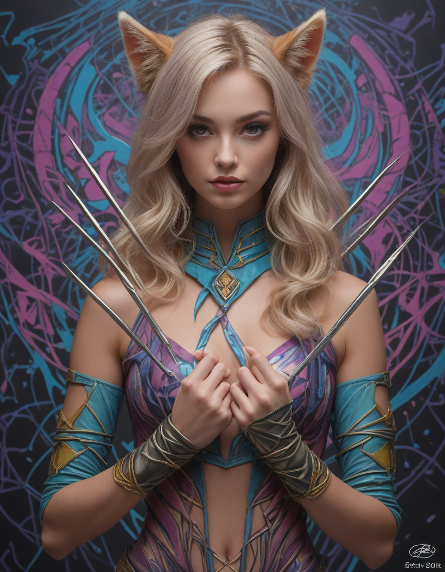 nice hands, attractive, symetrical, very attractive, Prismatic renaissance, whimsical graffiti, New Romantic 80s clothing, wolverine claws, cat