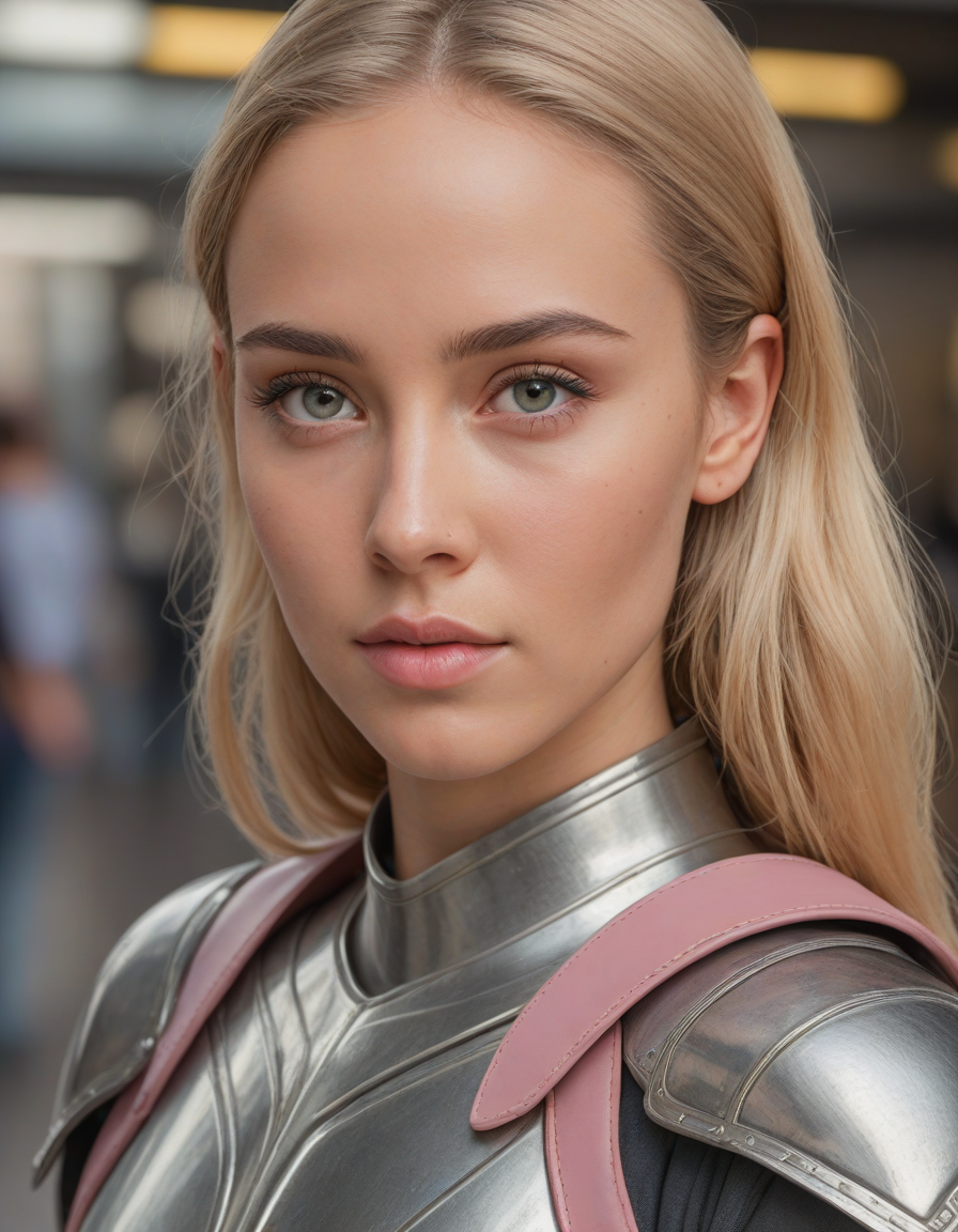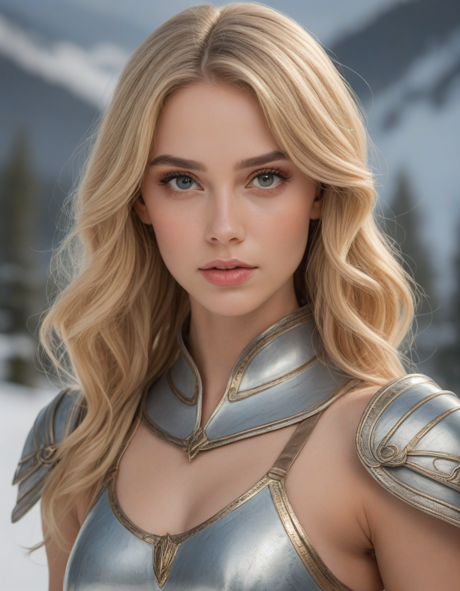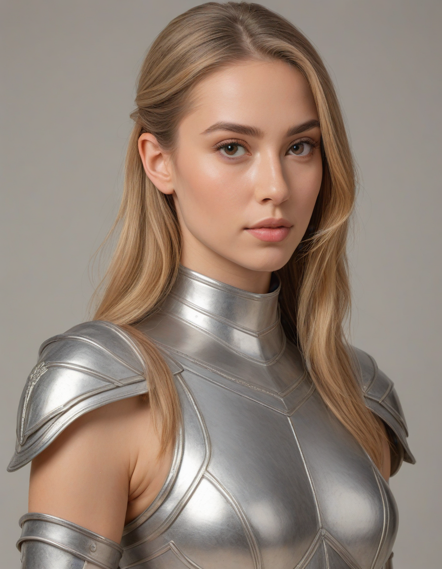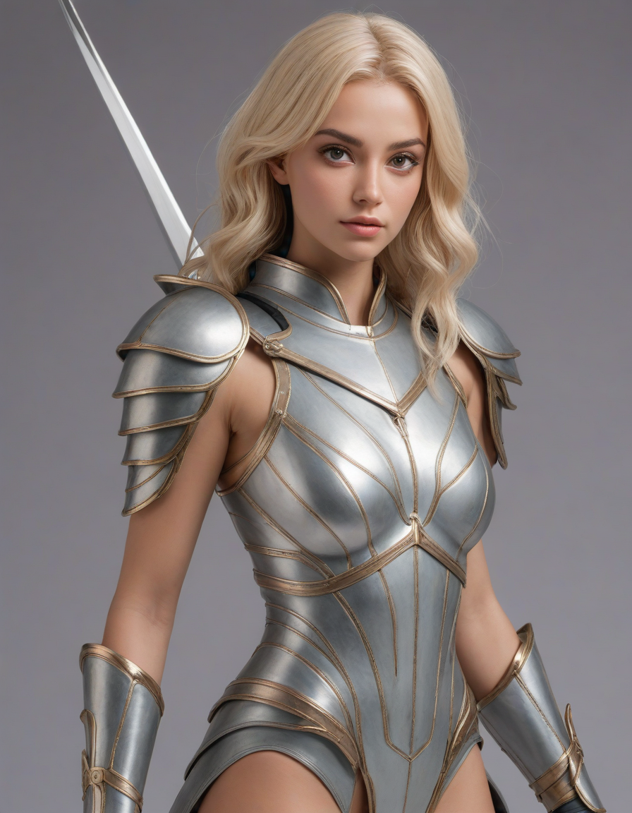 wearing sleeveless leotard, wearing one peice clothing, leotard, sleeveless, , action, oval face shape, almond-shaped eyes, voluminous lashes, slightly arched eyebrows, narrow nasal bridge, rounded nose tip, symmetrical nostrils, full lips, pronounced cupid's bow, slightly fuller lower lip, defined cheekbones, rounded chin, smooth complexion, softly contoured jawline, balanced facial proportions, symmetrical features, gently curved eyelids, soft brow ridge, harmonious cheek to jawline transition, subtle philtrum, delicate ear lobes, straight blonde hair, clear skin, hooded eyelids, light pink lip color, slightly pouty expression, casual pose with hand on face, slight head tilt, indoor lighting, Light blue irises, Medium-thickness eyebrows, Softly angled eyebrows, A hint of freckles across the nose and cheeks, Natural makeup, Gentle frown lines between the eyebrows, Soft nasolabial folds, Smooth forehead, Subtle dimple on the chin, Clear facial contour without distinct shadows, Even skin tone with a hint of natural pink undertones, Slightly rosy cheeks, Tapered jawline, Fine hair texture with gentle waves, Youthful appearance with soft facial features, wearing complete set of armor, wearing full armor, Wearing chest armor, wearing leg armor, wearing feet armor, wearing bracer, wearing pauldrons,, Holding a sword in both hands in a confident pose, detailed grip, detailed fuller, detailed pommel, detailed blade, detailed edge,