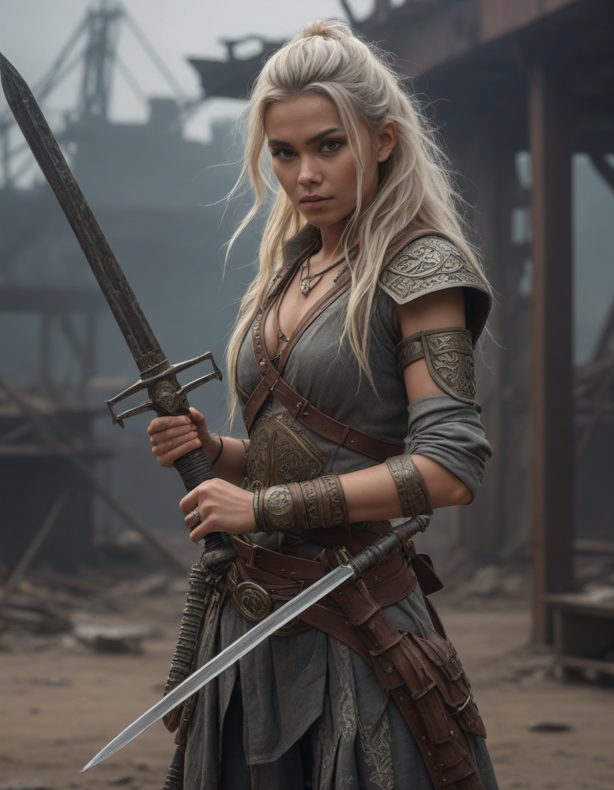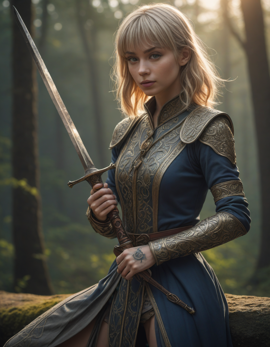 On edge, absurdly beautiful, Holding a sword in both hands in a confident pose, detailed grip, detailed fuller, detailed pommel, detailed blade, detailed edge, , glassy, Lonely stranger, sparkling