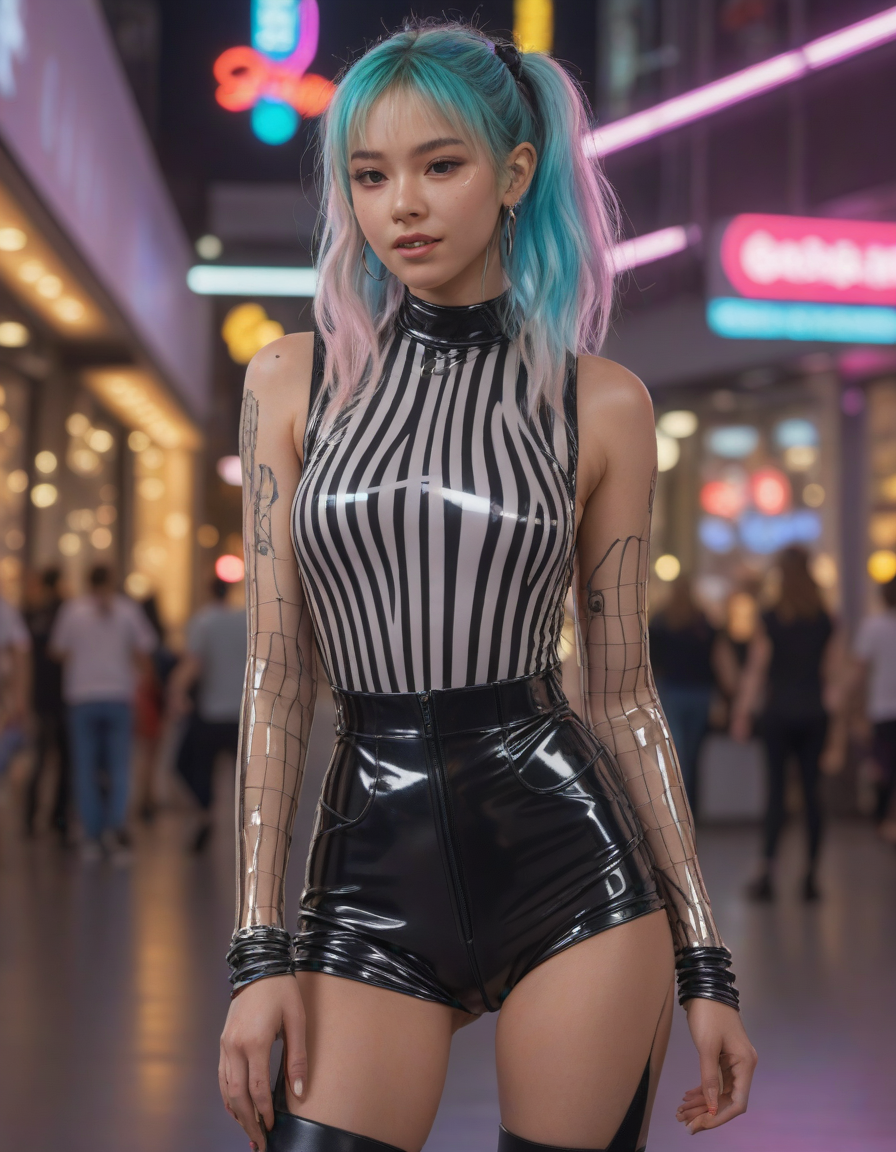 wearing sleeveless leotard, wearing one peice clothing, leotard, sleeveless, , laughing, (ab lines:1.5),raytracing,Oiled skin,Glistening skin,Oiled skin,reflective skin,Glossy skin,metal skin,metallic luster,Oiled clothes,skin tight,covered nipples,covered nave, Craft an ultra-realistic, photorealistic image of an 18-year-old high school senior girl, fully immersed in the e-girl aesthetic, standing alone yet commanding the scene with an unspoken power. Her voluptuous figure is showcased through the definitive e-girl style, blending internet culture's flair with a personal touch that's bold and unapologetic. Her attire consists of an oversized long-sleeve striped shirt beneath a black graphic t-shirt dress that contours gracefully, celebrating her curves against the backdrop of e-girl fashion's layered complexity. Fishnet tights underpin the ensemble, leading down to chunky black platform boots that ground her in strength and style.