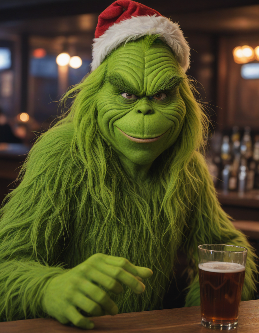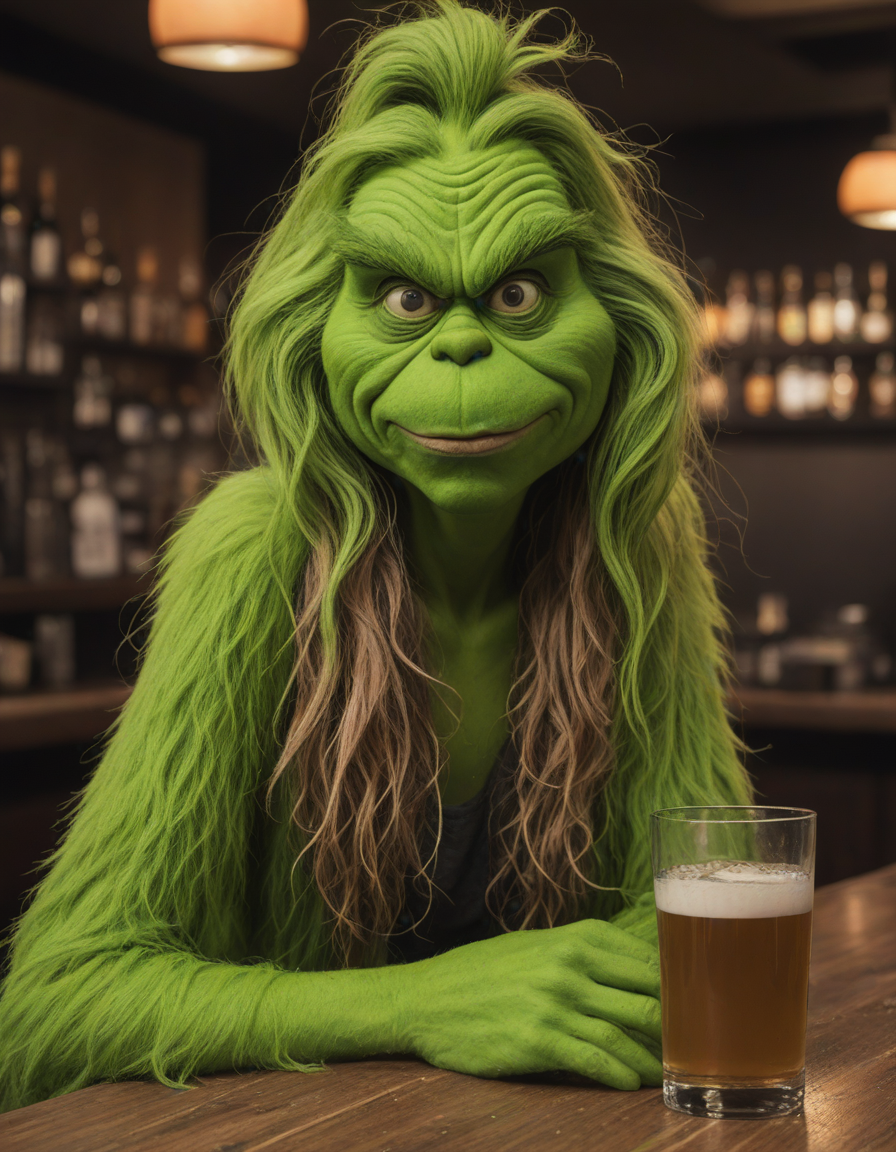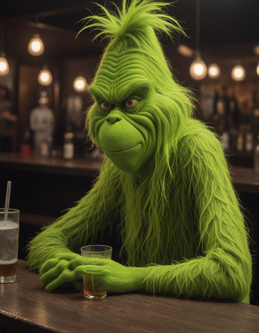 photo of the grinch drunk at a bar, Grunge aesthetics