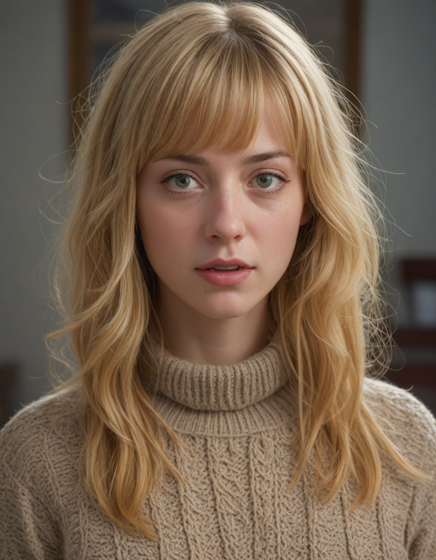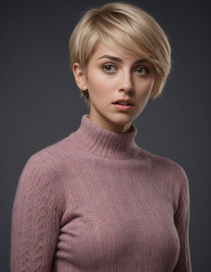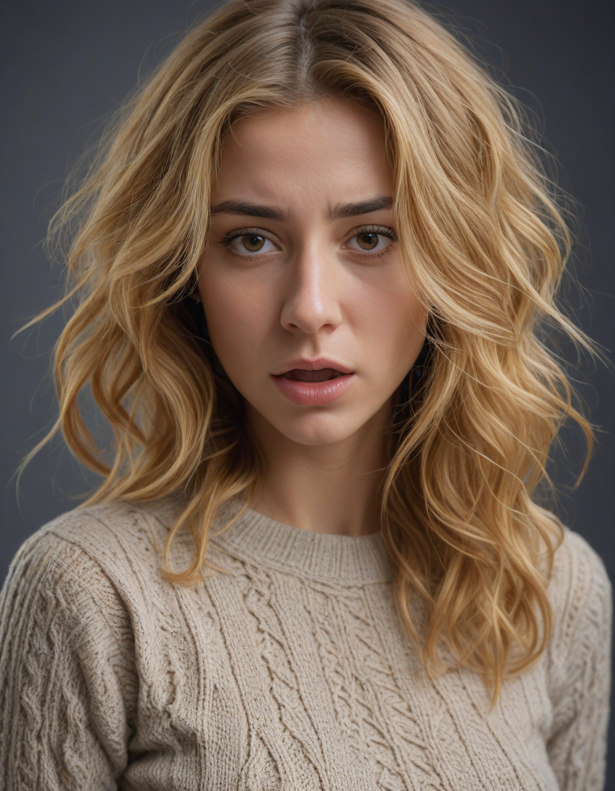 Gaudy sweater, secretly in love, apprehensive flinching, photorealistic portrait, gasping, boisterous enthusiasm, mad