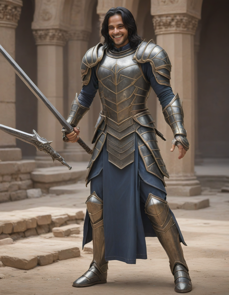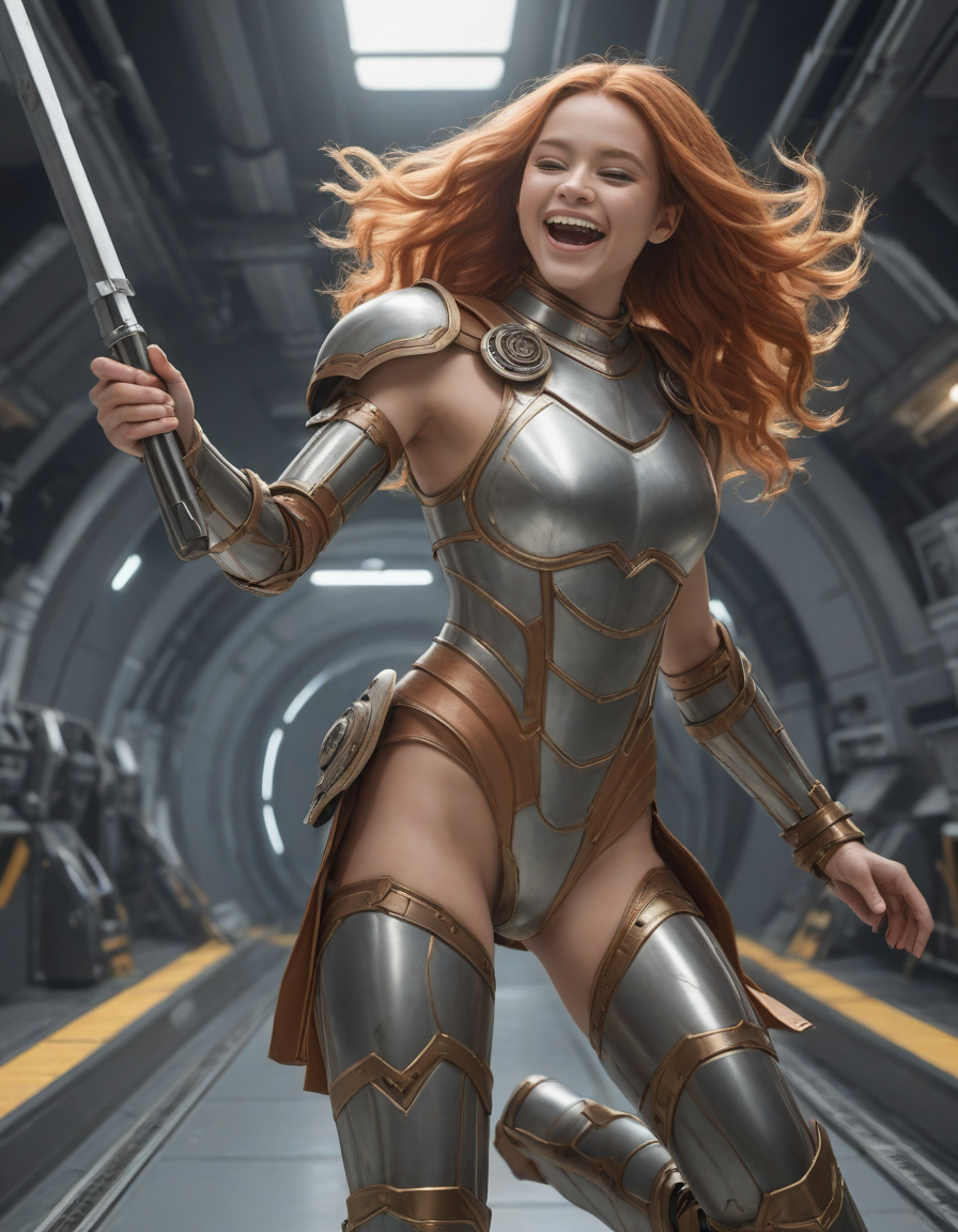 wearing sleeveless leotard, wearing one peice clothing, leotard, sleeveless, , laughing, Wielding a one-handed weapon in both hands, one-handed weapon, weapon, , wearing complete set of armor, wearing full armor, Wearing chest armor, wearing leg armor, wearing feet armor, wearing bracer, wearing pauldrons,