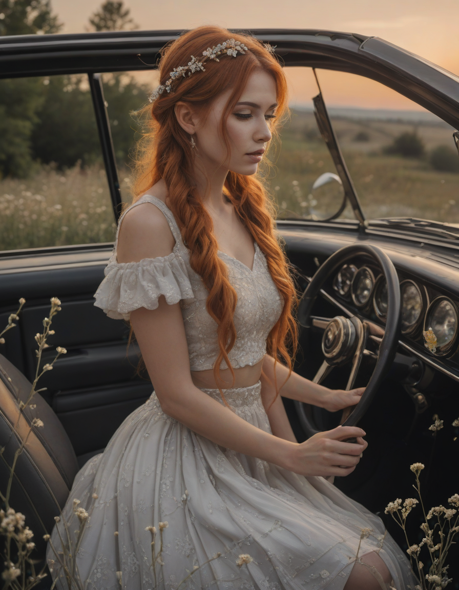 Sparkling diamond, abounding with wildflowers, vaporous swirls, in a car