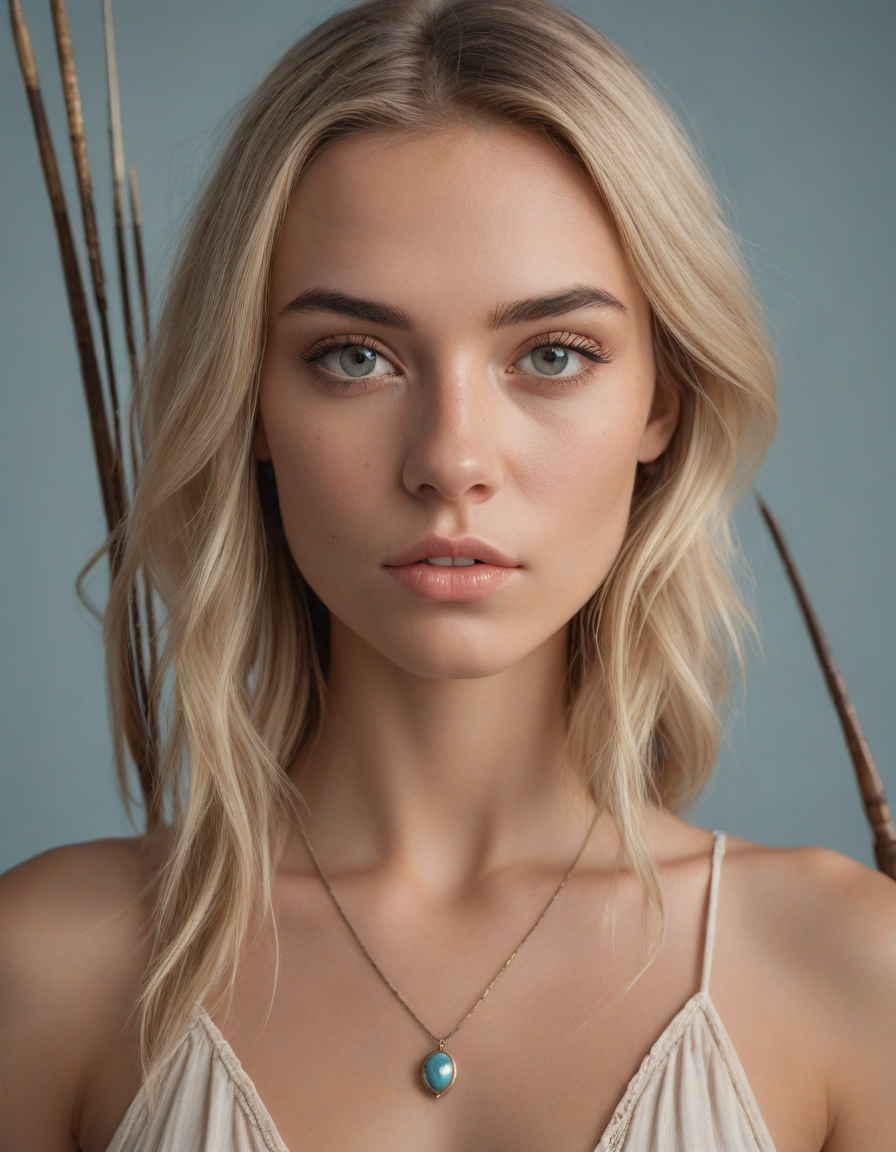 bohemian, "free spirit", jewelry, tattoo, spring dress, tall woman, Wielding a one-handed weapon in both hands, one-handed weapon, weapon, , oval face shape, almond-shaped eyes, voluminous lashes, slightly arched eyebrows, narrow nasal bridge, rounded nose tip, symmetrical nostrils, full lips, pronounced cupid's bow, slightly fuller lower lip, defined cheekbones, rounded chin, smooth complexion, softly contoured jawline, balanced facial proportions, symmetrical features, gently curved eyelids, soft brow ridge, harmonious cheek to jawline transition, subtle philtrum, delicate ear lobes, straight blonde hair, clear skin, hooded eyelids, light pink lip color, slightly pouty expression, casual pose with hand on face, slight head tilt, indoor lighting, Light blue irises, Medium-thickness eyebrows, Softly angled eyebrows, A hint of freckles across the nose and cheeks, Natural makeup, Gentle frown lines between the eyebrows, Soft nasolabial folds, Smooth forehead, Subtle dimple on the chin, Clear facial contour without distinct shadows, Even skin tone with a hint of natural pink undertones, Slightly rosy cheeks, Tapered jawline, Fine hair texture with gentle waves, Youthful appearance with soft facial features