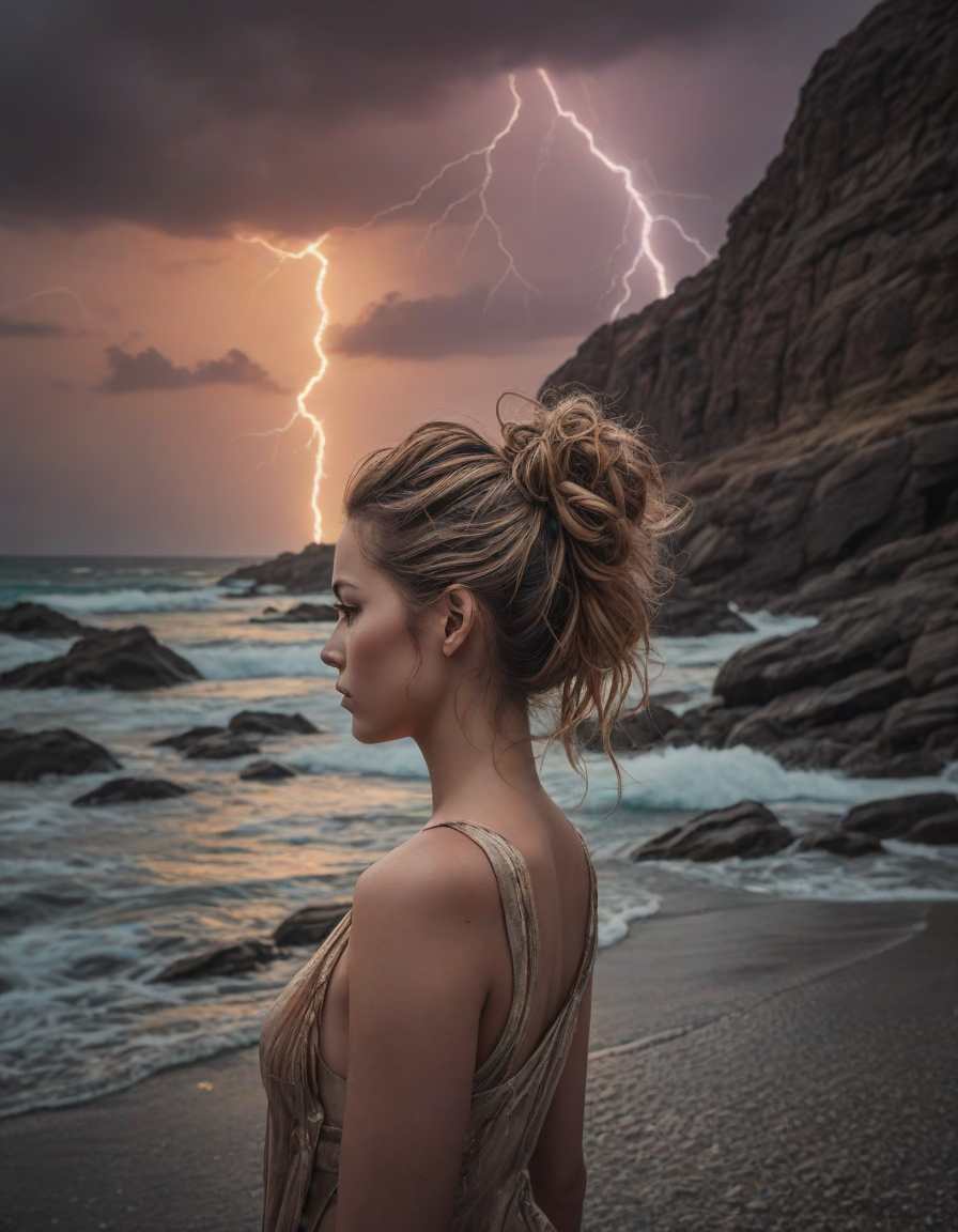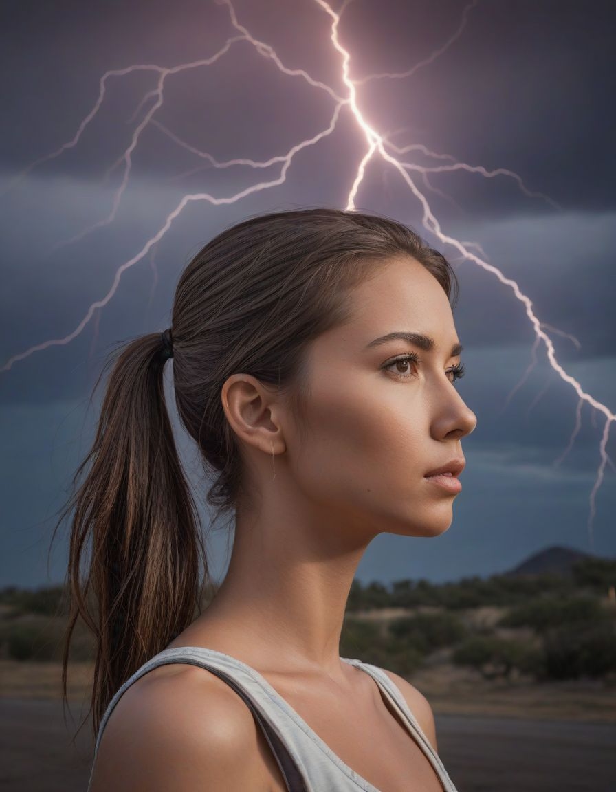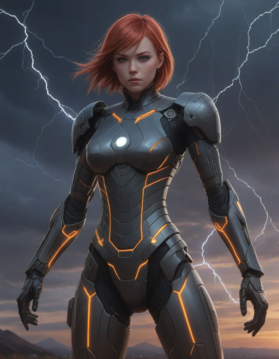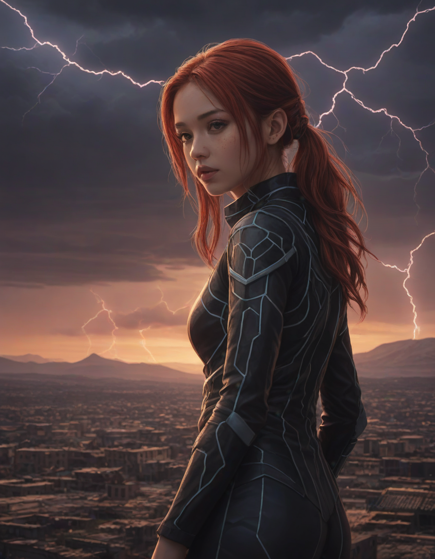 Lightning strikes in the distance, torrid sunset, Tron-like