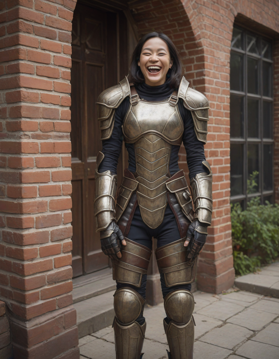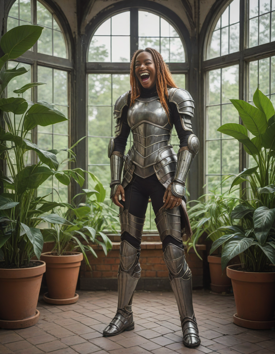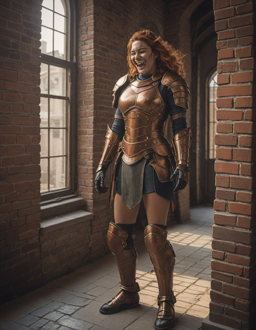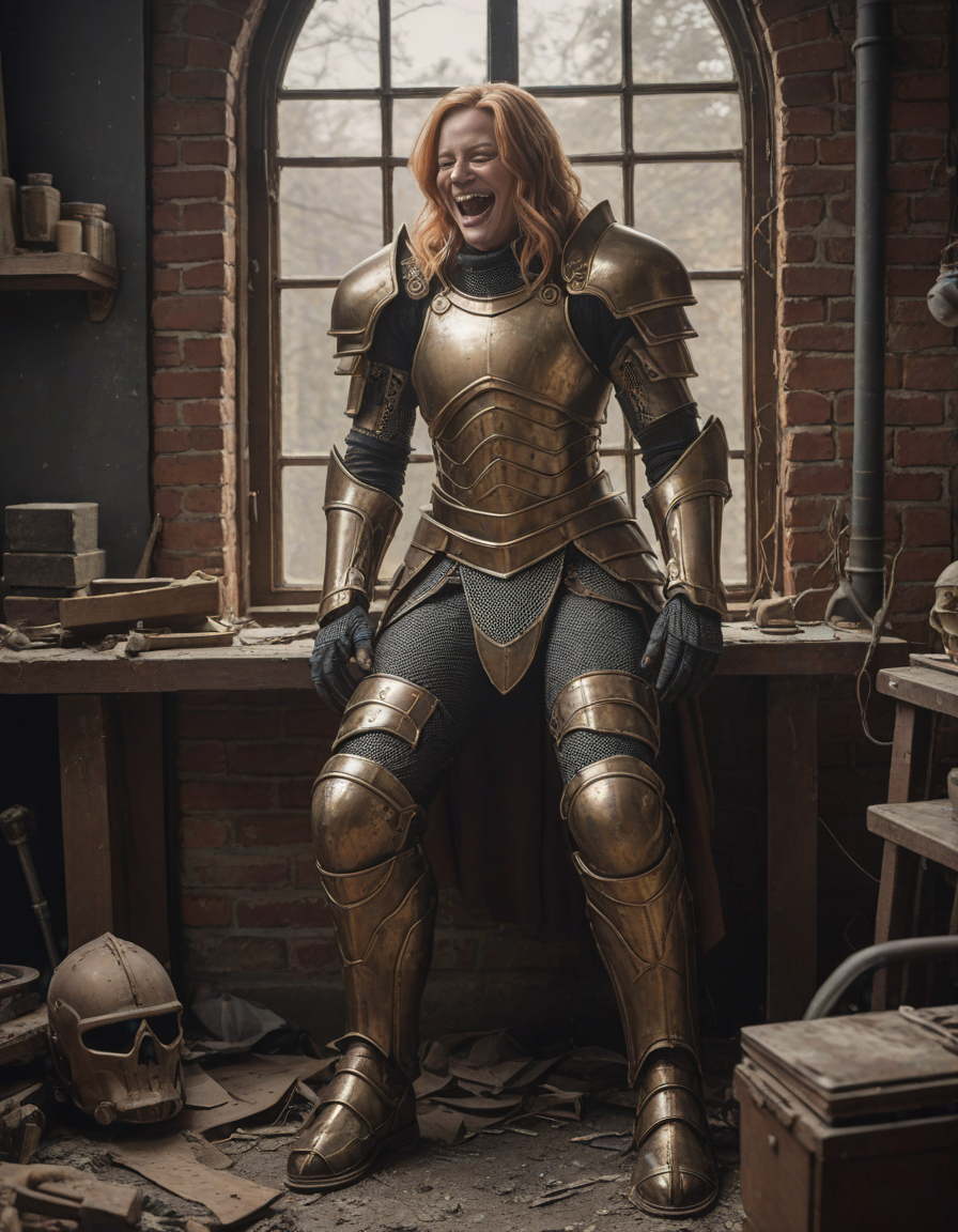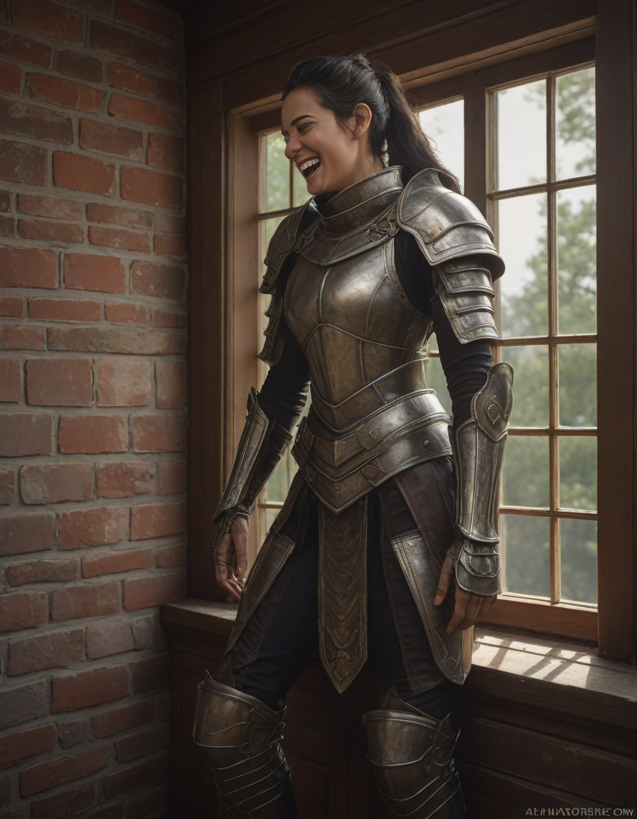 laughing, wearing complete set of armor, wearing full armor, Wearing chest armor, wearing leg armor, wearing feet armor, wearing bracer, wearing pauldrons,, brick wall -> great window view