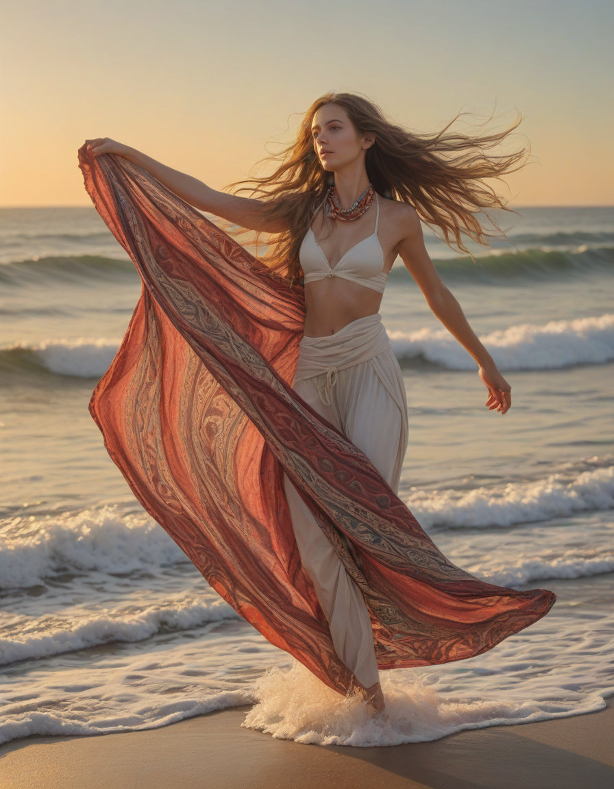 absurdly beautiful, Surfer catching wave in beach sunset, a woman with long flowing hair draped over one shoulder and a fasciantingly vibrant scarf wrapped around her neck, Bizarrely, holding a yoga pose, designer vintage wear