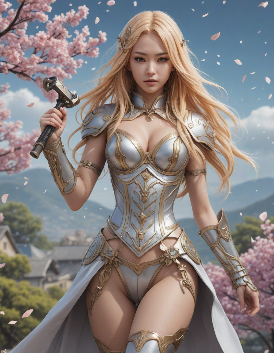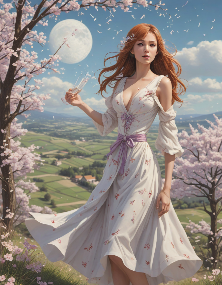 newspaper editorial photography, sparkling snowflakes, Anime-style hourglass figure, rolling hills, mathematics, Lightning strikes in the distance, Blossoming cherry trees, petals falling like snow, cel-shaded scene