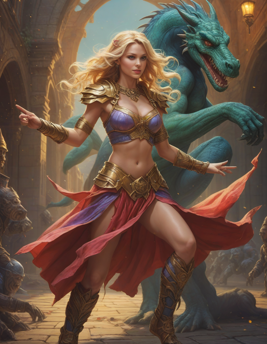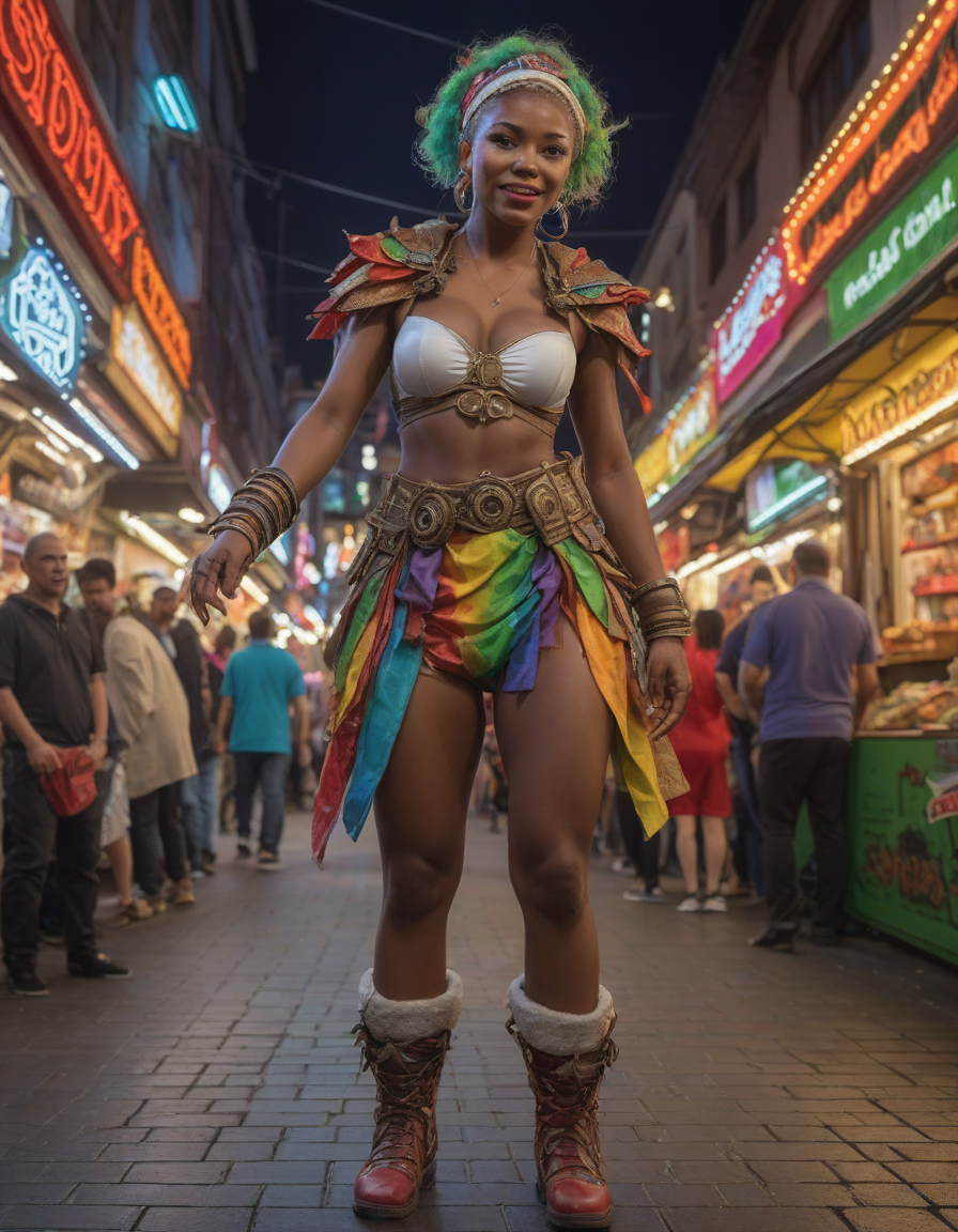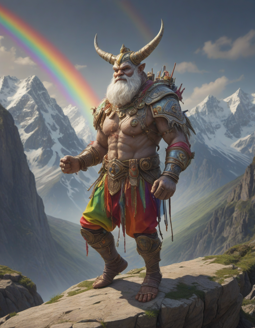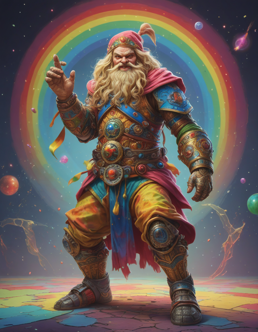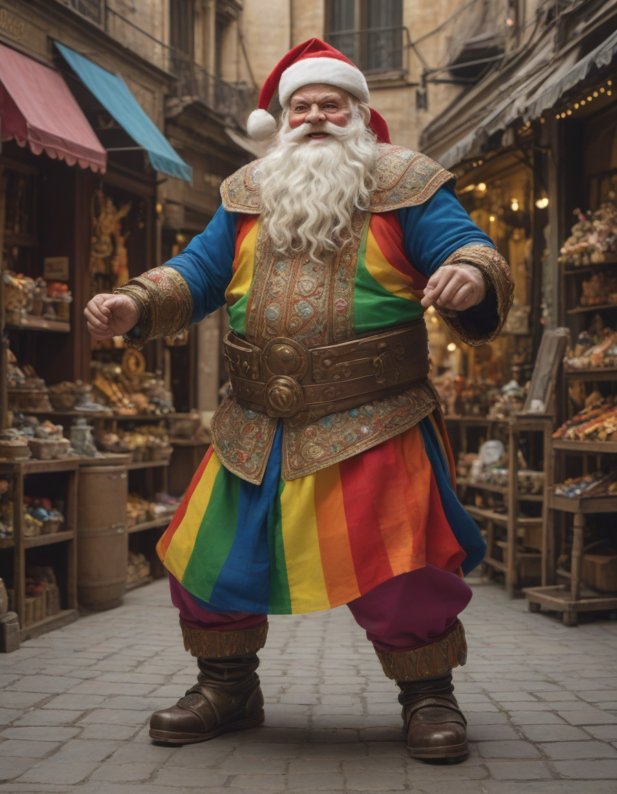 Rainbow-colored splotches, ogre, robot santa claus, Swift, agile movements of a dancer in perfect harmony, illuminated
