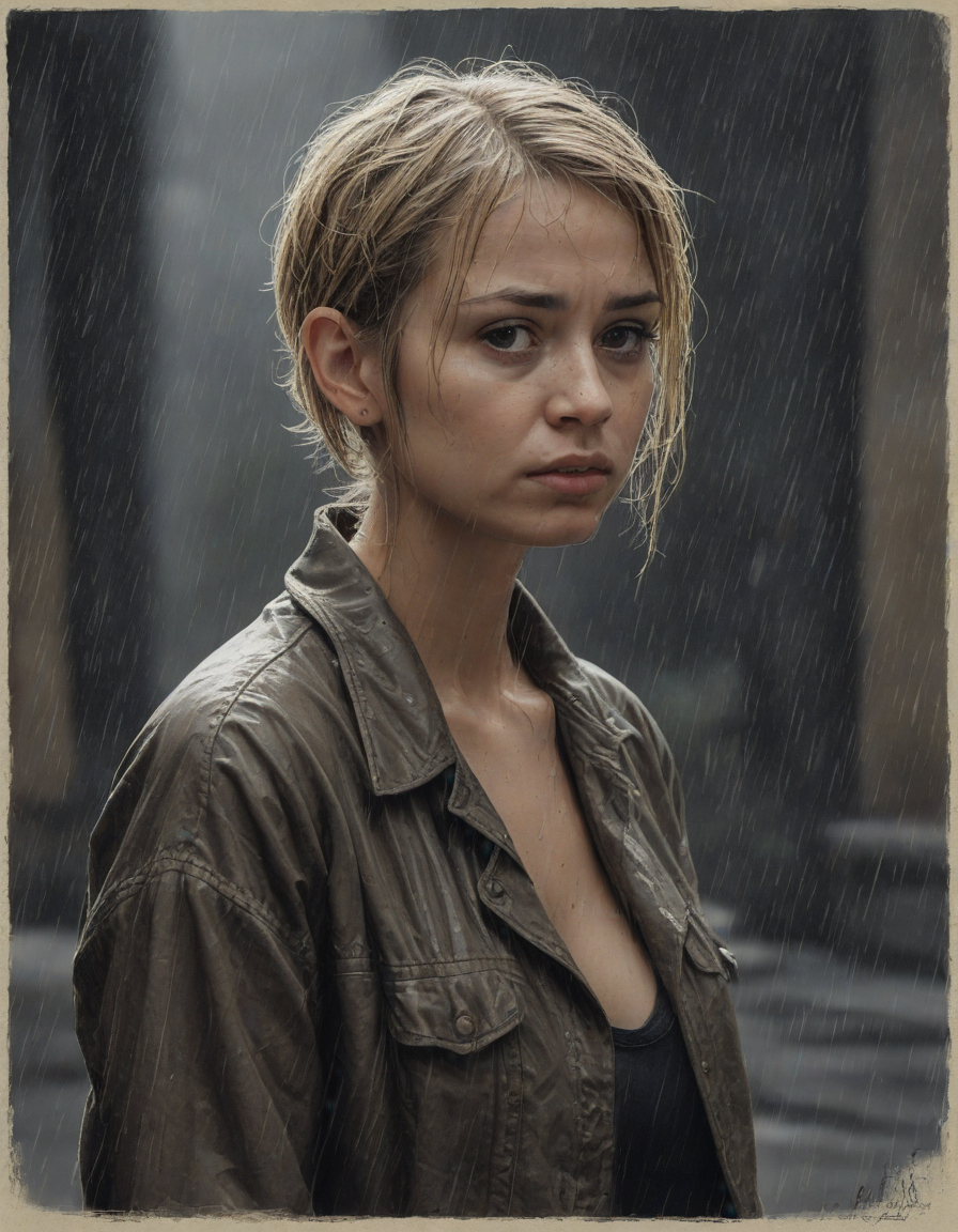 Nervous meeting, soggy, charcoal sketches on textured paper, Glistening in moonlight, scowling, raining, sipping coffee