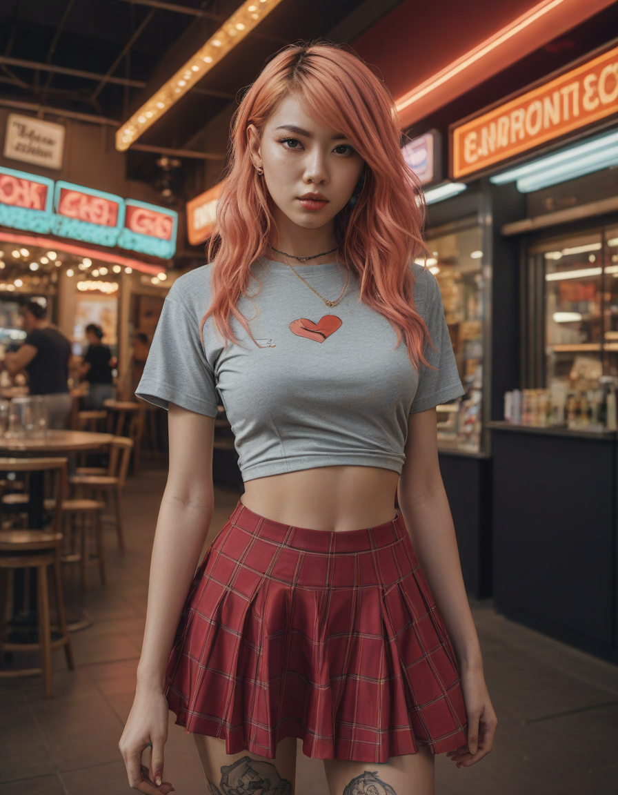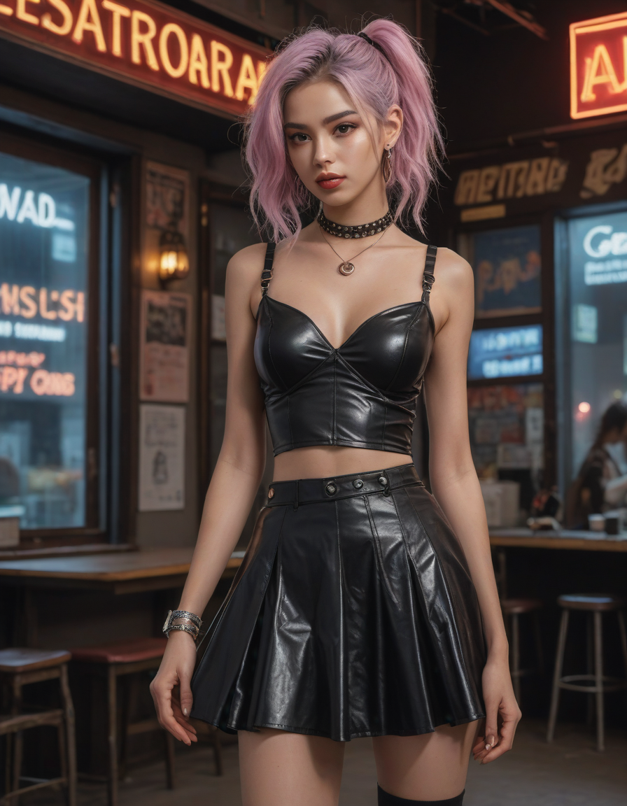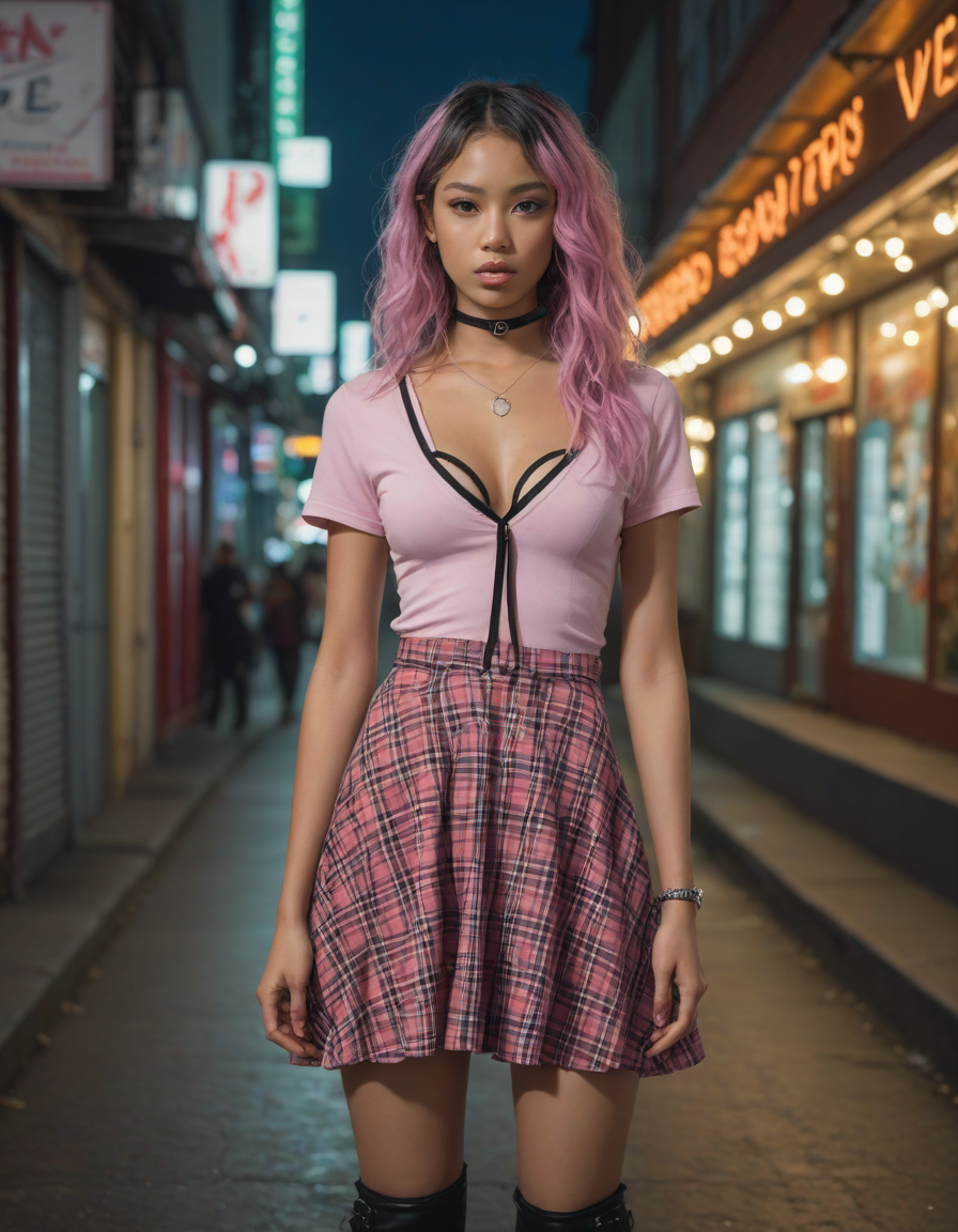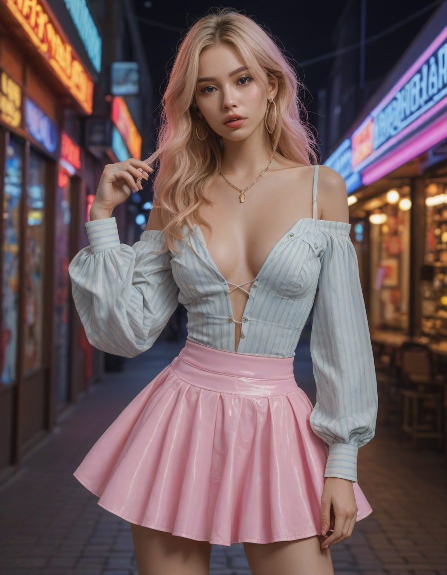 elegant, high waist tight overknee stiletto boots, Wide Skirt, wide ballgown hem, a line skirt, petticoat skirt, , Visualize a photorealistic portrayal of an 18-year-old high school senior girl, epitomizing the e-girl aesthetic with a blend of internet culture's vibrancy and personal audacity. Clad in an oversized striped shirt under a black graphic t-shirt dress, her style is a testament to e-girl fashion's layered intricacy, complemented by fishnet tights and chunky boots. Her makeup features dramatic winged eyeliner, neon eyeshadow, and dark lipstick, with blush bringing her face to life. Accessories like silver chains and a heart pendant choker, along with pastel or neon hair streaks, enhance her playful rebellion. Standing hands-on-hips, she exudes confidence and individuality against a backdrop suggestive of e-girl life, with neon signs and string lights. This scene captures her bold identity and expressive spirit at this pivotal moment., excessive cleavage, low neckline, revealing chest, revealing cleavage, cleavage-baring, revealing, excessively revealing, very revealing, lowcut, lowrise,