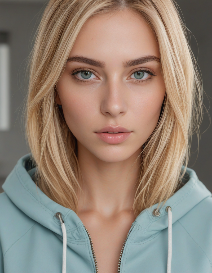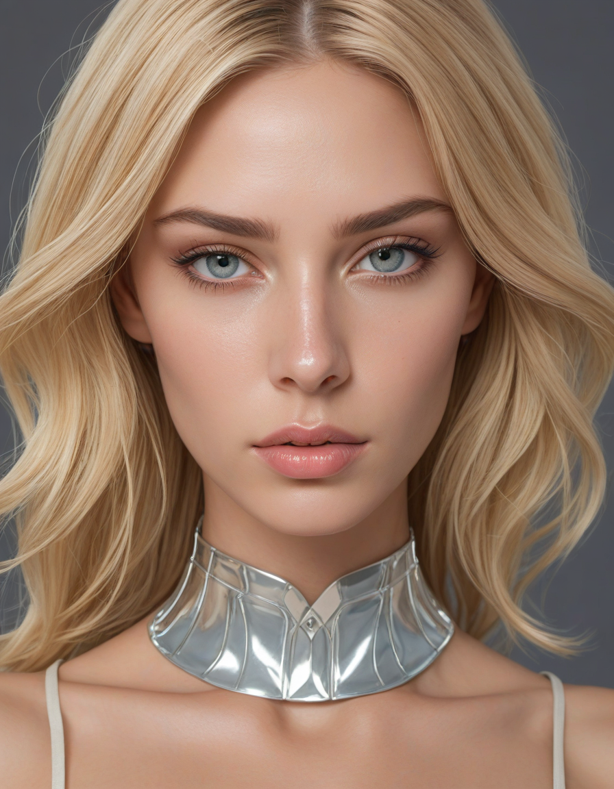 action, tall woman, (ab lines:1.5),raytracing,Oiled skin,Glistening skin,Oiled skin,reflective skin,Glossy skin,metal skin,metallic luster,Oiled clothes,skin tight,covered nipples,covered nave, oval face shape, almond-shaped eyes, voluminous lashes, slightly arched eyebrows, narrow nasal bridge, rounded nose tip, symmetrical nostrils, full lips, pronounced cupid's bow, slightly fuller lower lip, defined cheekbones, rounded chin, smooth complexion, softly contoured jawline, balanced facial proportions, symmetrical features, gently curved eyelids, soft brow ridge, harmonious cheek to jawline transition, subtle philtrum, delicate ear lobes, straight blonde hair, clear skin, hooded eyelids, light pink lip color, slightly pouty expression, casual pose with hand on face, slight head tilt, indoor lighting, Light blue irises, Medium-thickness eyebrows, Softly angled eyebrows, A hint of freckles across the nose and cheeks, Natural makeup, Gentle frown lines between the eyebrows, Soft nasolabial folds, Smooth forehead, Subtle dimple on the chin, Clear facial contour without distinct shadows, Even skin tone with a hint of natural pink undertones, Slightly rosy cheeks, Tapered jawline, Fine hair texture with gentle waves, Youthful appearance with soft facial features