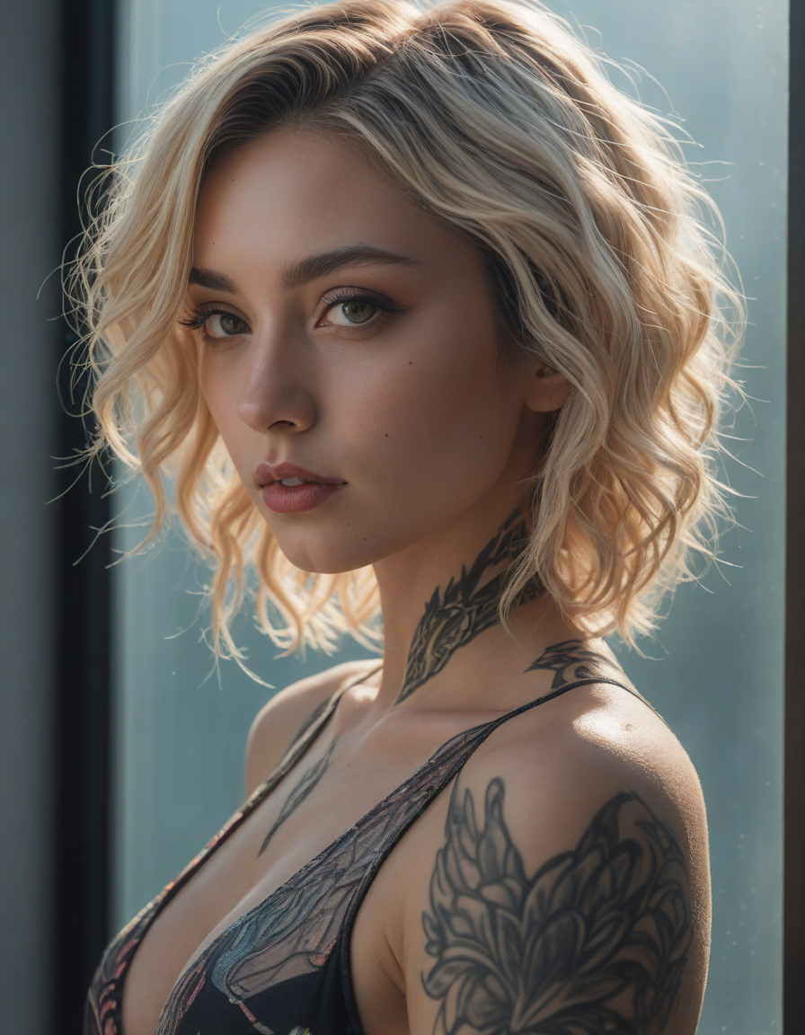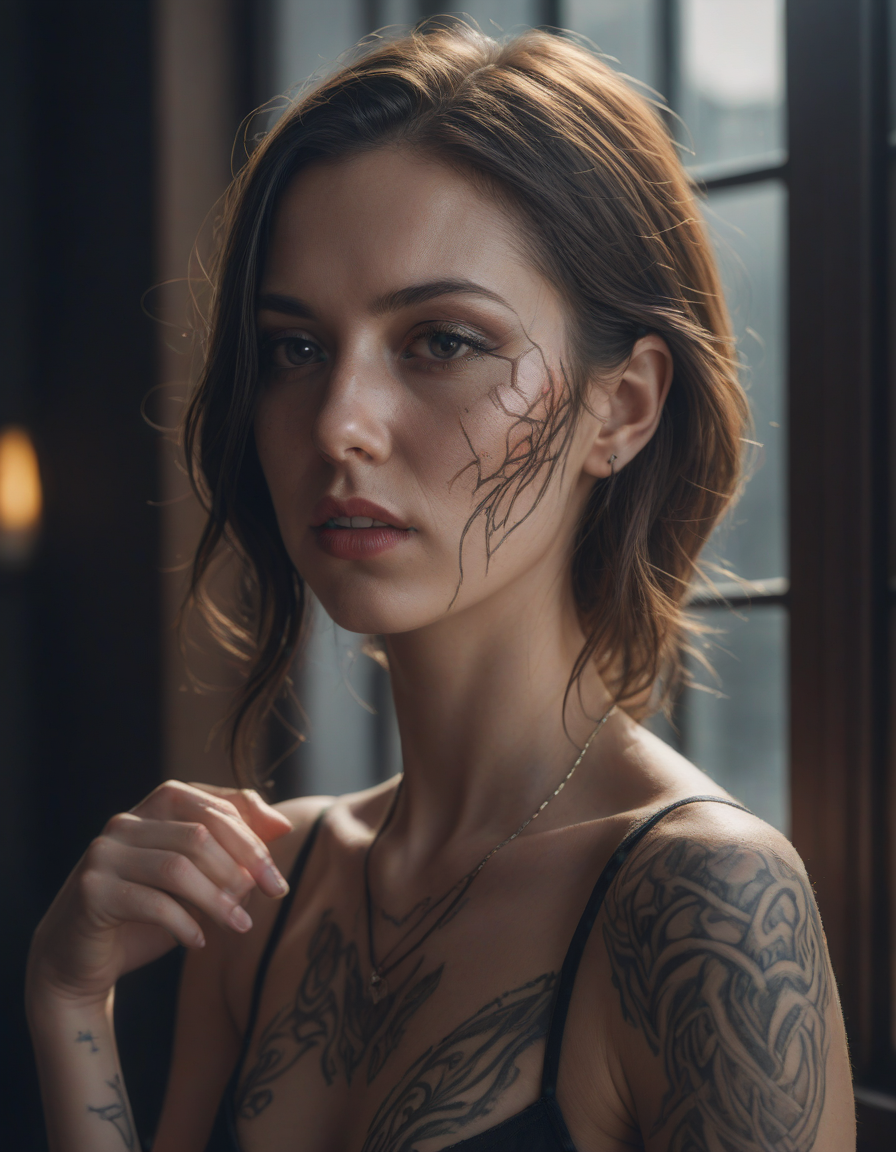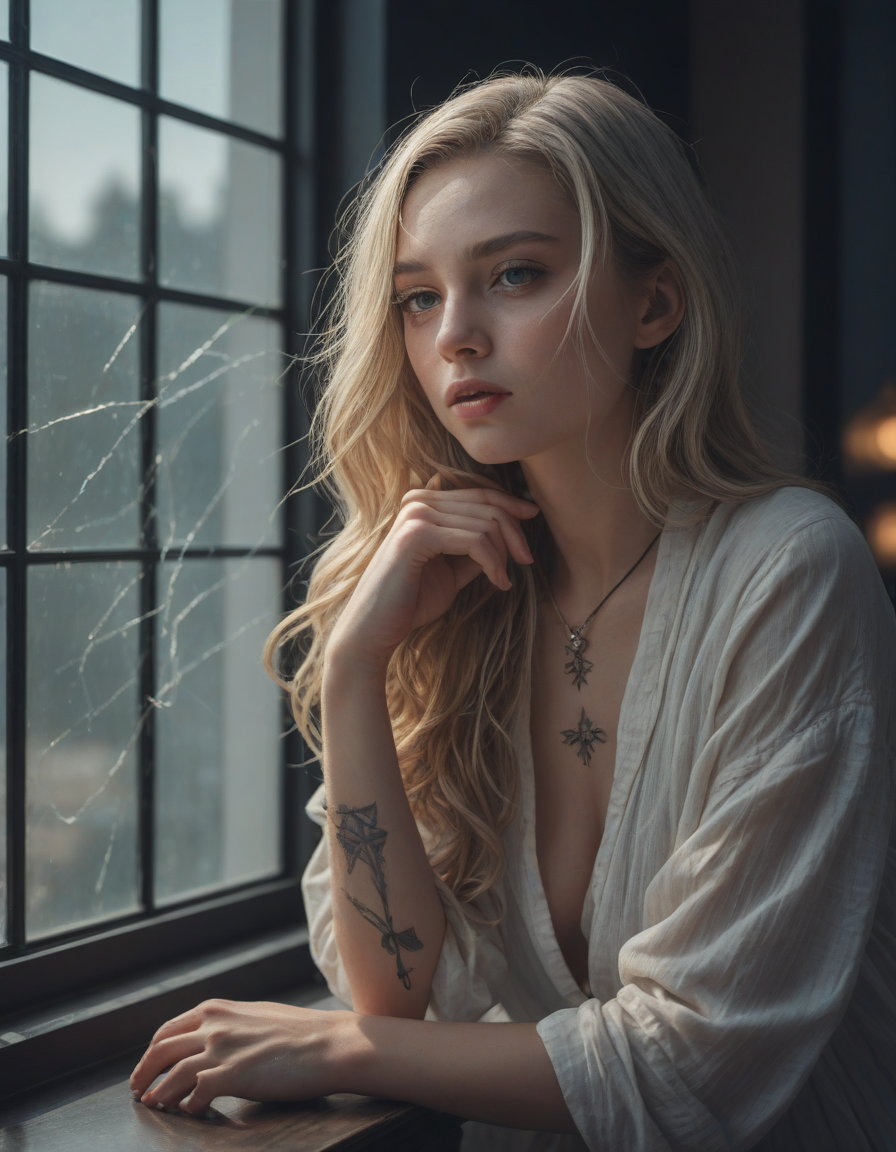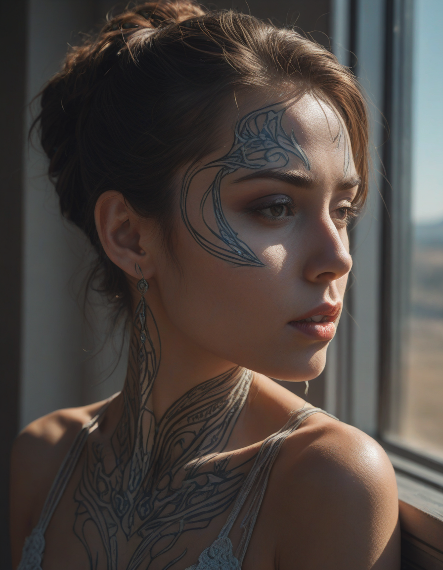 vampire, face tattoo, appalled, mesmerized by beauty, Tron-like, sparkling, Embarrassment, immortal longing, Leaning on window sill, color grading, Blinding sunlight, Shattered glass reflecting vibrant hues, dances in an ethereal swirl