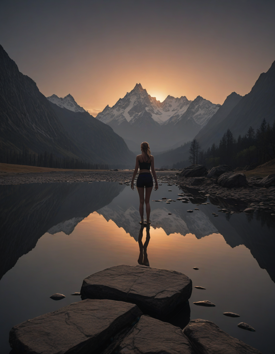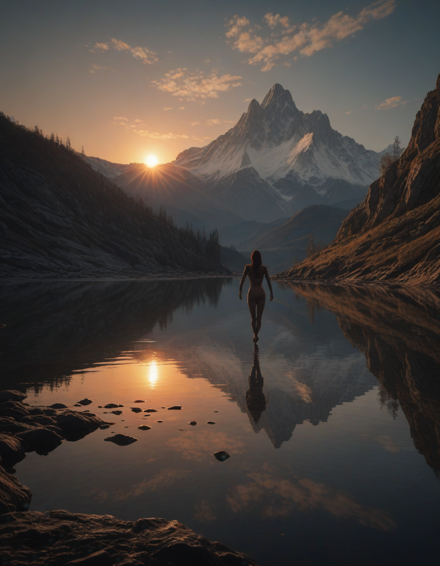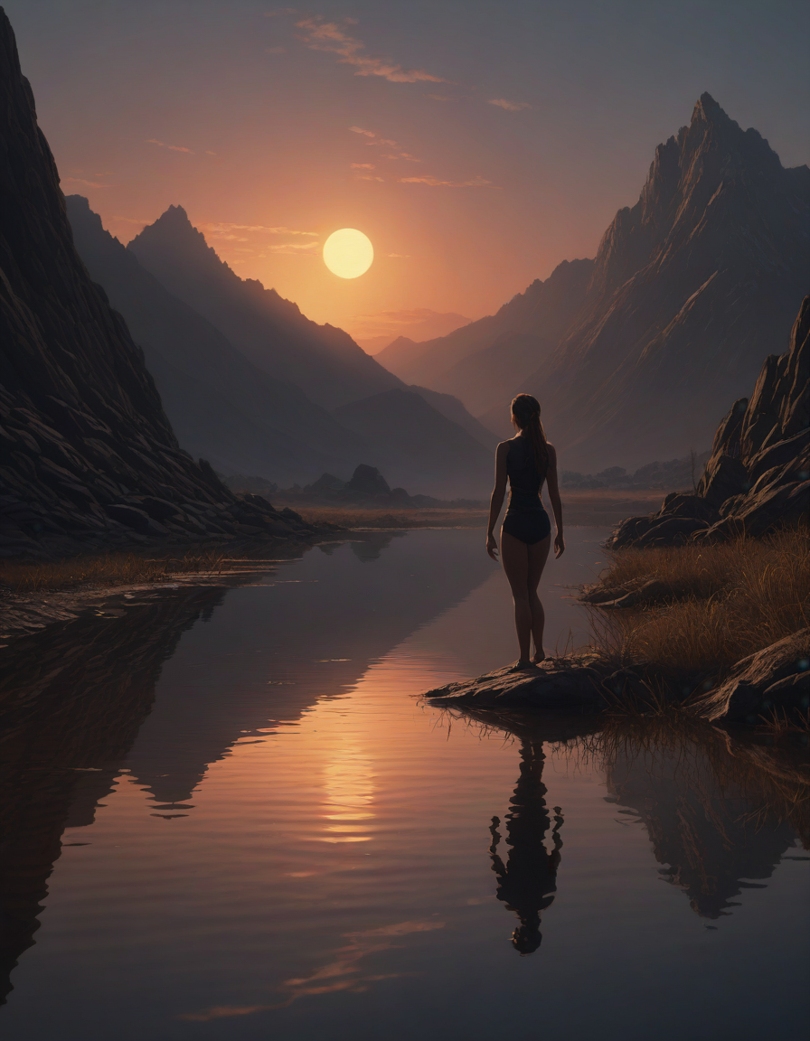 Distant mountain landscape, Unsettling reflection in dark still water, gymnast tumbling, outstretched hand, skyrim npc, heartbeat, glow, The fire flickering in the hearth, painting shadows upon the wall, Blinding sunrise