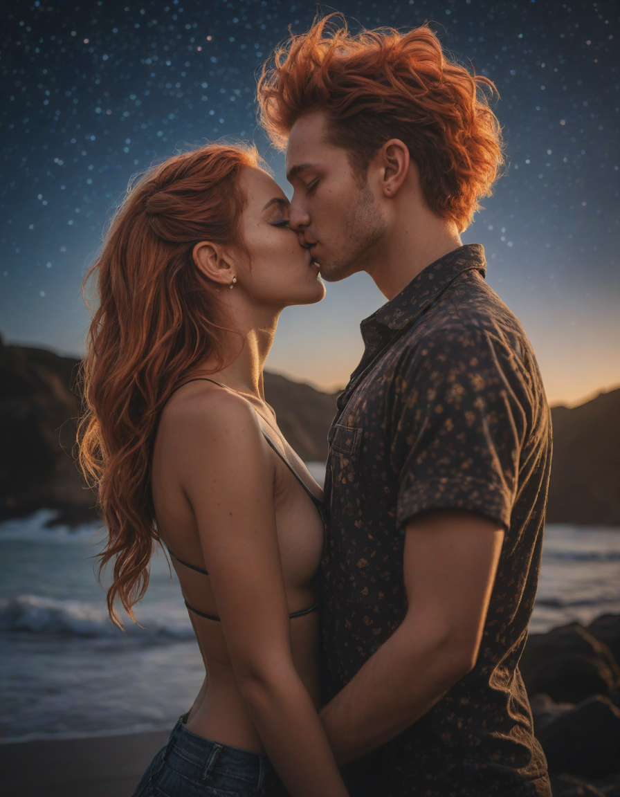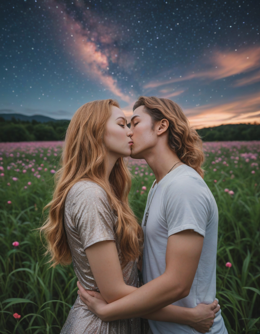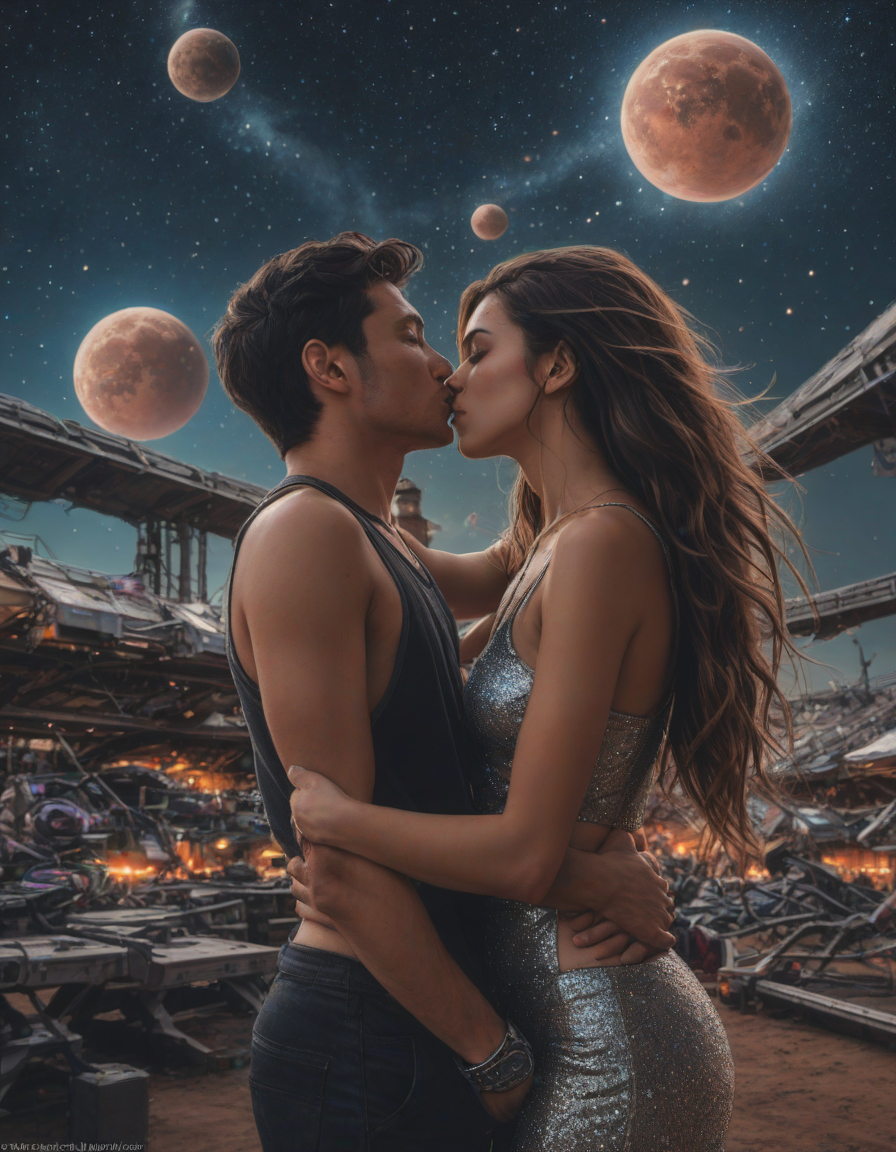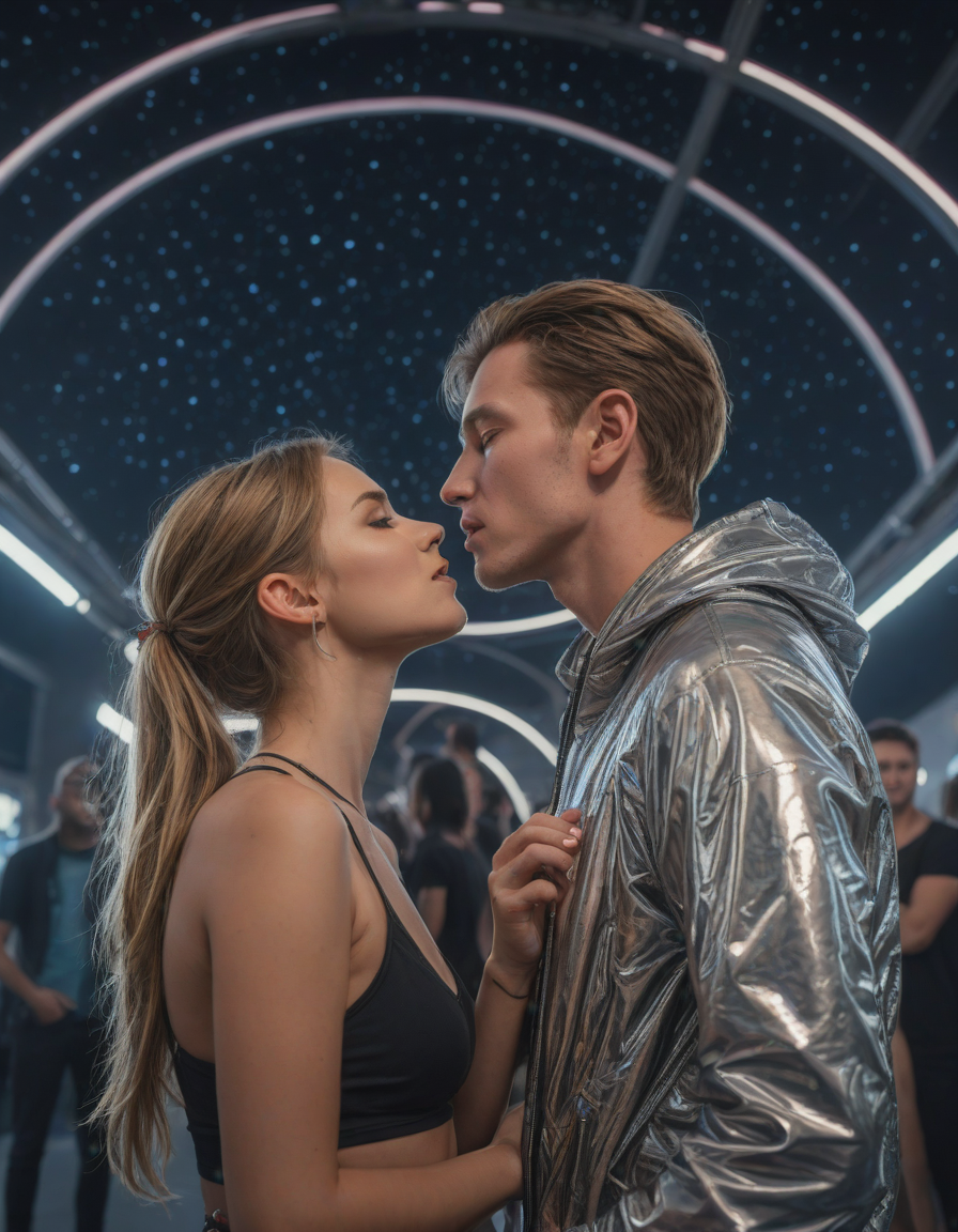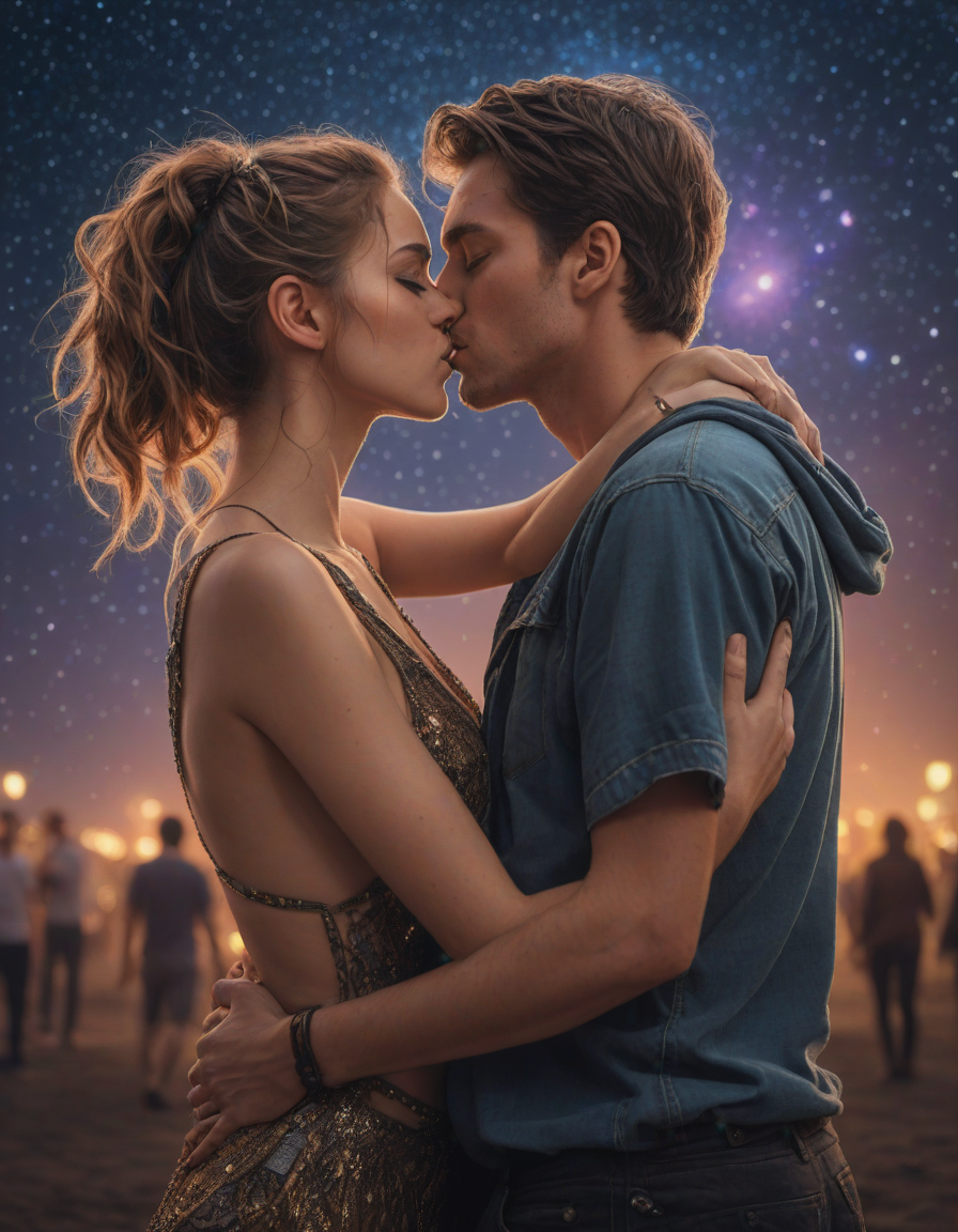 epic composition, glittering night sky, at a rave, kissing, squinting