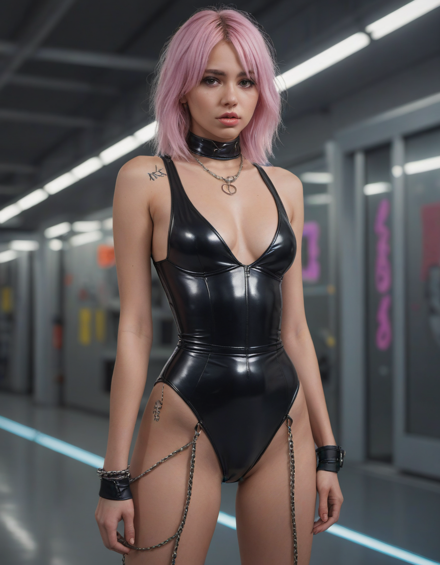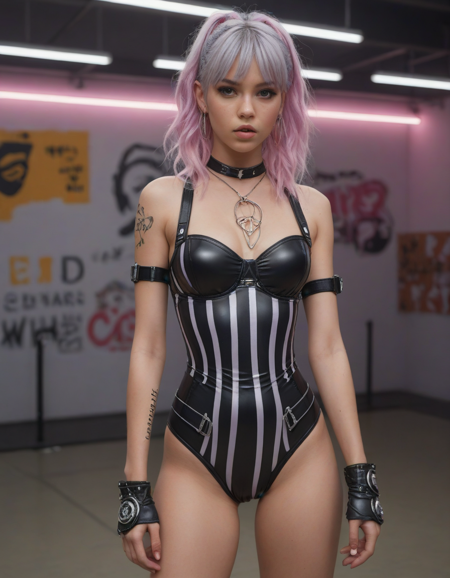 wearing sleeveless leotard, wearing one peice clothing, leotard, sleeveless, , Craft an ultra-realistic, photorealistic image of an 18-year-old high school senior girl, fully immersed in the e-girl aesthetic, standing alone yet commanding the scene with an unspoken power. Her voluptuous figure is showcased through the definitive e-girl style, blending internet culture's flair with a personal touch that's bold and unapologetic. Her attire consists of an oversized long-sleeve striped shirt beneath a black graphic t-shirt dress that contours gracefully, celebrating her curves against the backdrop of e-girl fashion's layered complexity. Fishnet tights underpin the ensemble, leading down to chunky black platform boots that ground her in strength and style.