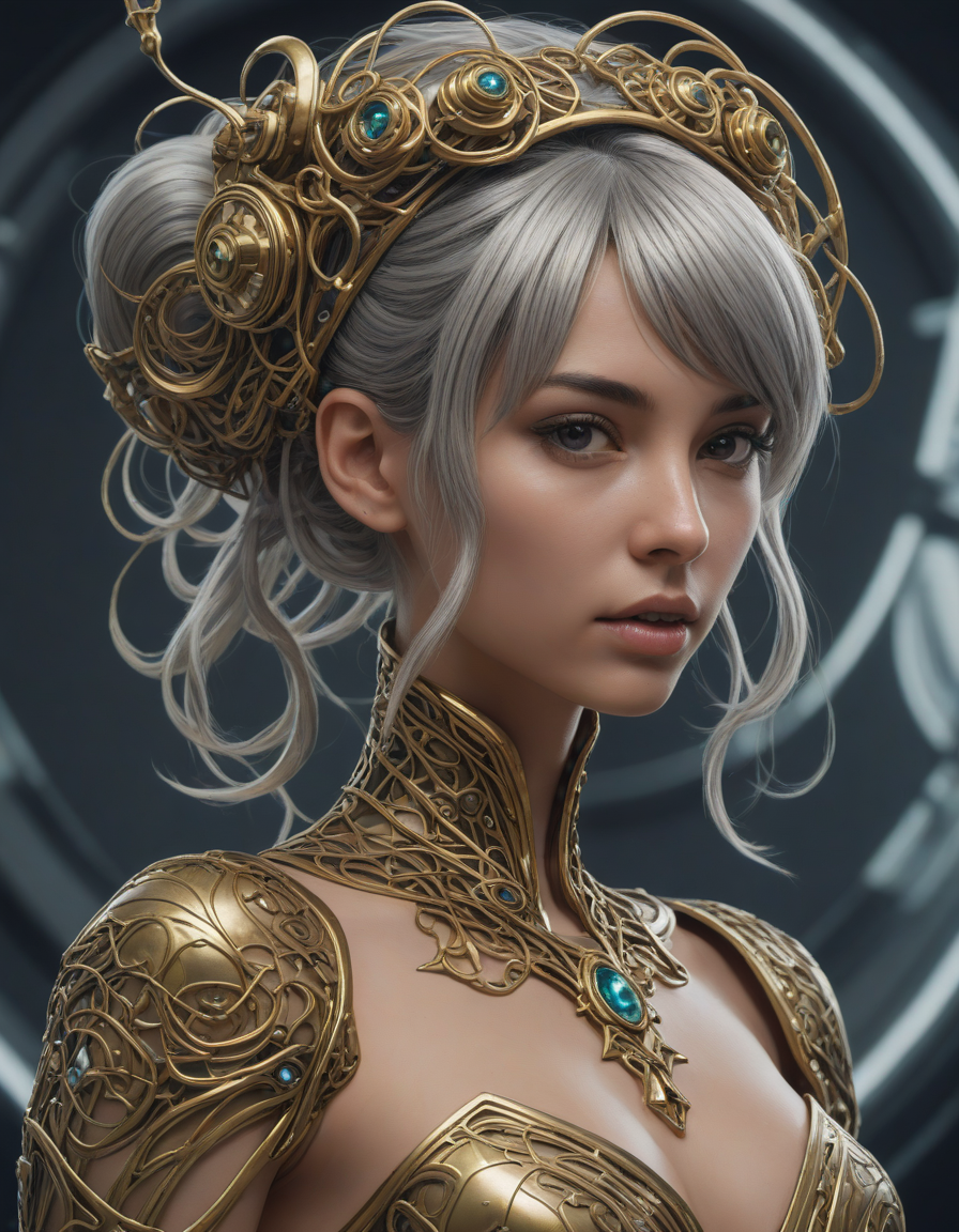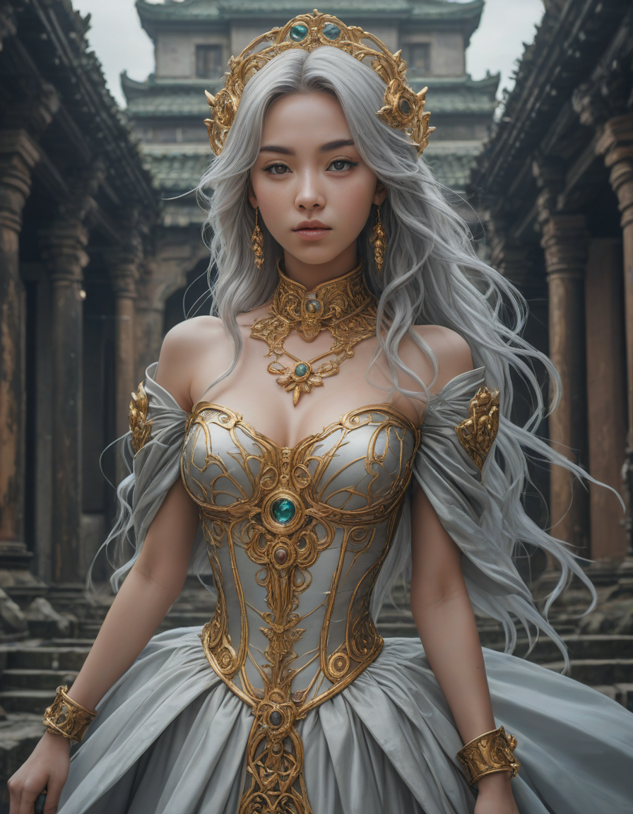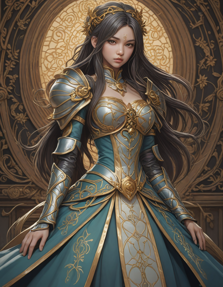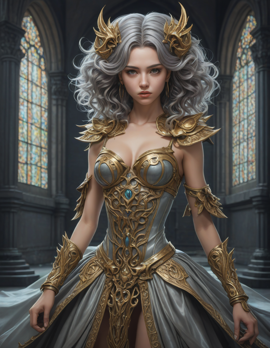 ornate, gold-trimmed ball gown, slick silver, sacred geometry, mesmerizing colors, apocalyptic, Mistletoe Mercenaries, Studio Ghibli style, ferocious dragon, lustrous hair